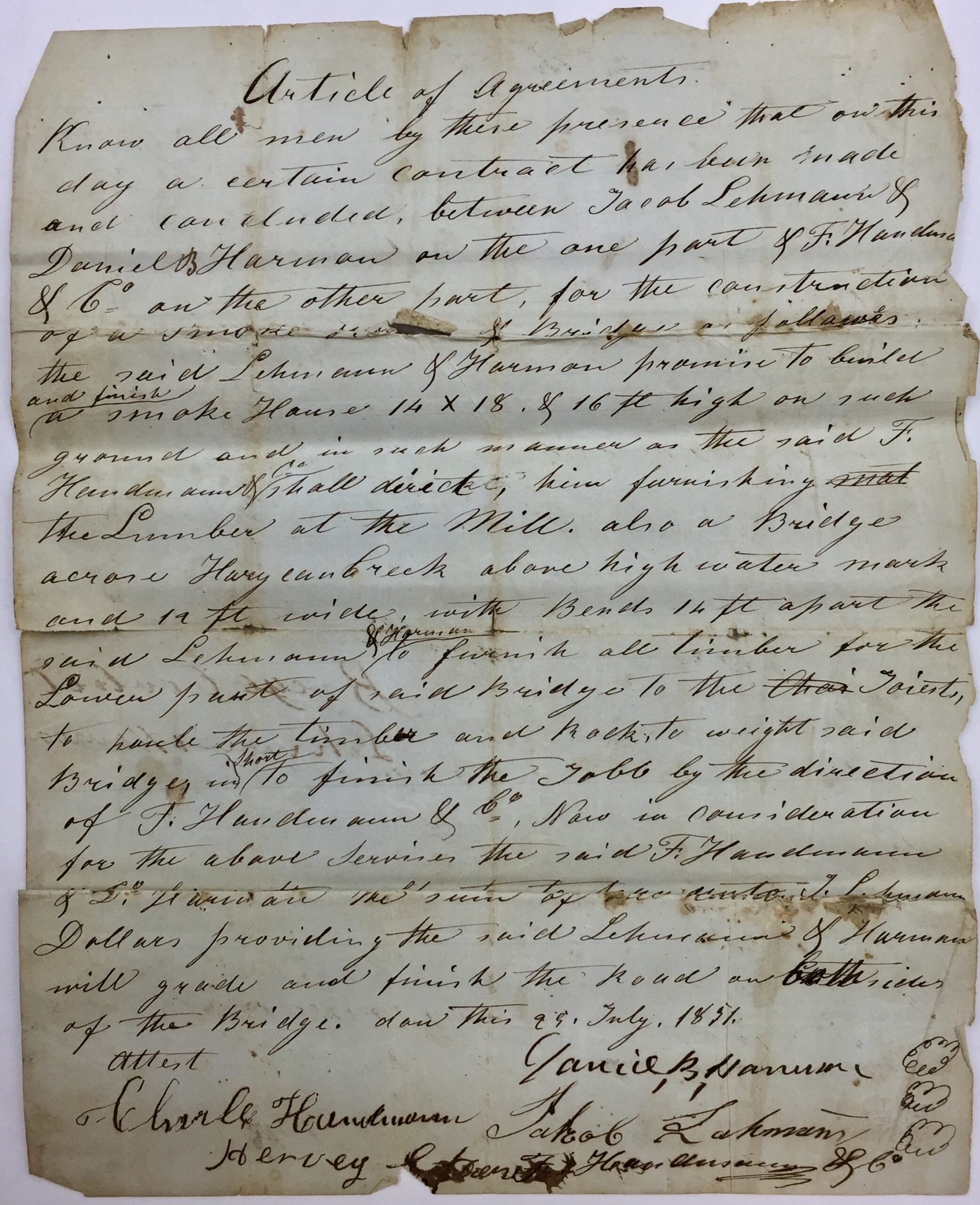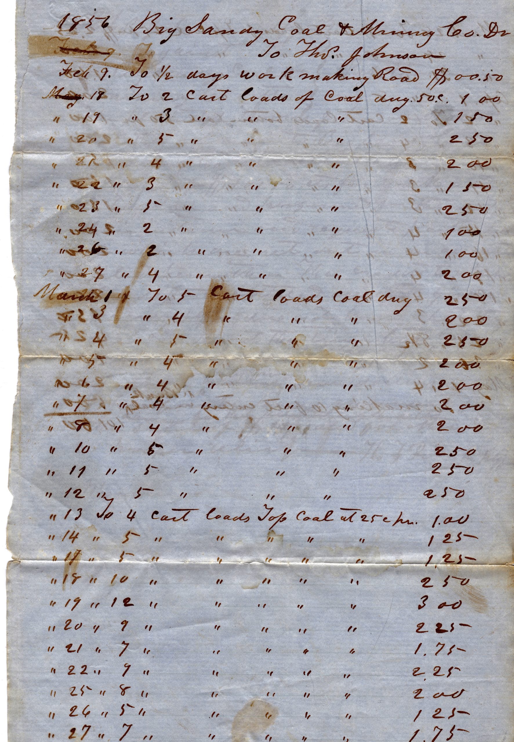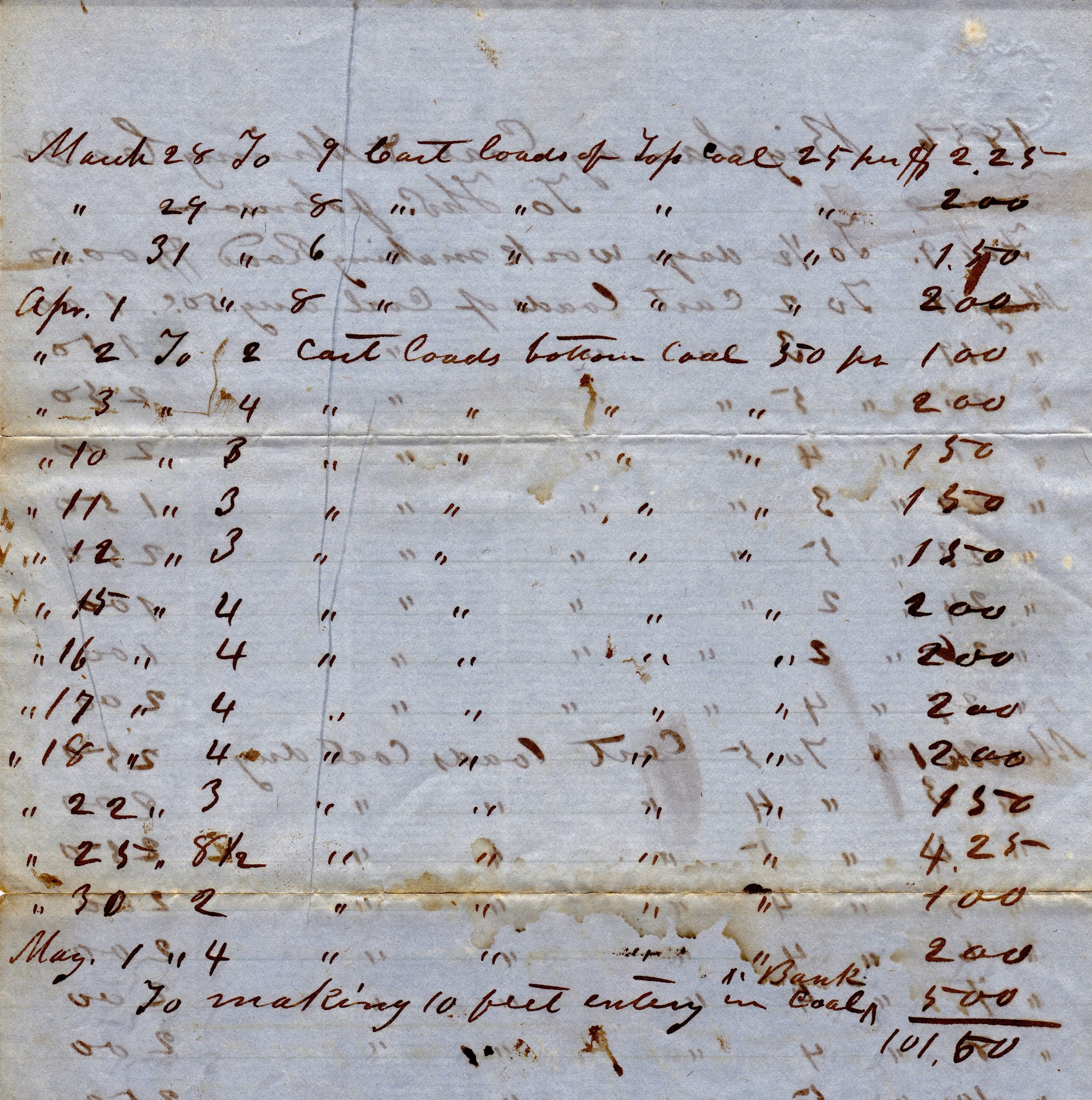 The two invoices above show that Thomas Johnson, from February 9, 1856, until May 1,1856, loaded and hauled 196.5 cart loads of coal at the rate of 50 cents per cart. For every 10-foot entry in bank coal, he was paid $5.00.