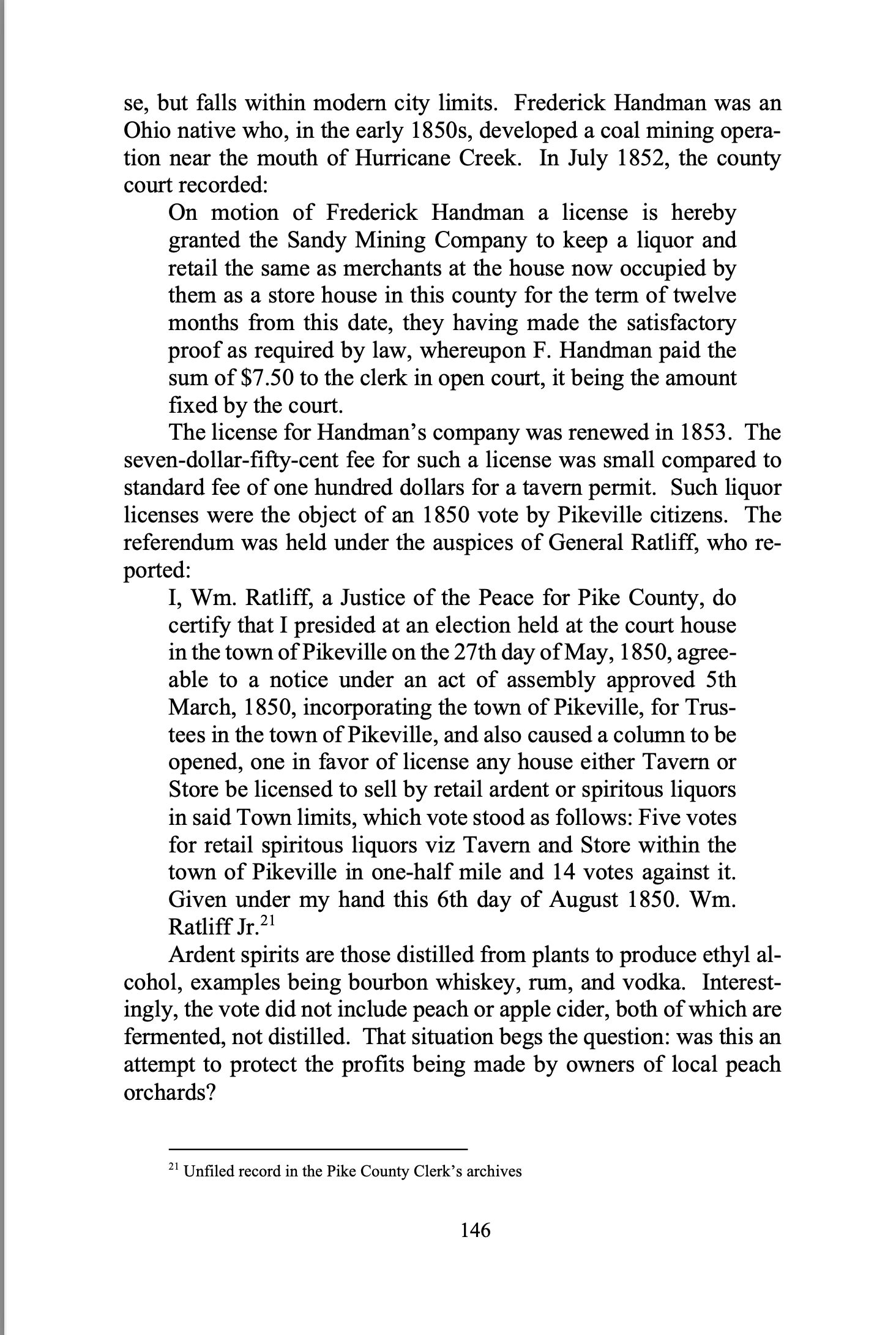 Additionally, Pike County records indicate that William Weddington maintained a coal bank on his property prior to Frederick Handman’s visit, which occurred before 1849. This historical note underscores the long-standing presence and significance of coal mining activity in the region, predating some of the more formalized mining operations that followed forty years later.