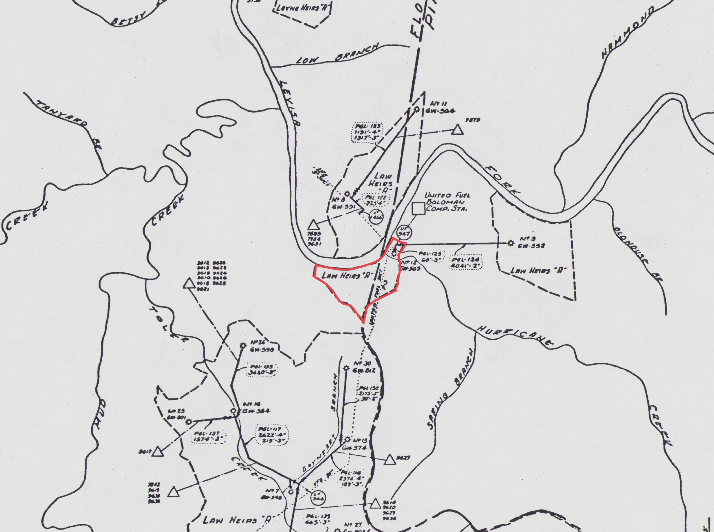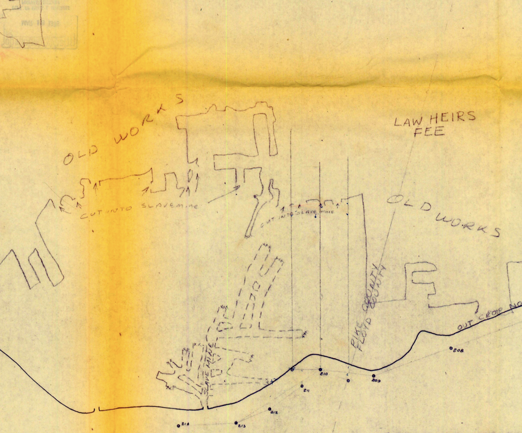 It was also written by Henry Scalf that Laws would later take legal possession of the Big Sandy Coal and Mining Co. and their reserves, several years after bonds failed to pay off. The suit was finally settled July 7, 1900. Red exhibit shows the projected area of the mining operation in the late 1850’s.