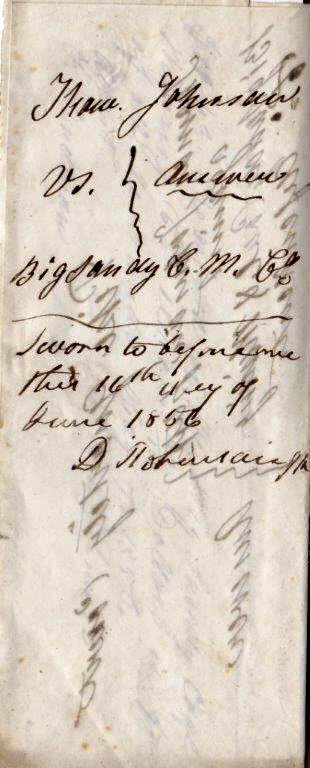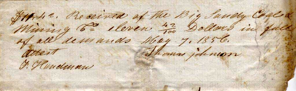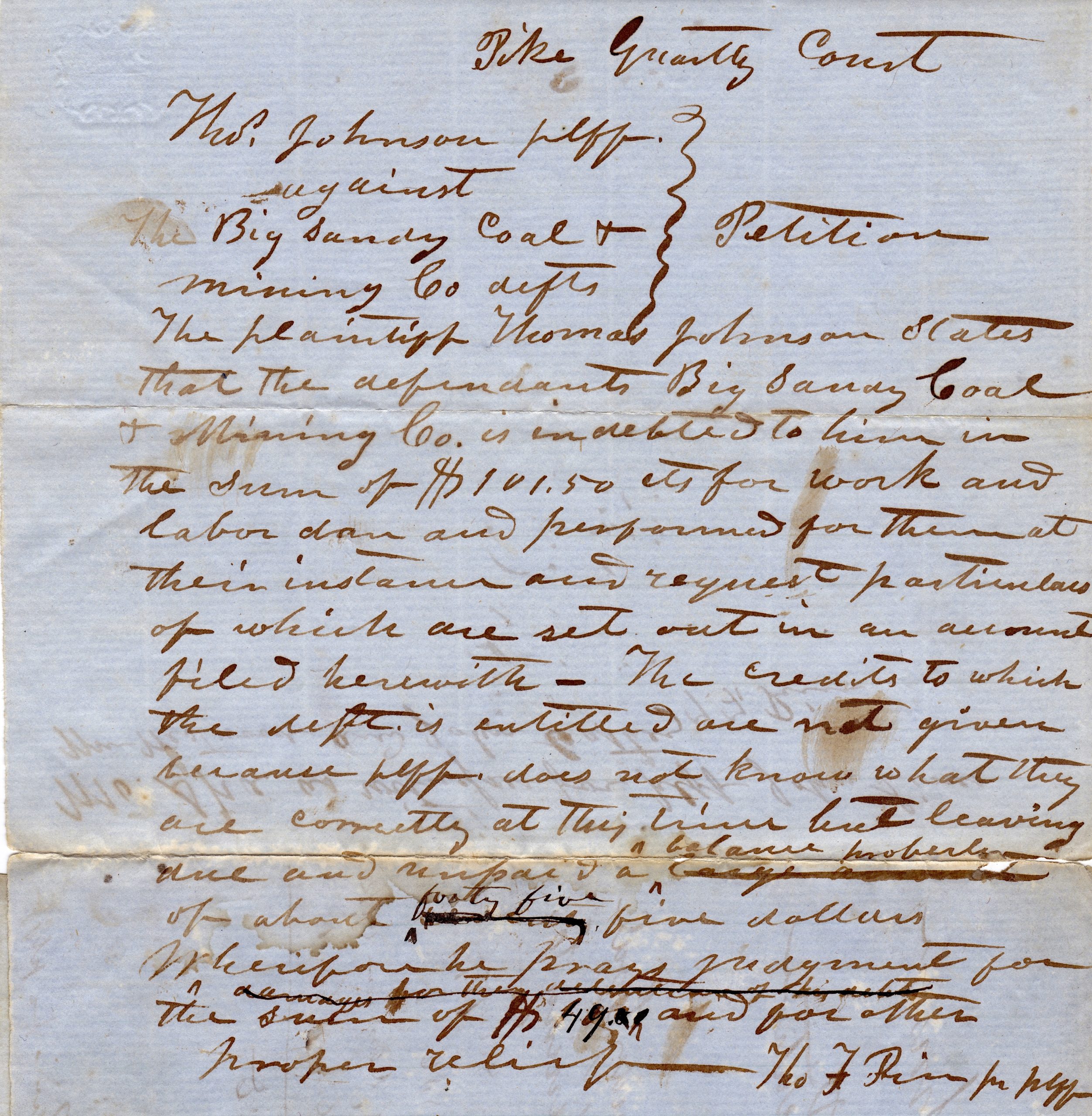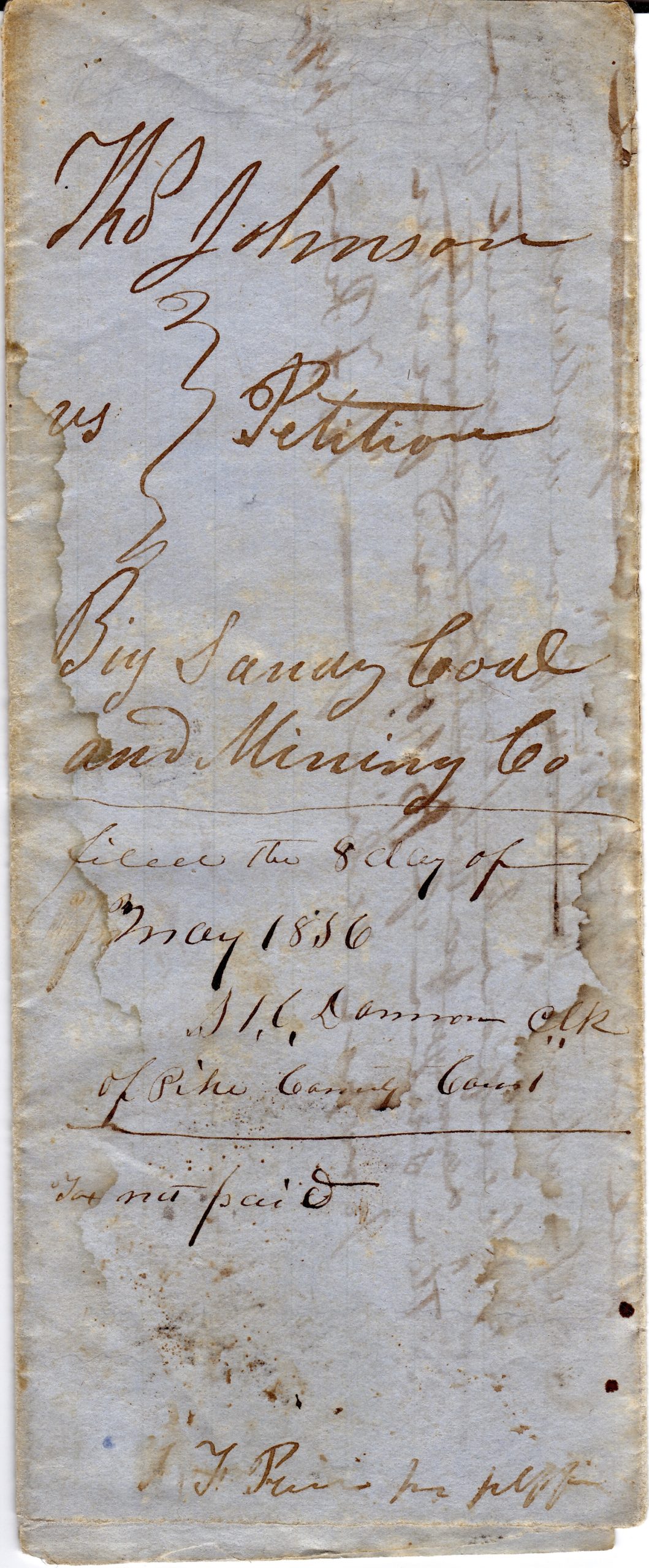 Quite often simple human greed took the reins and lawsuits were in order. Below are several pages of a suit filed May 8, 1856, by Thomas Johnson, a “coal digger” of the time. Johnson claimed that Big Sandy Coal and Mining Company owed him for services he had performed. We have no way of knowing whether Johnson was entitled to the money he claimed, or if company management simply tried to gain by wearing down both his finances and his will to stay the course. The mine was located on Hurricane Creek near the line between Pike and Floyd counties. Johnson was ultimately paid a fraction of his claim.