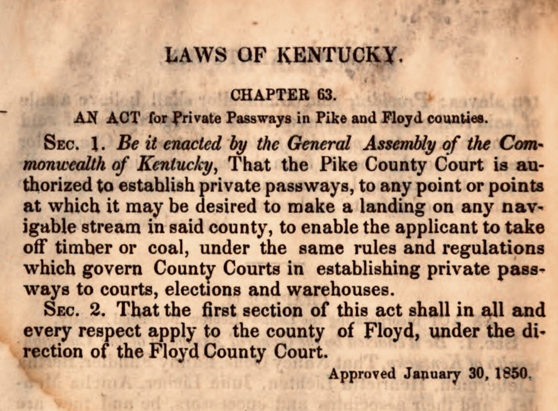 In order to ship coal or timber on any waterway in the State of Kentucky, you first had to get approval from the General Assembly of the Commonwealth of Kentucky. Most of the Big Sandy River had already been approved for navigation from its water ways, but an Act was needed “to establish private passways to any point or points at which it may be desired to make a landing on any navigable stream in said county, to enable the applicant to take off timber or coal, under the same rules and regulations which govern County Courts in establishing private passways to courts, elections and warehouses.”