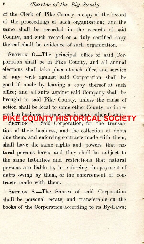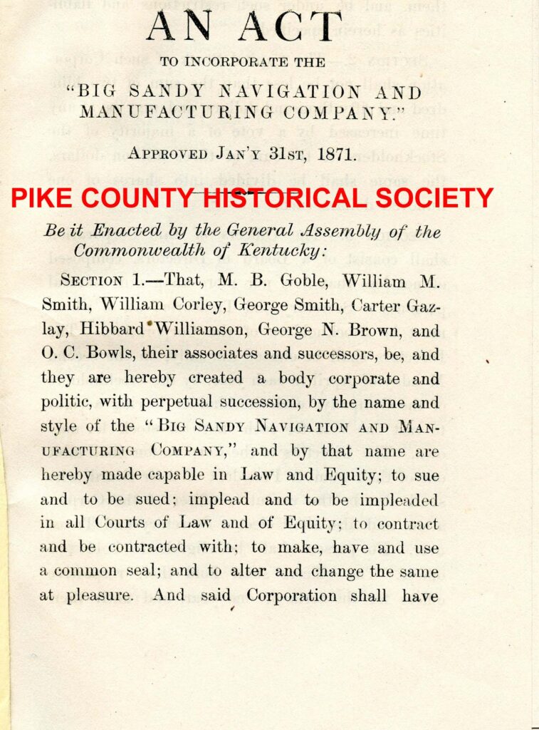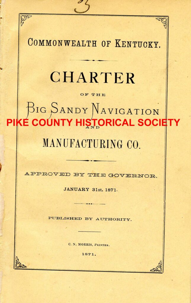 Before the Kentucky constitution of 1891, regulations on corporations were much more strict than today. Pre-1891 applications to form corporations were submitted to, voted upon, and approved by the legislature. The 1891 convention decided that process was too burdensome and time consuming for businesses seeking to incorporate and that the number of applications would be overwhelming for lawmakers in terms of the time required to introduce, debate, and approve. The Pike County Historical Society, LLC has been fortunate to find an original example of yet another 19th century corporate duty: a corporation’s charter was required to be printed and made available to the public in hard copy. The Charter of the Big Sandy Navigation and Manufacturing Co. contains some familiar names.