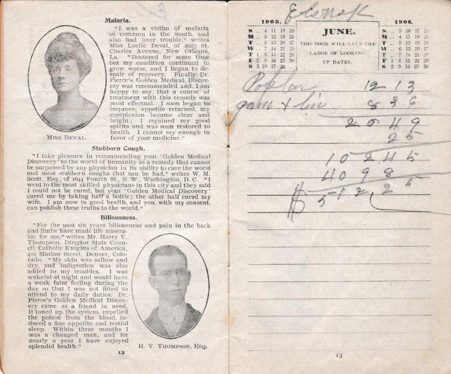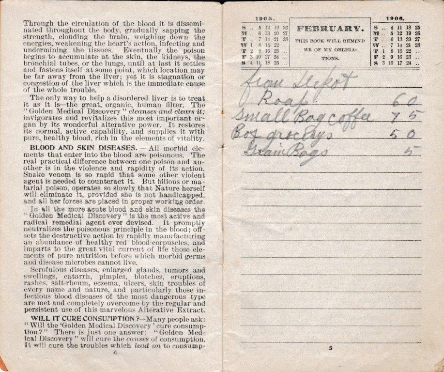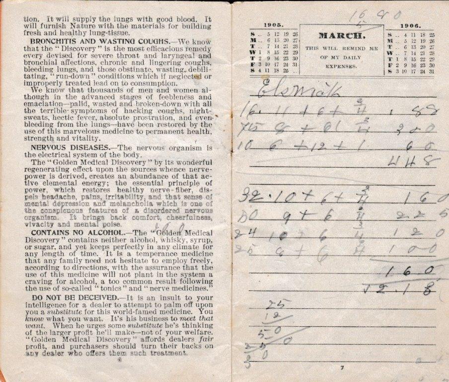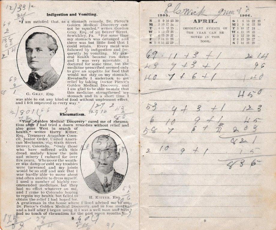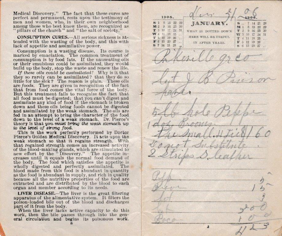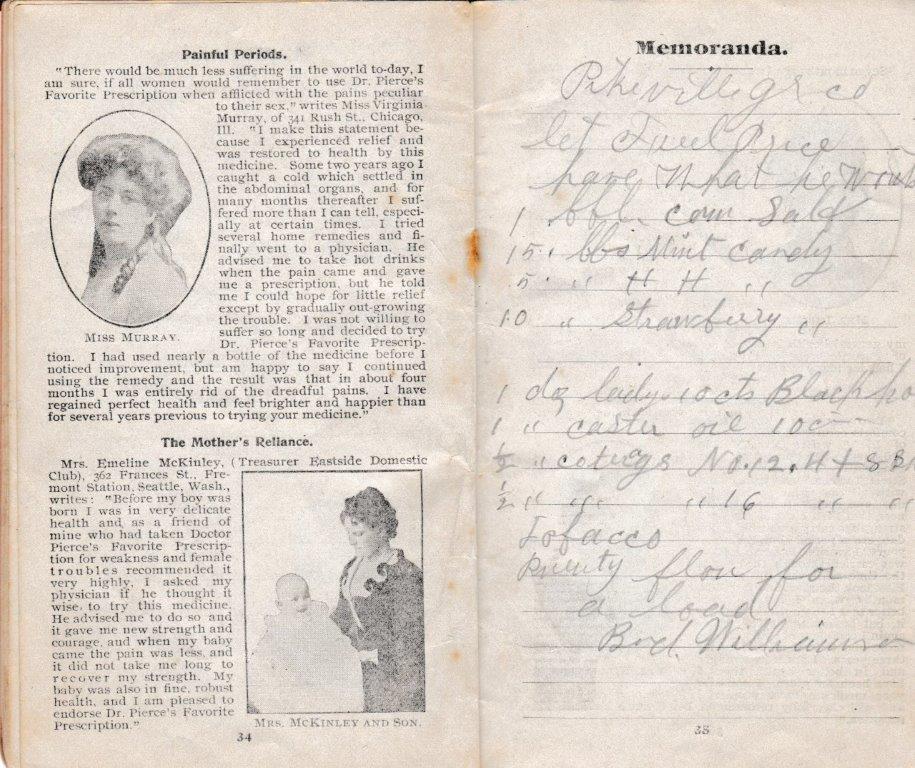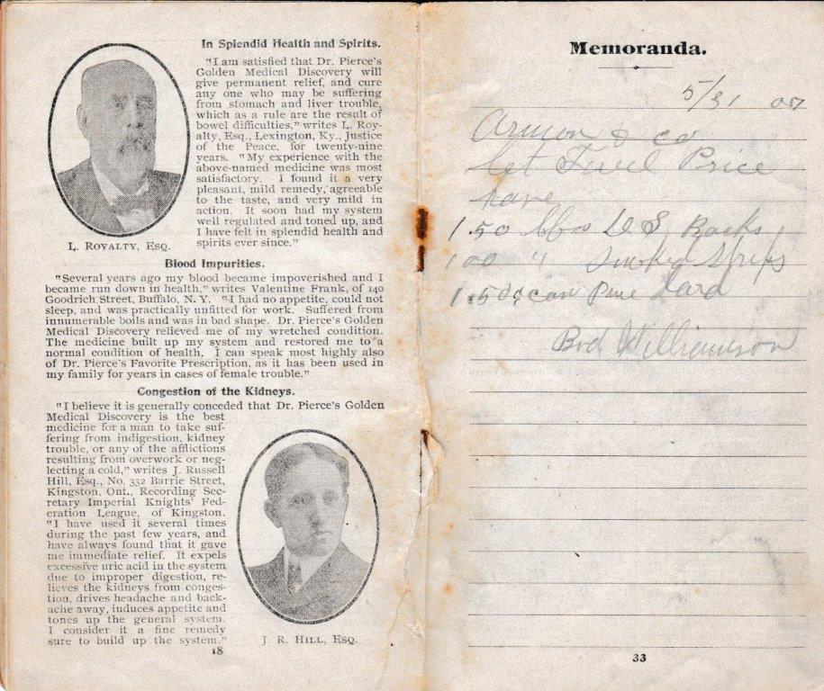 A 1905-memo book from Bud Williamson’s General Merchandise Store at Piso, Kentucky. The pencil notations tell us that not only was Williamson a dry goods merchant, but he also dabbled in the timber business. With no calculators or computers, a blank memo book from a vendor, a lead pencil, and a sharp storekeeper’s mind made for the height of accounting practice in many country stores of the day. (Courtesy of Anthony Hawkins)