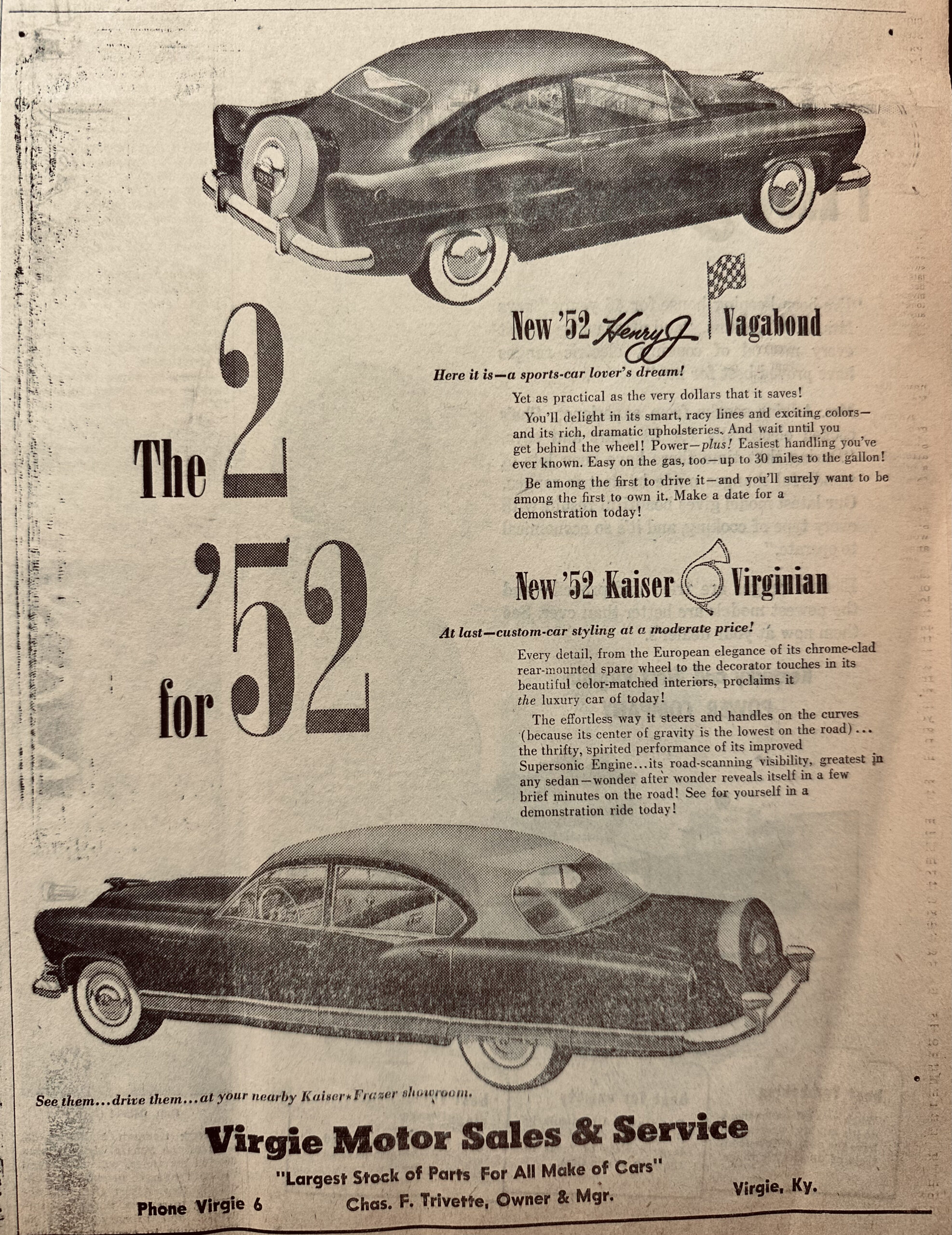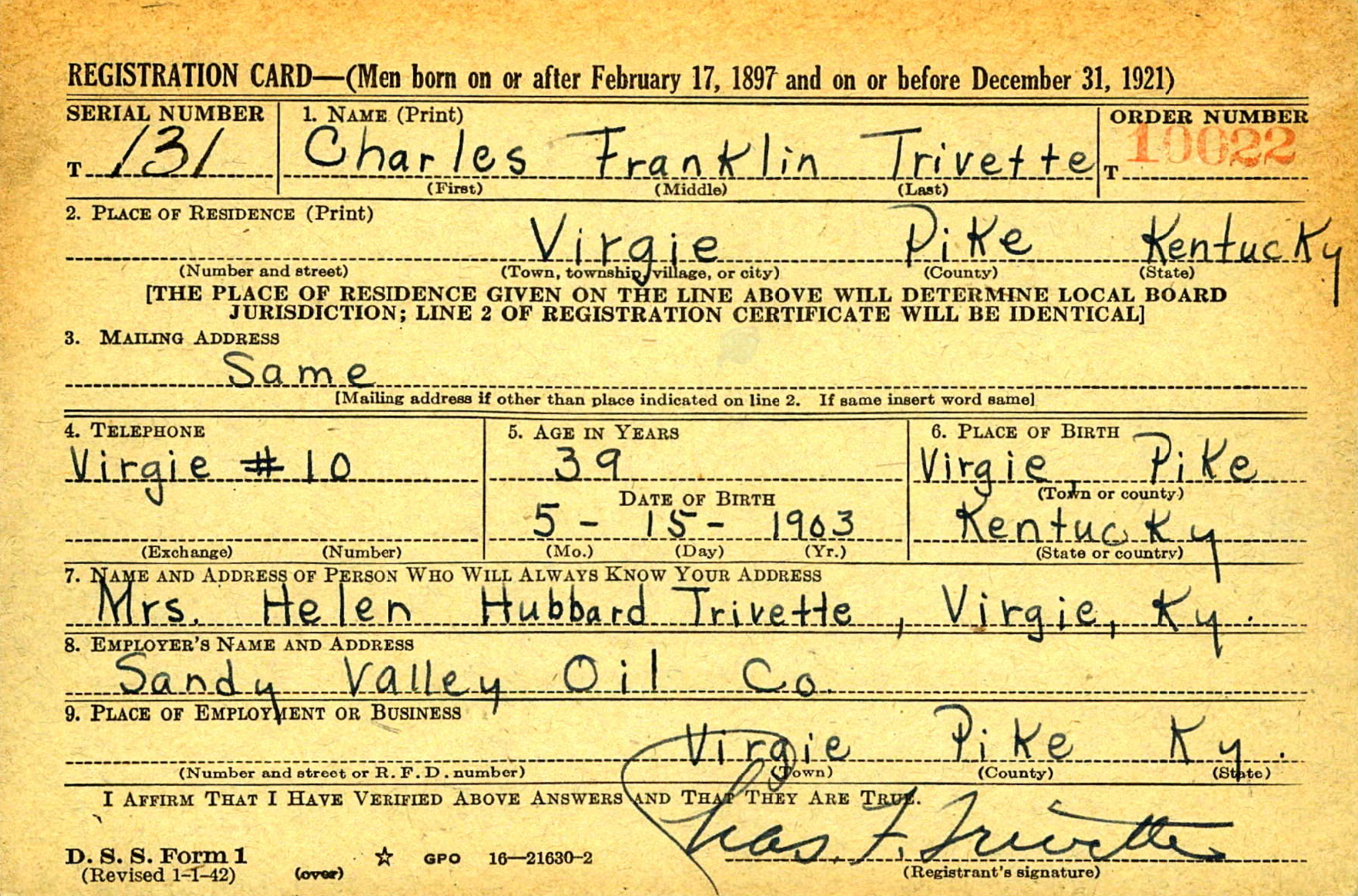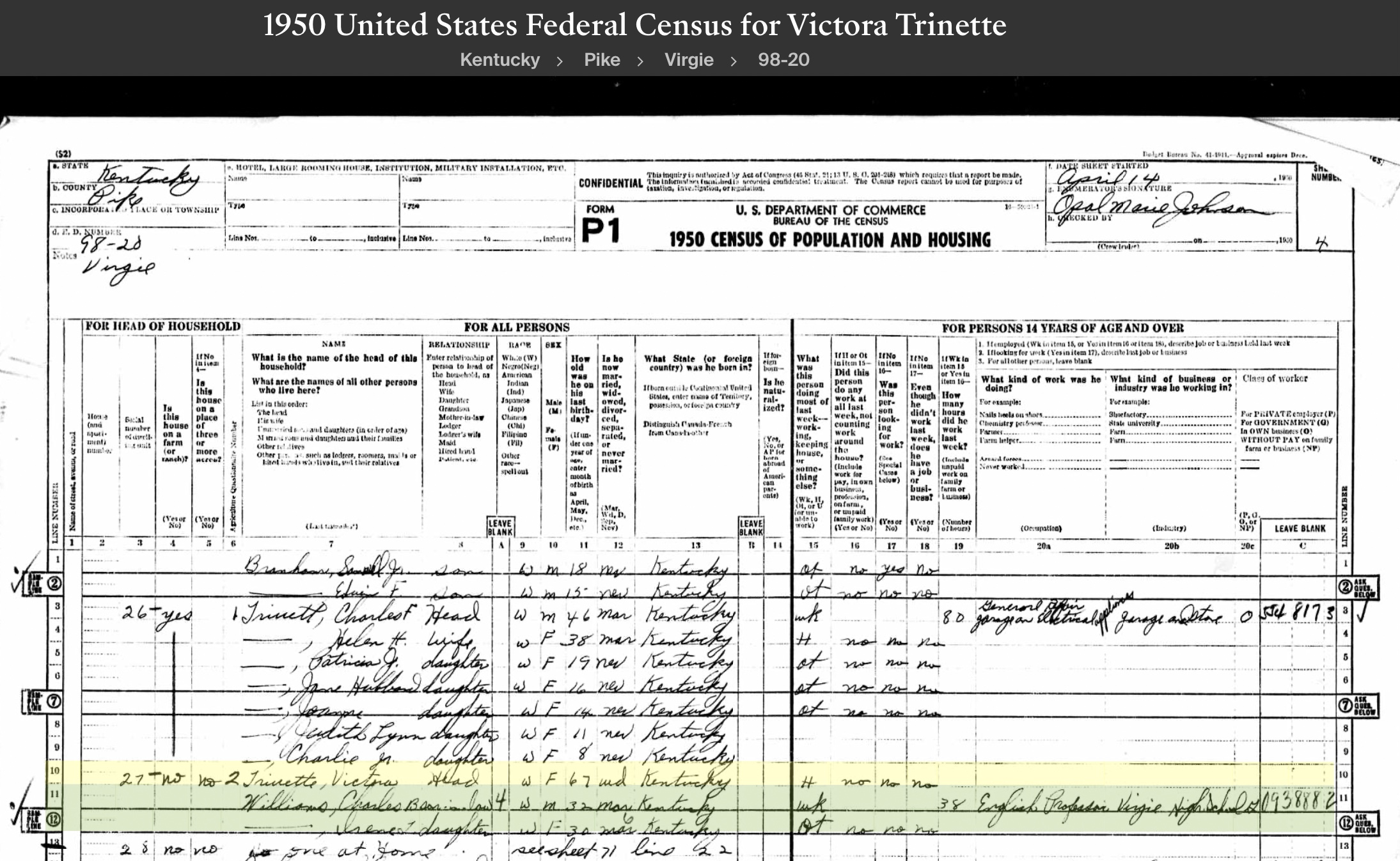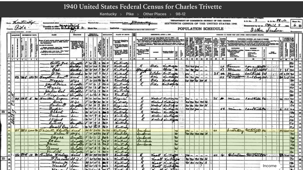 1950 Federal Census Charlie Trivette is living in Virgie, Kentucky with his family. Occupation General car repair, electrical appliances, garage and store.