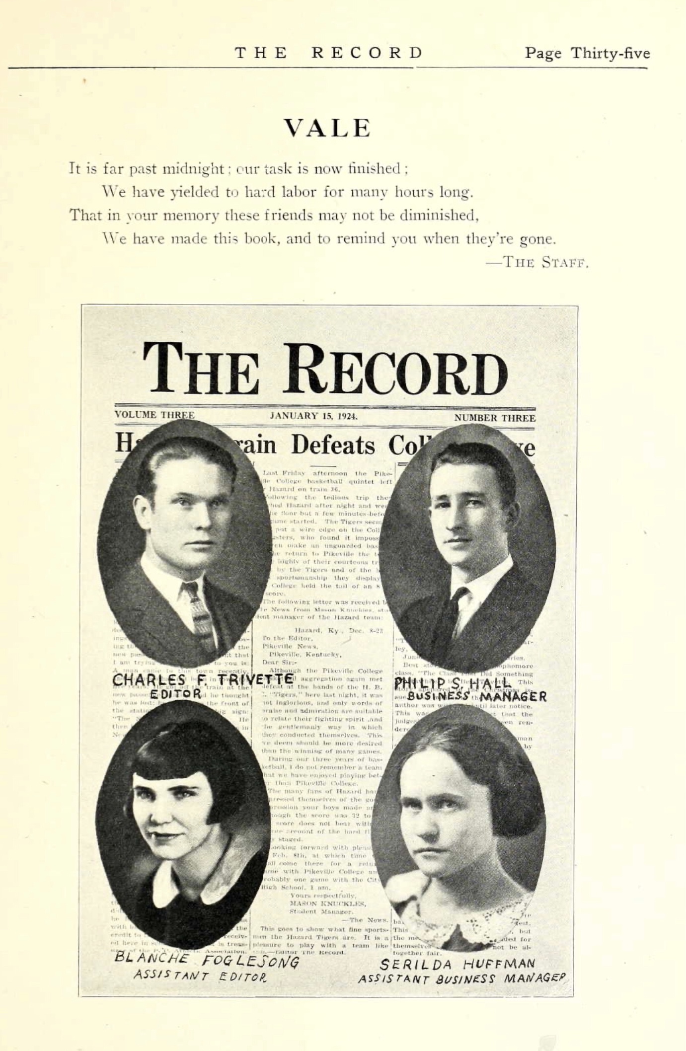 Charlie F Trivette is shown attending Pikeville College in 1924.