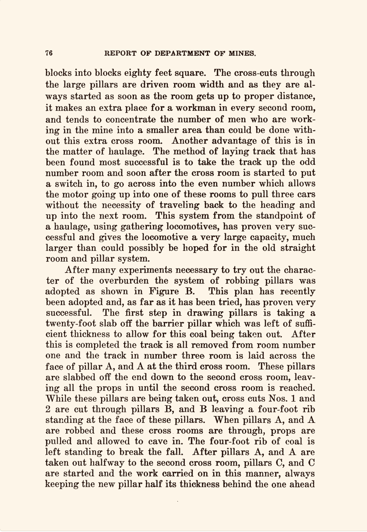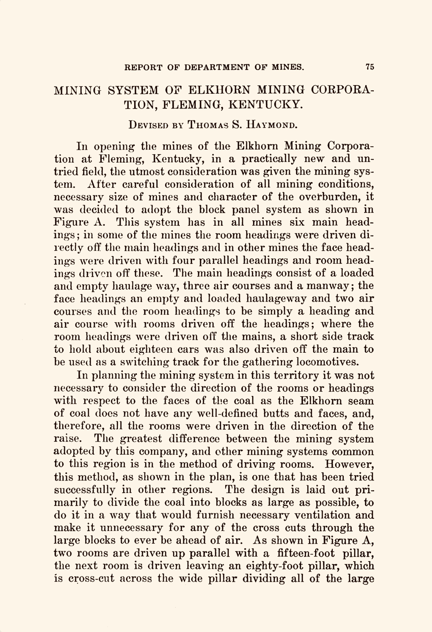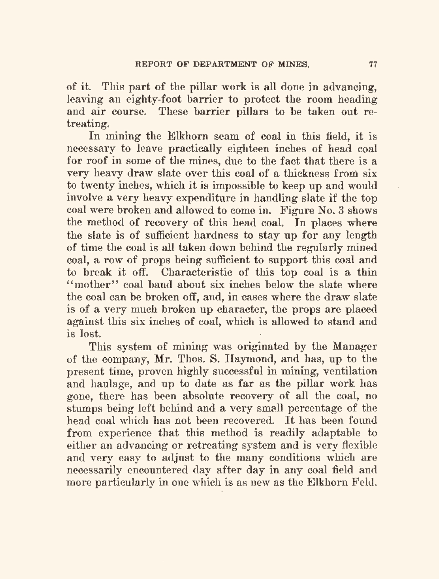 ‘The Wayland mine is operating the Elk Horn No. 1 seam which has a general average thickness of about 42 inches of coal. The underground equipment includes 26 electric cutting machines, 25 electric locomotives, 500 new steel mine cars, 1 mechanical loading machine and 23 underground conveyors. These conveyors are arranged to load from 12 working places and to gather the coal to 4 separate points where trips of mine cars are loaded.’