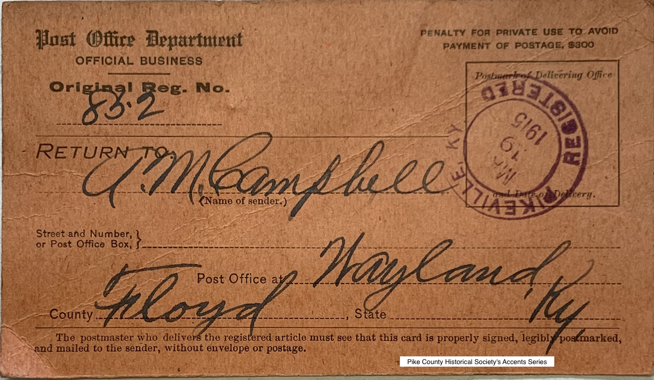 Getting down to business on December 1, 1915, Elk Horn took control of mine works already set up by Elk Horn Mining and still in progress. At one of these locations, up on Right Beaver Creek at Steele’s Creek, there had been confusion as to what to call the mining town under construction. The nearest post office was at the town of Allen. ** Letters were addressed to ‘At Camp, Steele’s Creek, Allen P.O!, or ‘Watsontown, Allen P.O!, or ‘Wayland, Allen P.O!. A courier for the company would be at Allen to receive mail when it arrived, then ride the train (or a horse) up to Stone Coal Branch and Steele’s Creek where the mail would be distributed.