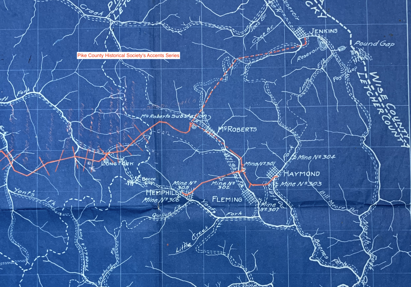 Fleming, Haymond and Hemphill received its electrical power supply from High Tension Transmission Line from the Consolidated Coal Co. Power Plant at Jenkins. Red line shows Transmission location.
