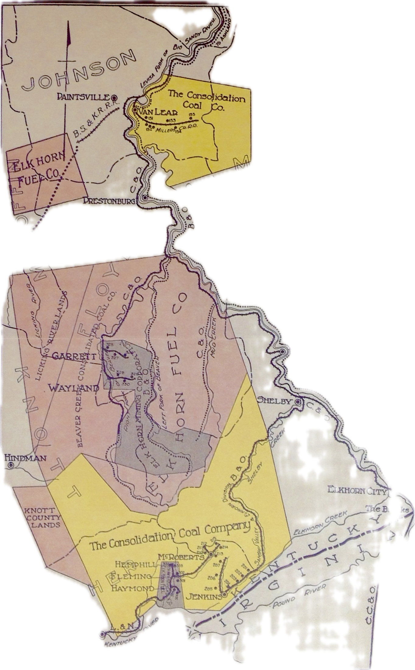 “ELK HORN FUEL COMPANY Inc. Feb 3, 1913, in W. Va, to acquire and operate 199,479 acres of coal lands in fee and mineral rights in the Elkhorn field of Kentucky, Of this acreage 184,829 acres are in Letcher, Knott, Floyd, Leslie, Magoffin, Pike and Perry Counties, Ky.: the remaining 14,650 acres being located in Upshur and Randolph Counties, W. Va. Owns 7,879 of the 27,575 outstanding shares of the Beaver Creek Consolidated Coal Co., owning about 50,000 acres of land in fee or mineral rights in the Elkhorn coking held, all of which the Elk Horn Fuel Co. has the right to purchase Mineral Fuel Company to 4500 acres the Elkhorn Field let shares which $800,000 reserved for development purpose 1800 shares of the 1930 shares of the Tennis Coal Co., owning approximately 49,200 acres of land in fee or mineral rights in Leslie, Perry, Harlan and Knott Counties, Ky., and 500 of the 1,000 shares of the York Coal & Coke Co. Also owns $4.371,500 of the stock of the Consolidation Coal Co.”