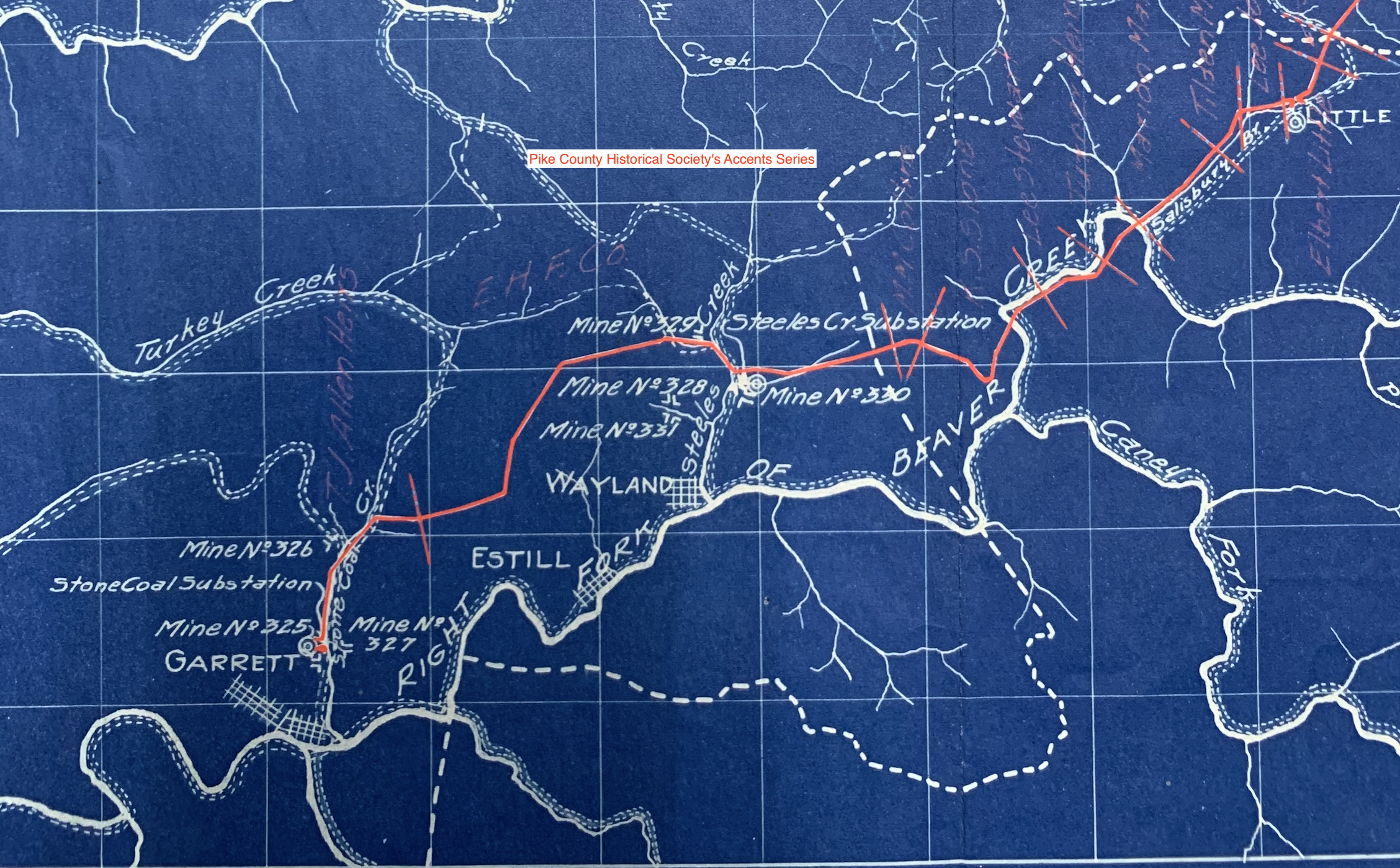 Wayland and Garrett received its electrical power supply from High Tension Transmission Line from the Consolidated Coal Co. Power Plant from Jenkins. Red line shows Transmission location.