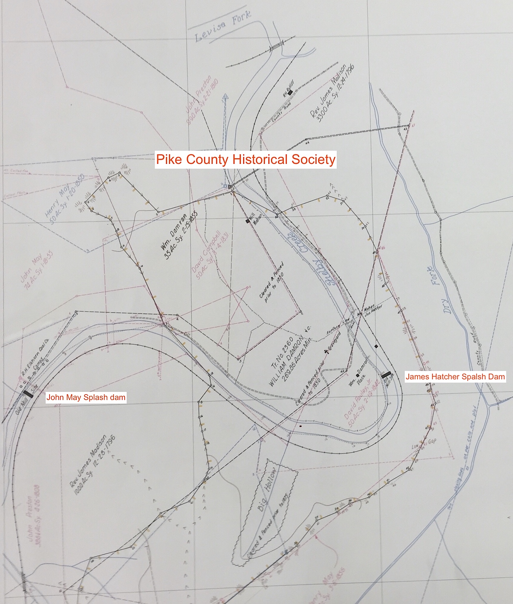 This Dam is commonly referred to as the John May Grist Mill, which is correct. The picture below appears to show the likeness of James Hatcher sitting on the right side of the Splash Dam.
