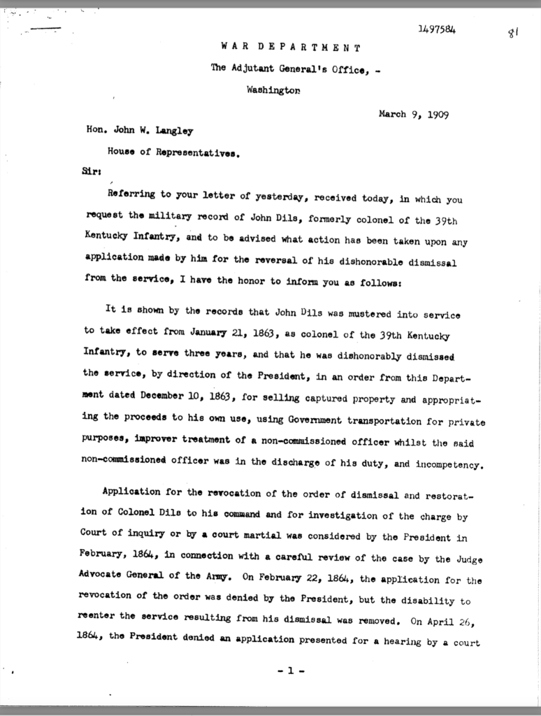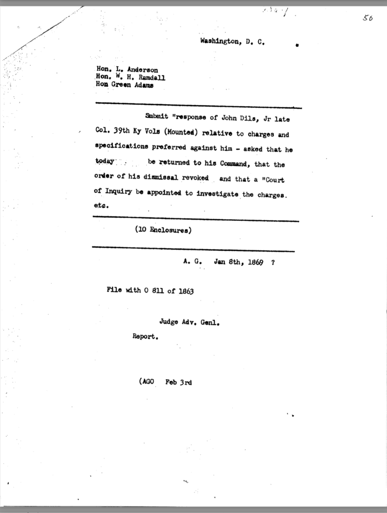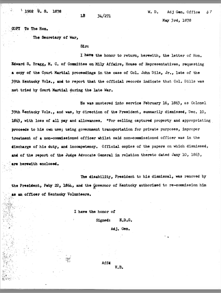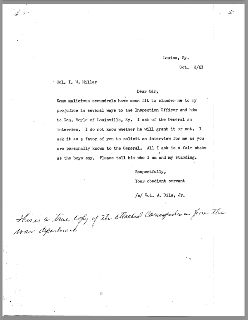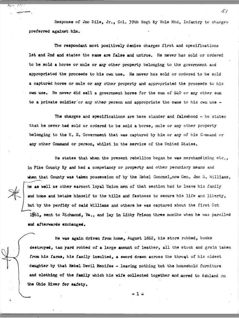 Included in this section is an 80-page transcription of Colonel Dils’ court martial file. It was gifted to me years ago by Nancy Forsythe of Pikeville. All markings and notations are by previous owners.