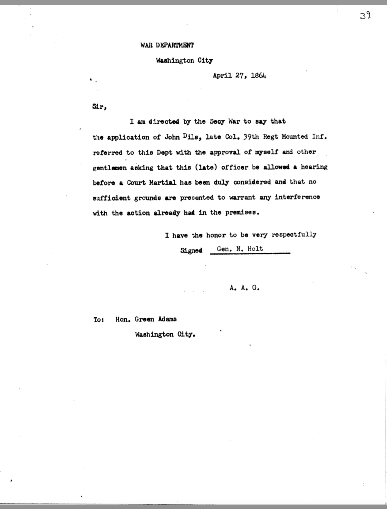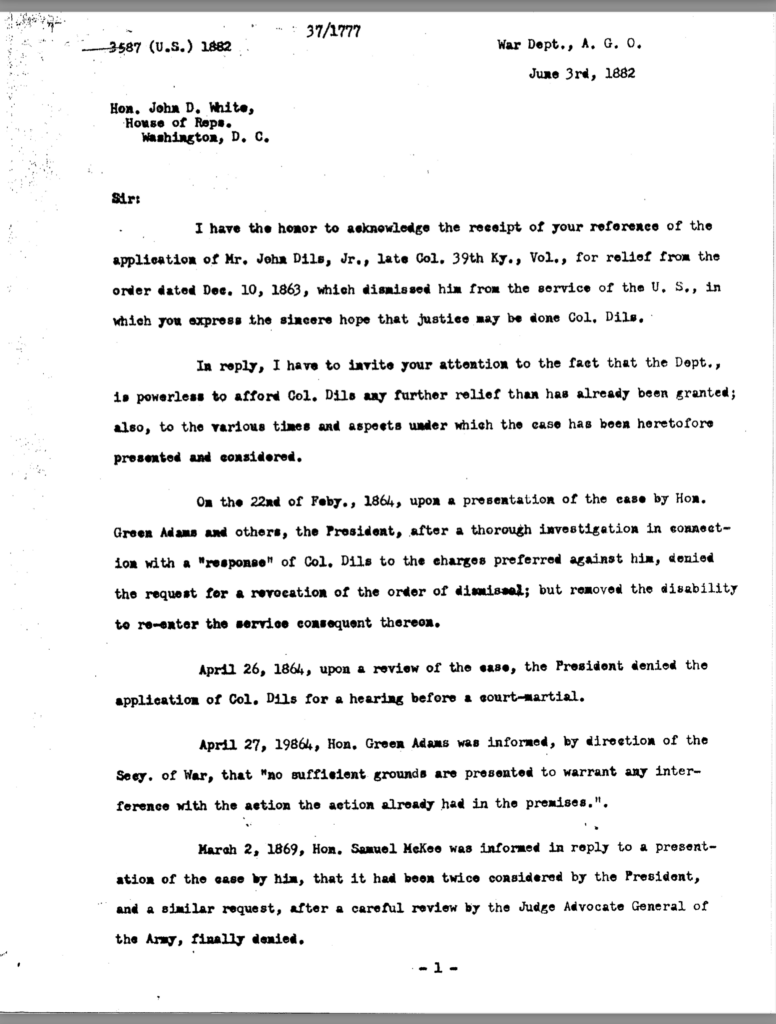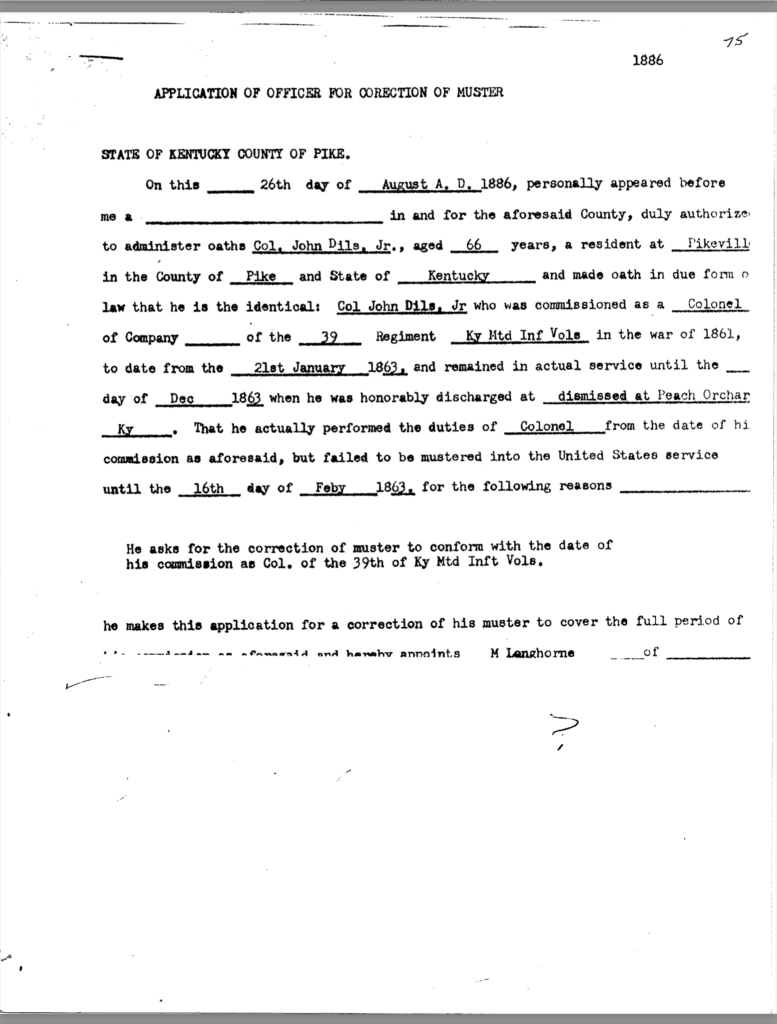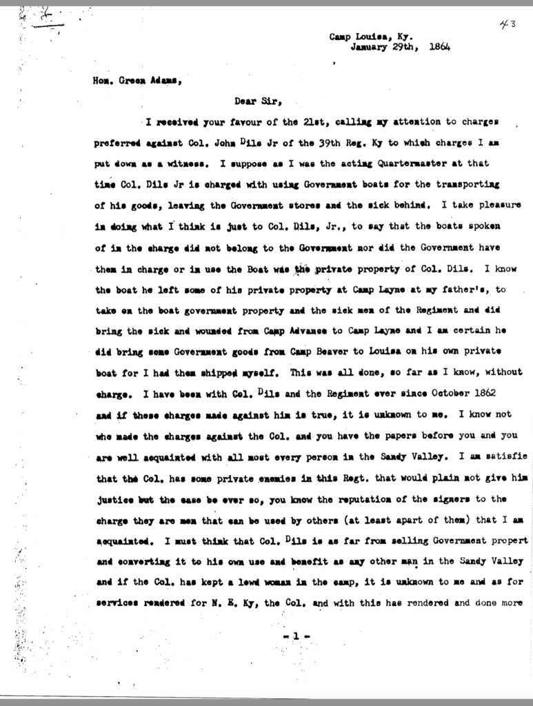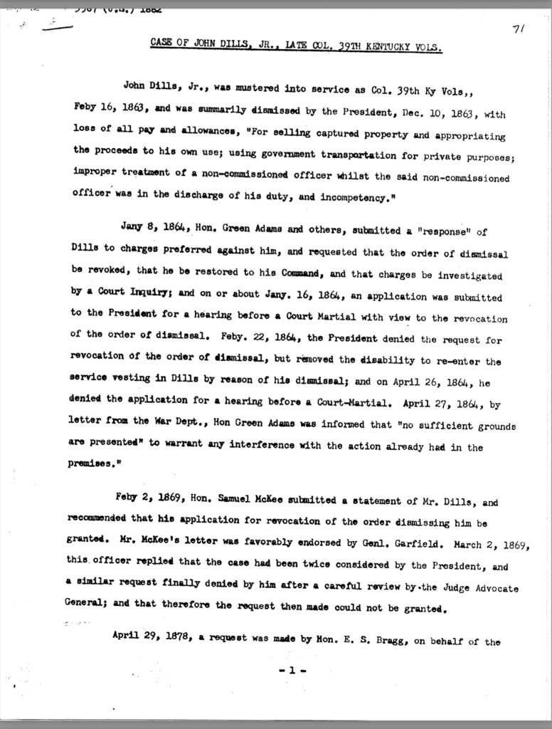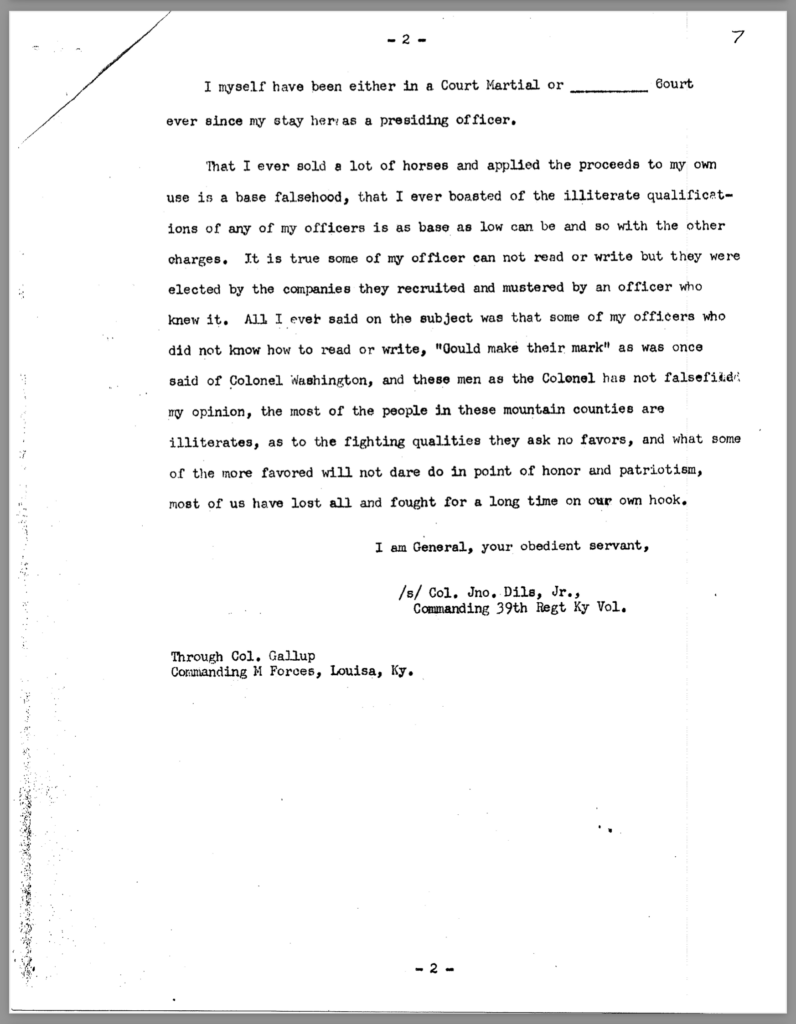 Included in this section is an 80-page transcription of Colonel Dils’ court martial file. It was gifted to me years ago by Nancy Forsythe of Pikeville. All markings and notations are by previous owners.