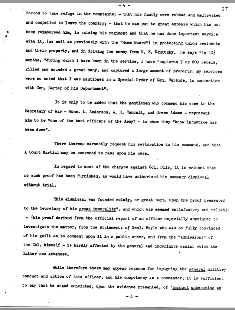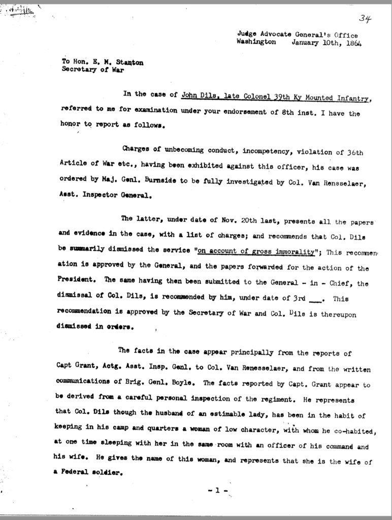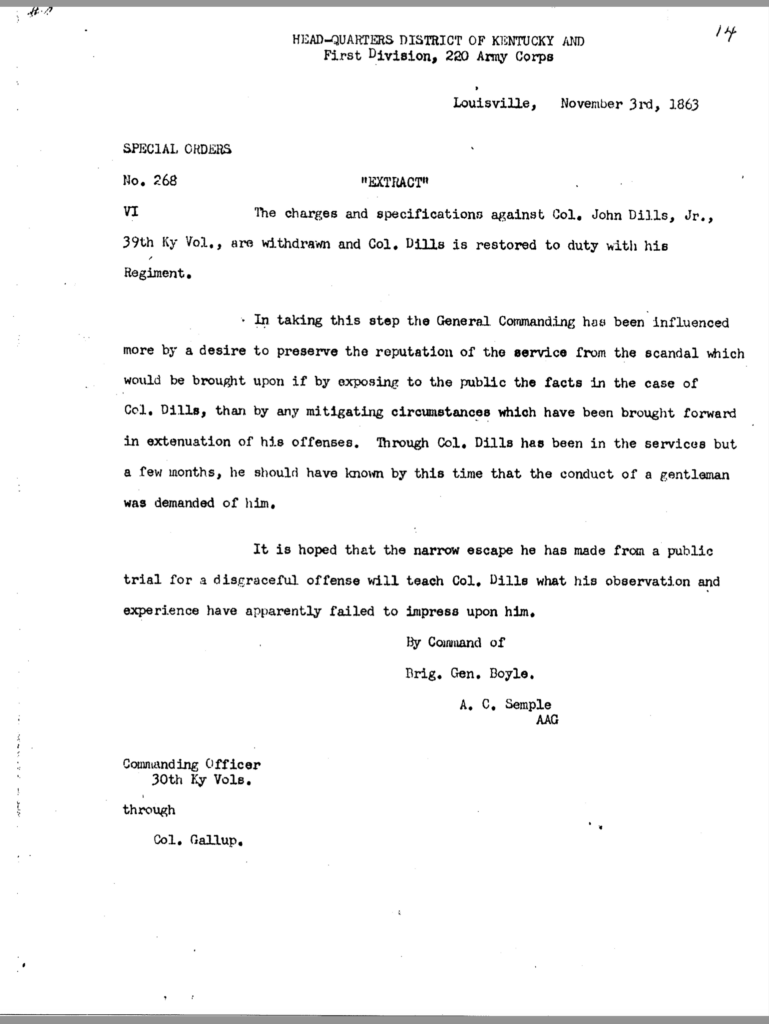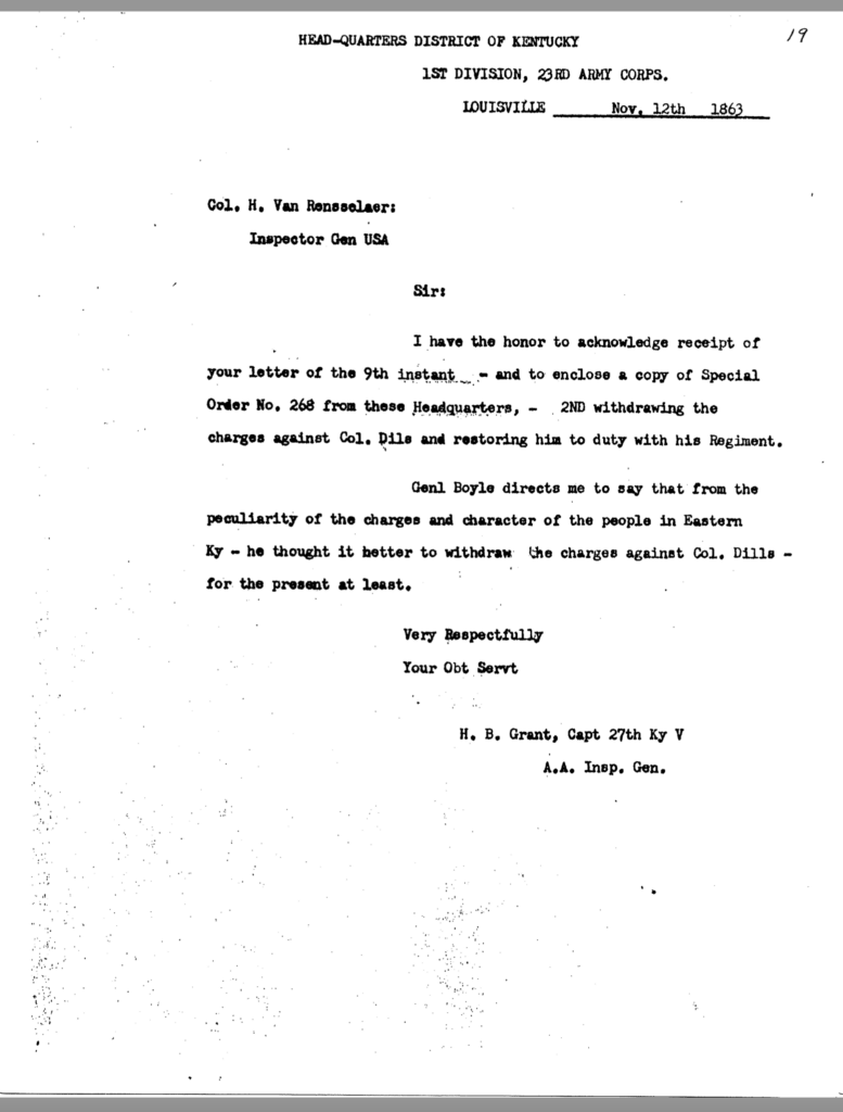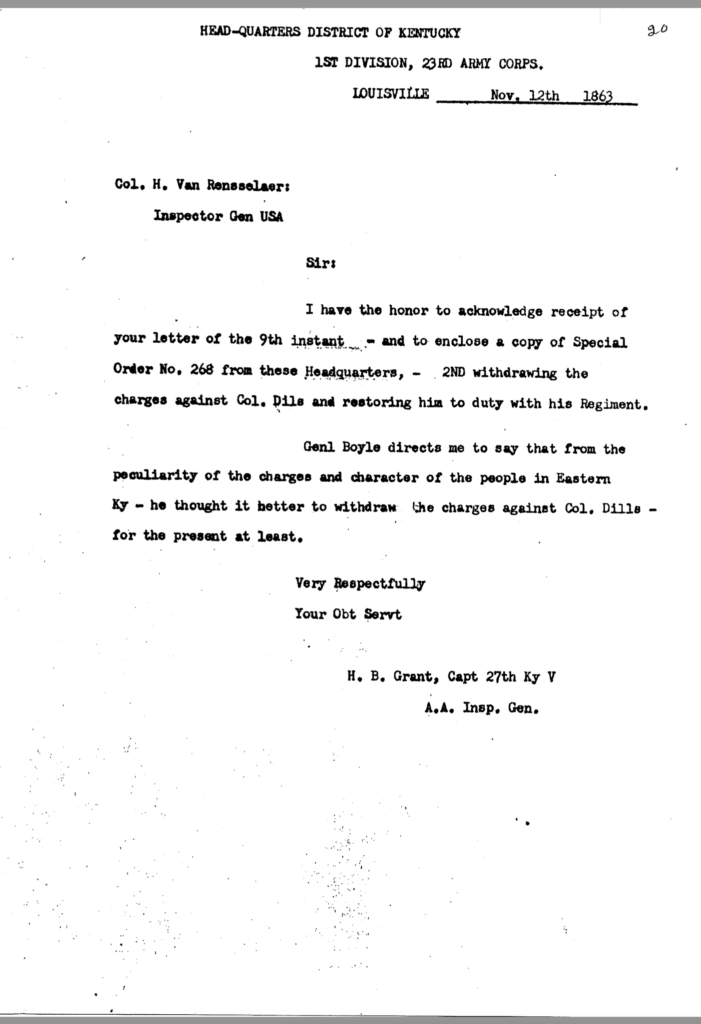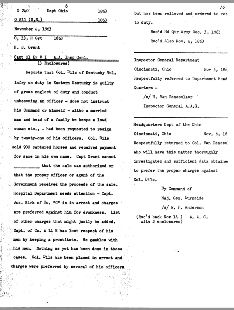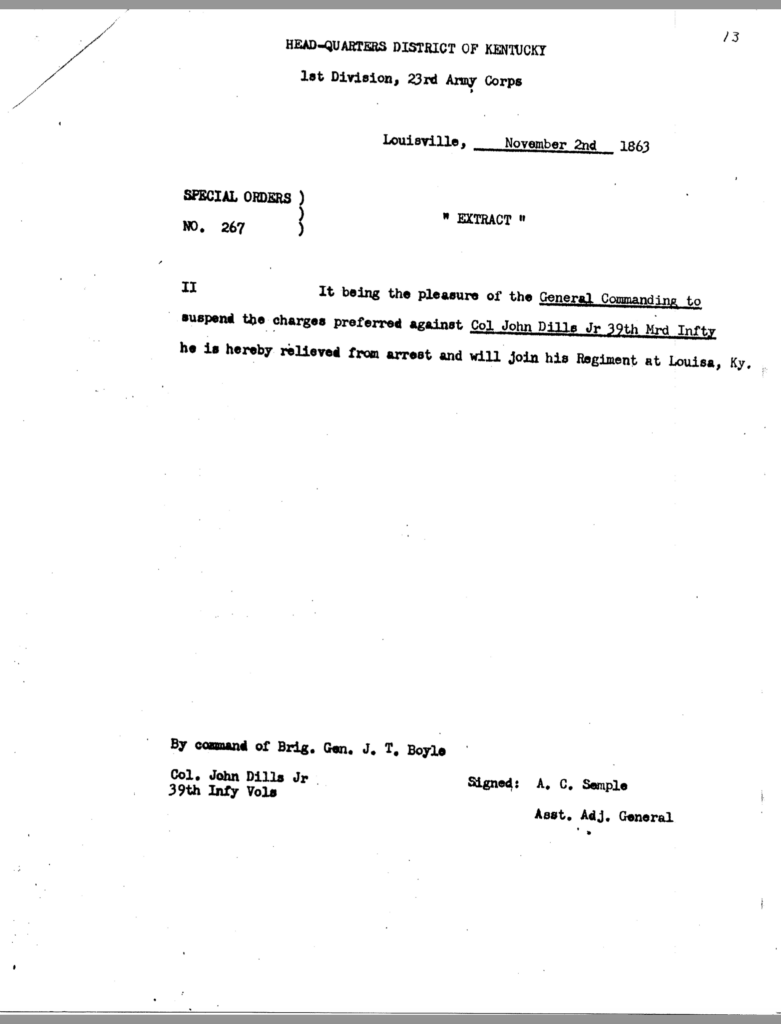The allegation of keeping an unmarried woman in camp seems to have been the underlying motivation for Dils’ dismissal from service. General Jeremiah Boyle, a superior officer evidently sympathetic with Dils’ case, wrote of the colonel’s indiscretions, “. . .he should have known by this time that the conduct of a gentleman was demanded of him.” By November 1863, it looked like he would weather the storm. On November 3, after being temporarily relieved of command, General Boyle ordered him reinstated.