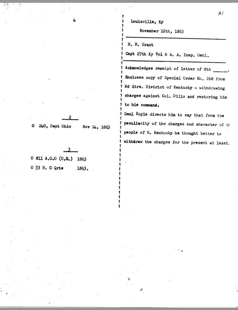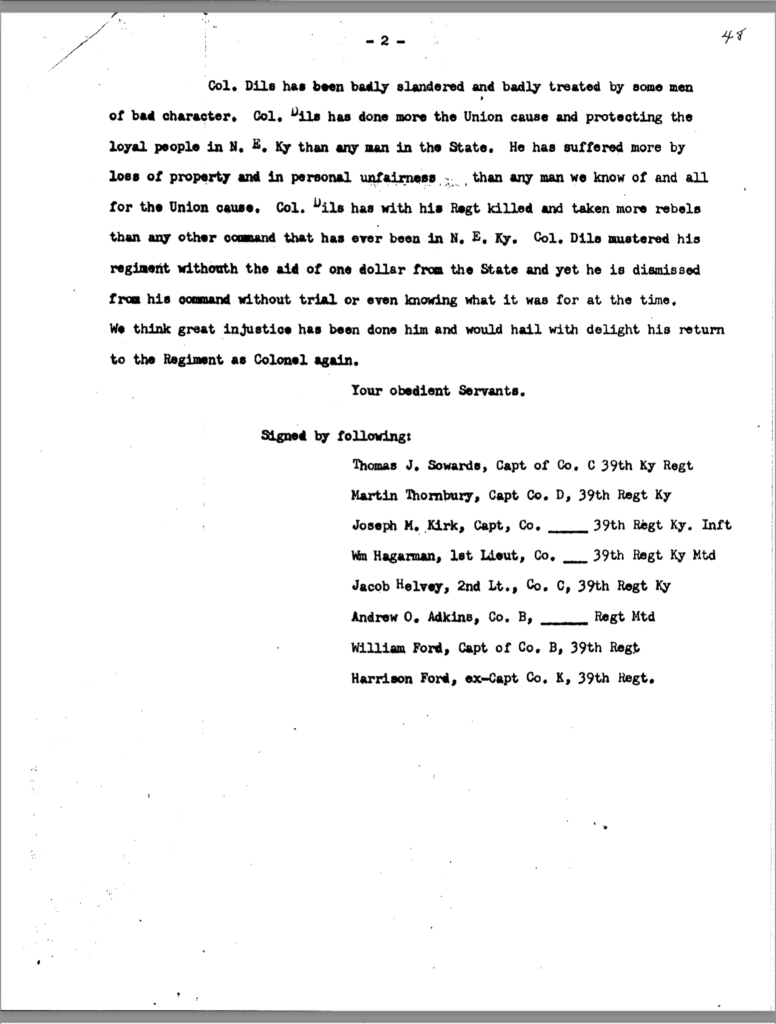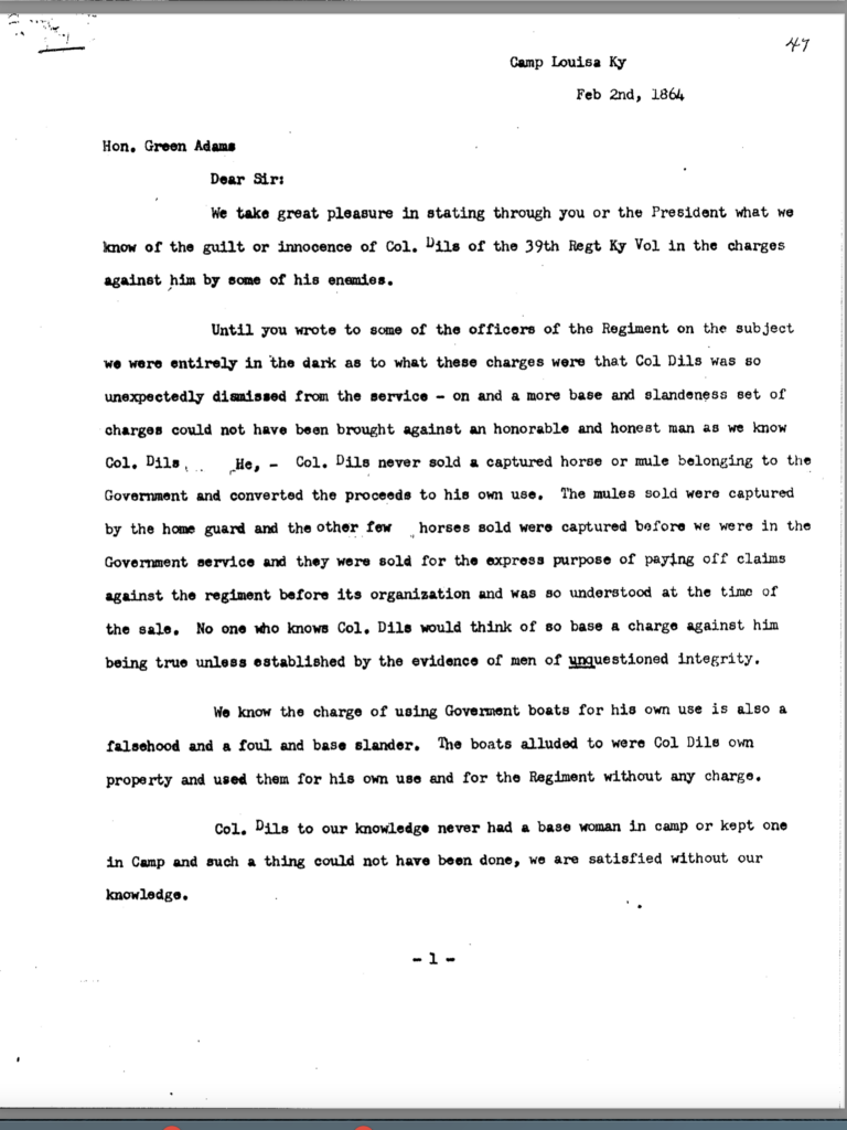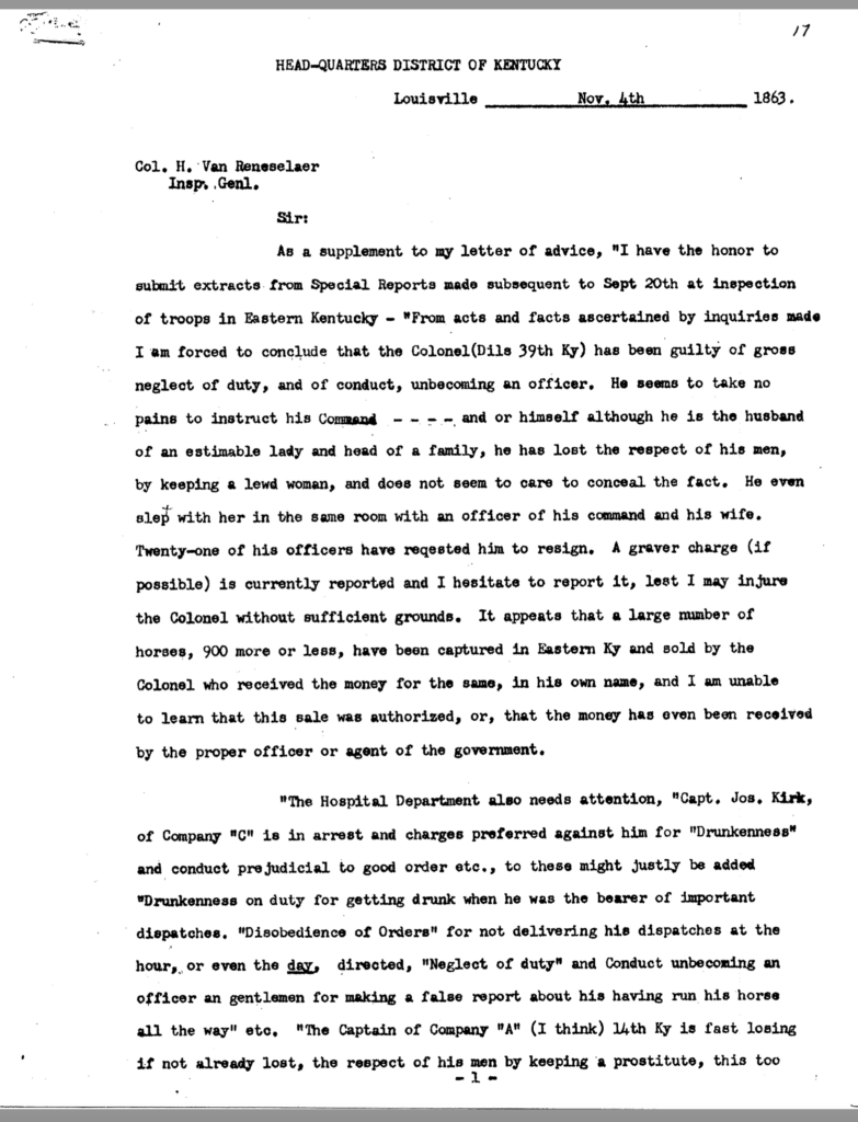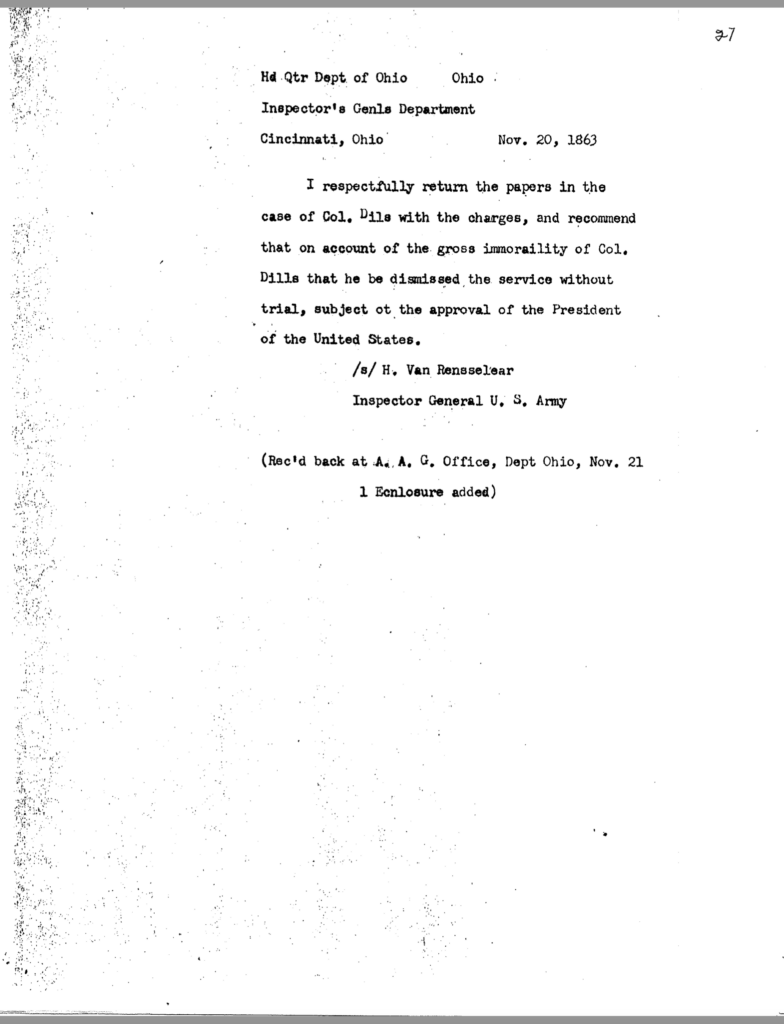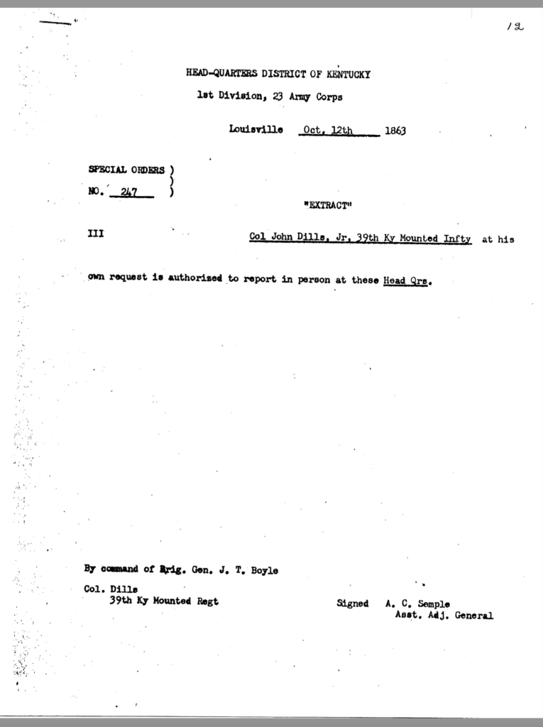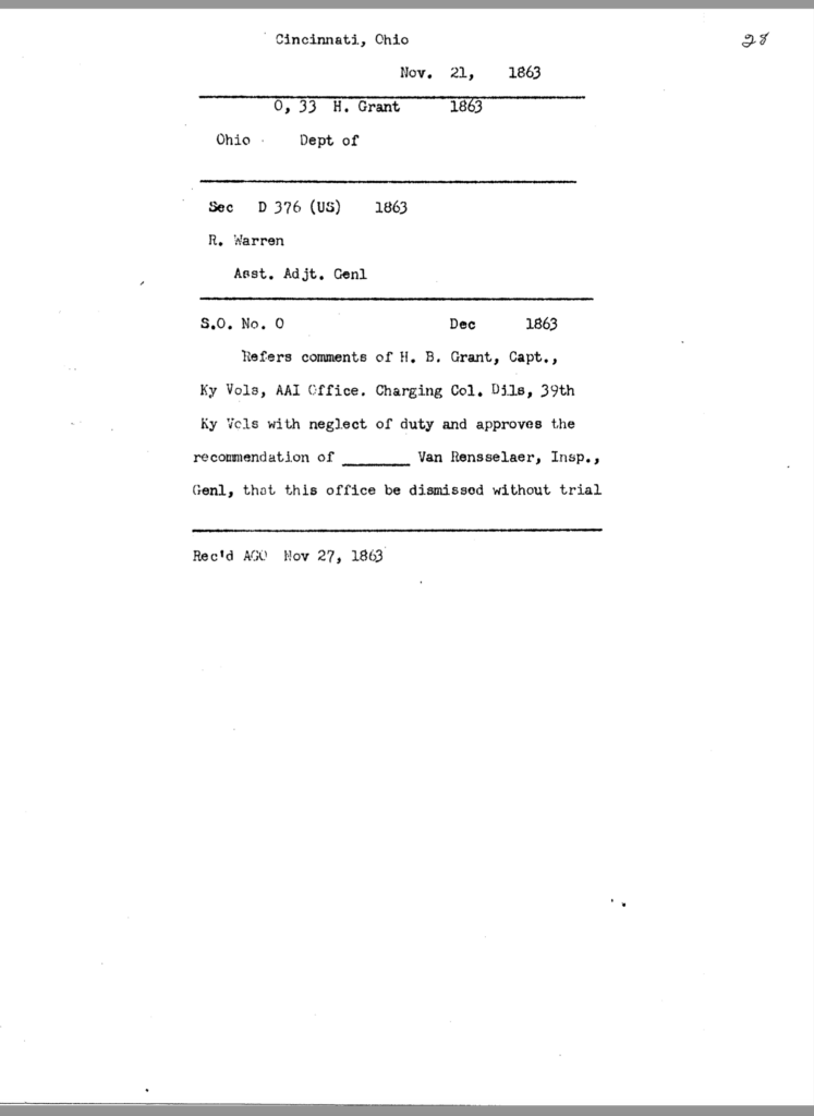 The allegation of keeping an unmarried woman in camp seems to have been the underlying motivation for Dils’ dismissal from service. General Jeremiah Boyle, a superior officer evidently sympathetic with Dils’ case, wrote of the colonel’s indiscretions, “. . .he should have known by this time that the conduct of a gentleman was demanded of him.” By November 1863, it looked like he would weather the storm. On November 3, after being temporarily relieved of command, General Boyle ordered him reinstated.