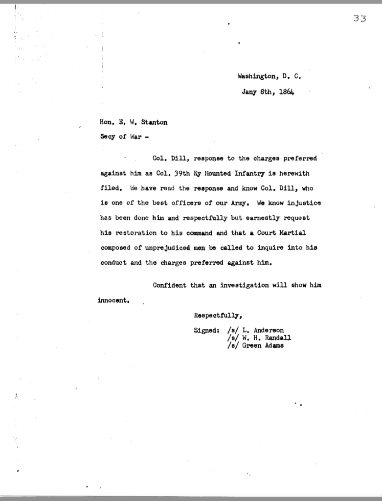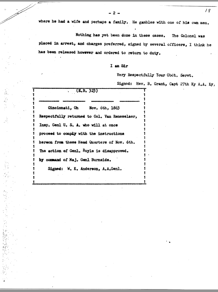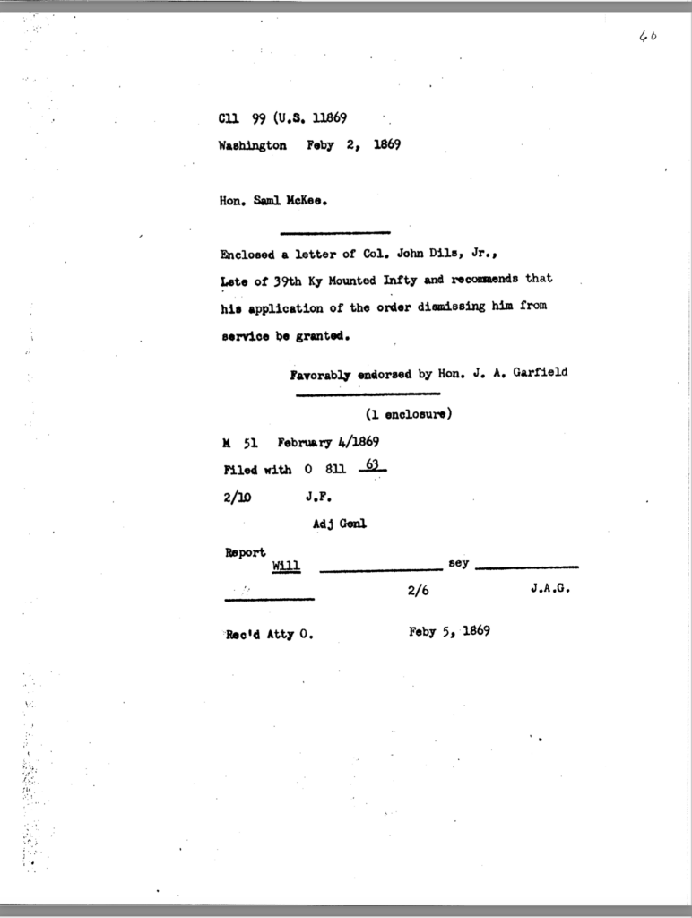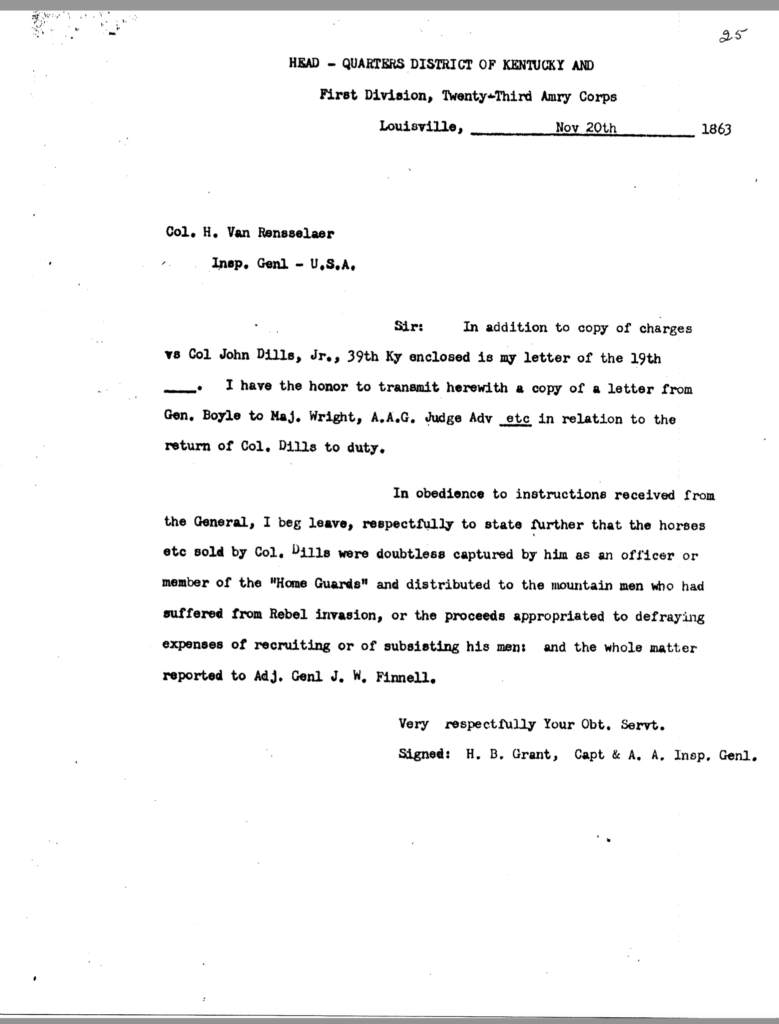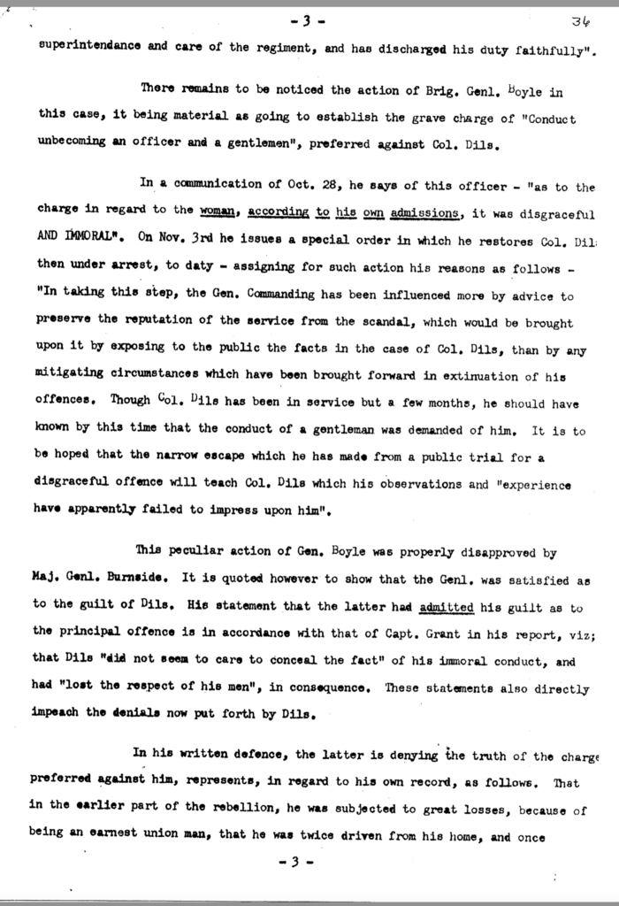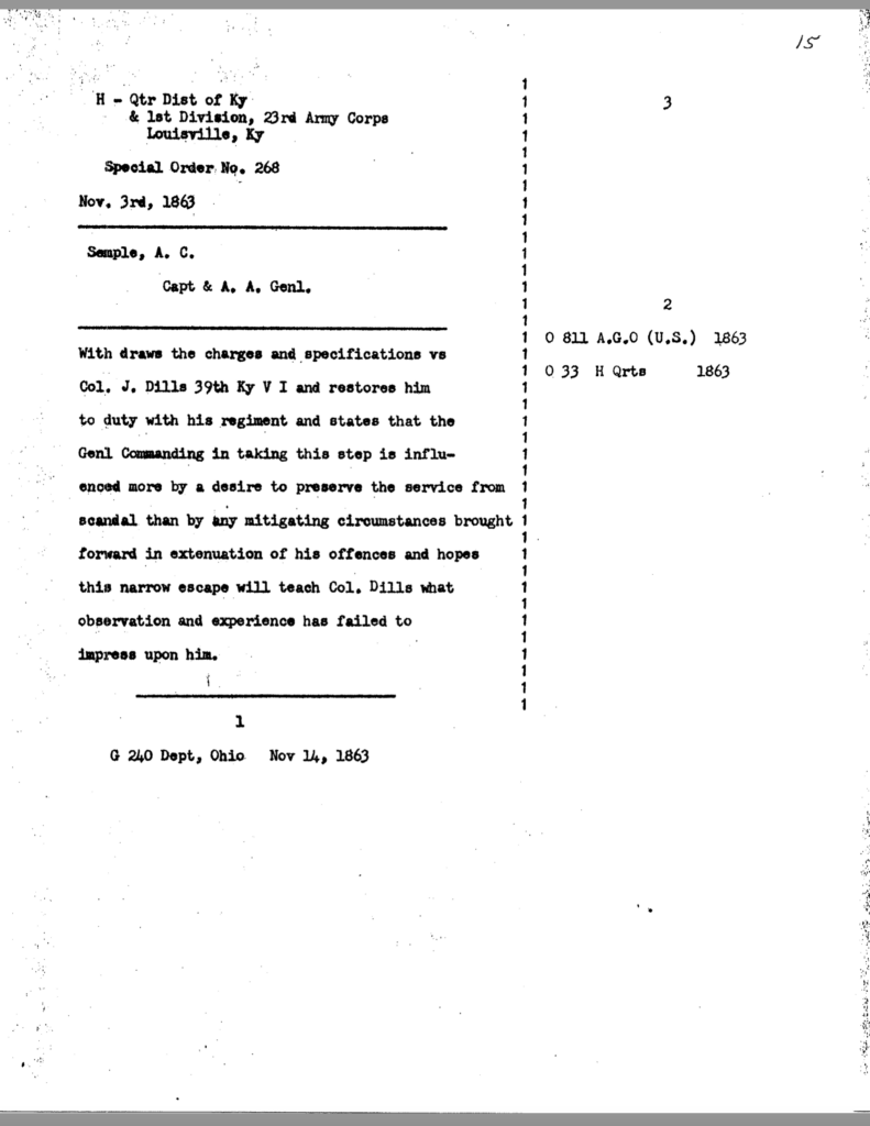 The allegation of keeping an unmarried woman in camp seems to have been the underlying motivation for Dils’ dismissal from service. General Jeremiah Boyle, a superior officer evidently sympathetic with Dils’ case, wrote of the colonel’s indiscretions, “. . .he should have known by this time that the conduct of a gentleman was demanded of him.” By November 1863, it looked like he would weather the storm. On November 3, after being temporarily relieved of command, General Boyle ordered him reinstated.
