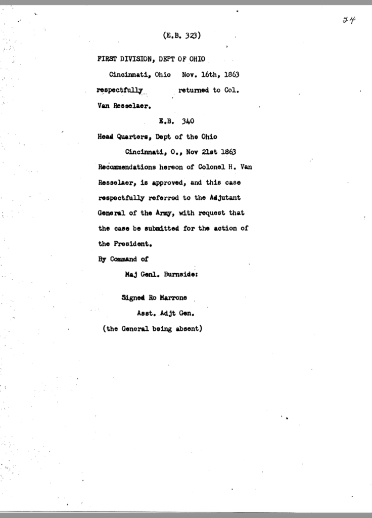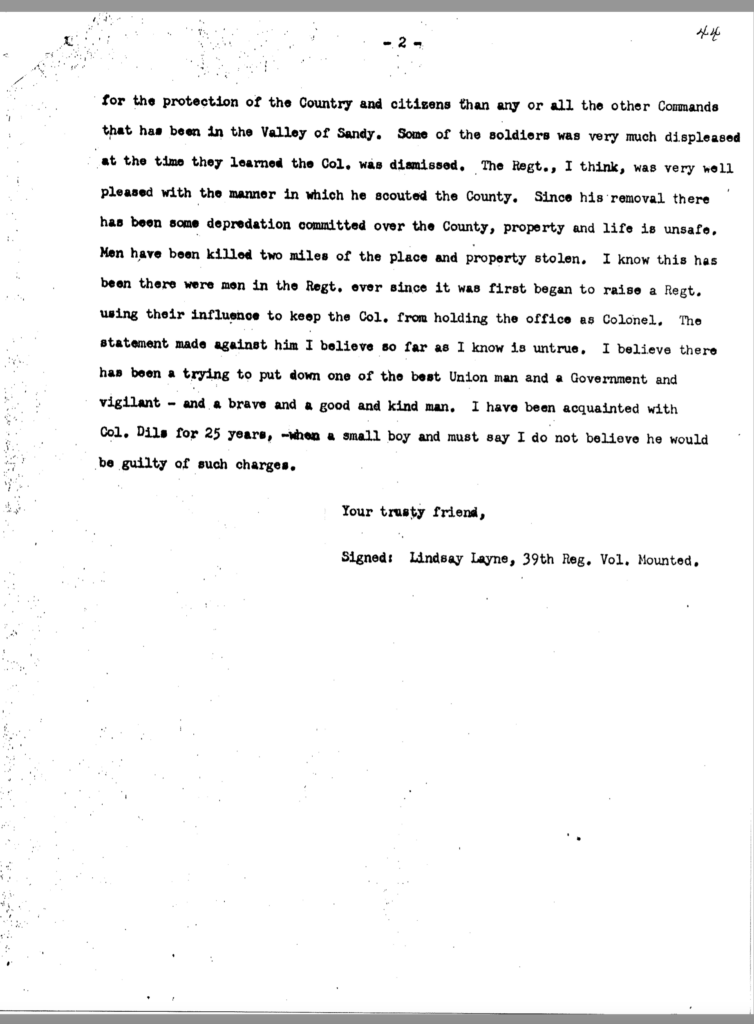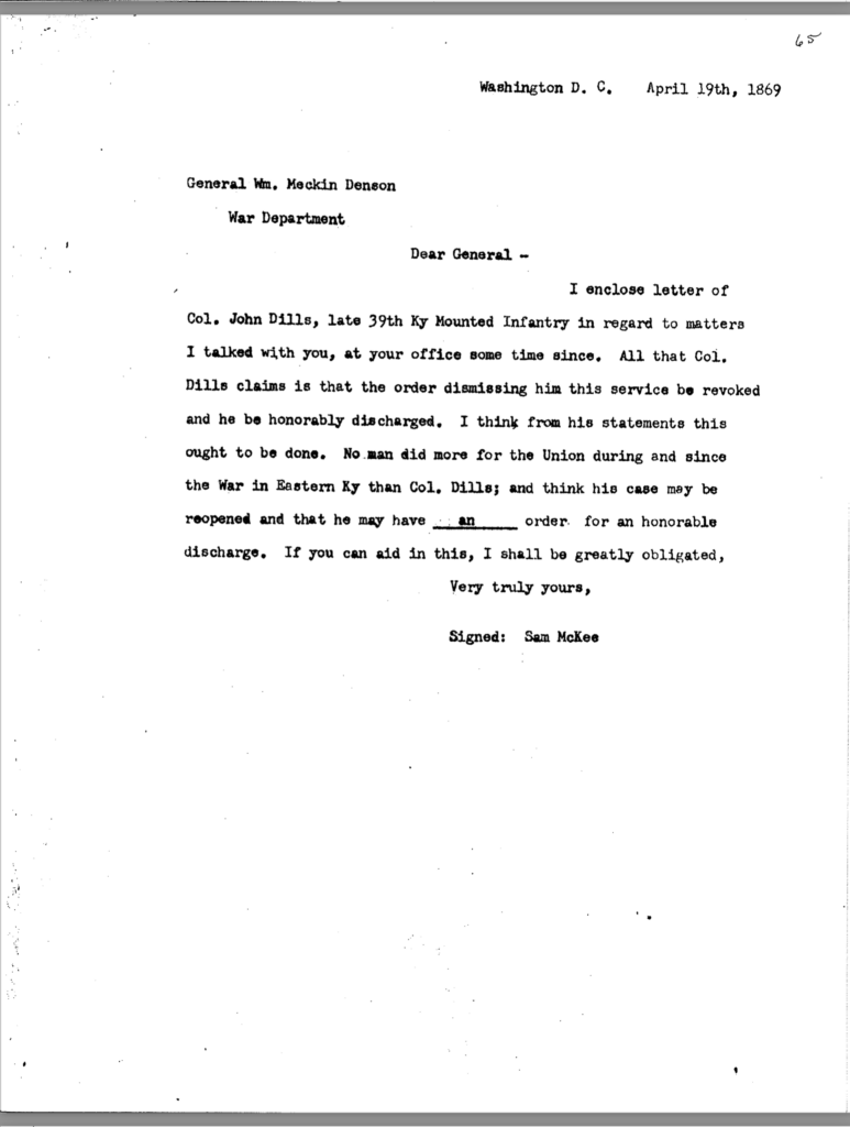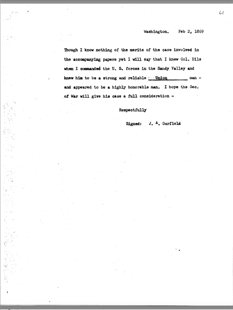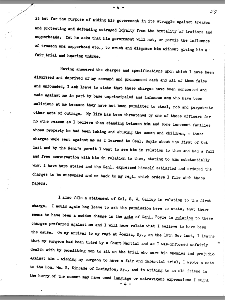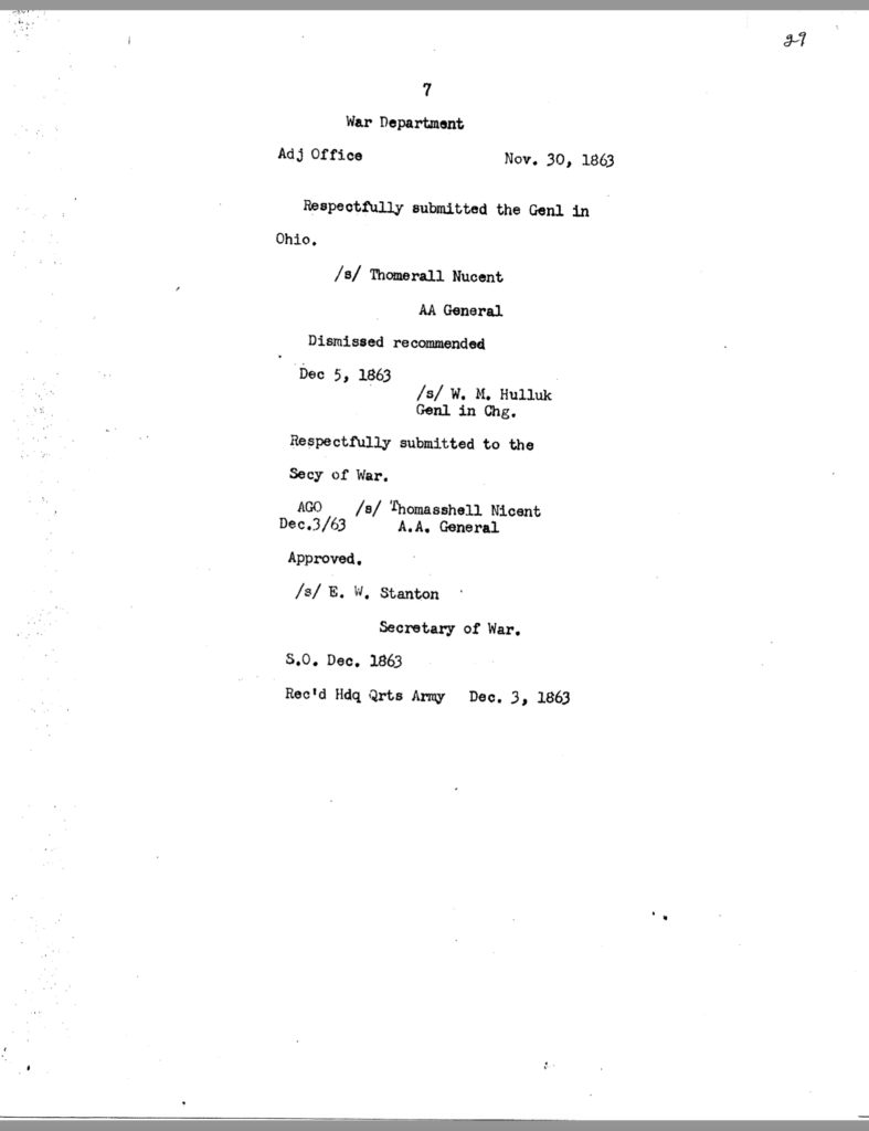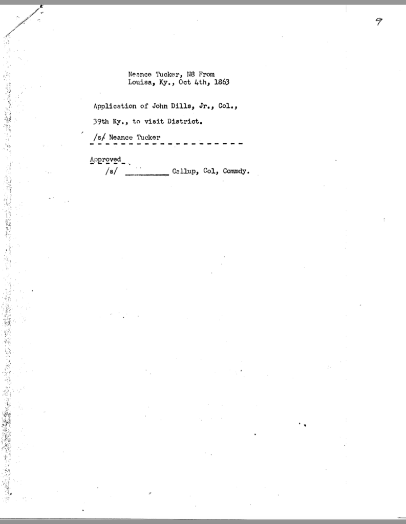 The allegation of keeping an unmarried woman in camp seems to have been the underlying motivation for Dils’ dismissal from service. General Jeremiah Boyle, a superior officer evidently sympathetic with Dils’ case, wrote of the colonel’s indiscretions, “. . .he should have known by this time that the conduct of a gentleman was demanded of him.” By November 1863, it looked like he would weather the storm. On November 3, after being temporarily relieved of command, General Boyle ordered him reinstated.