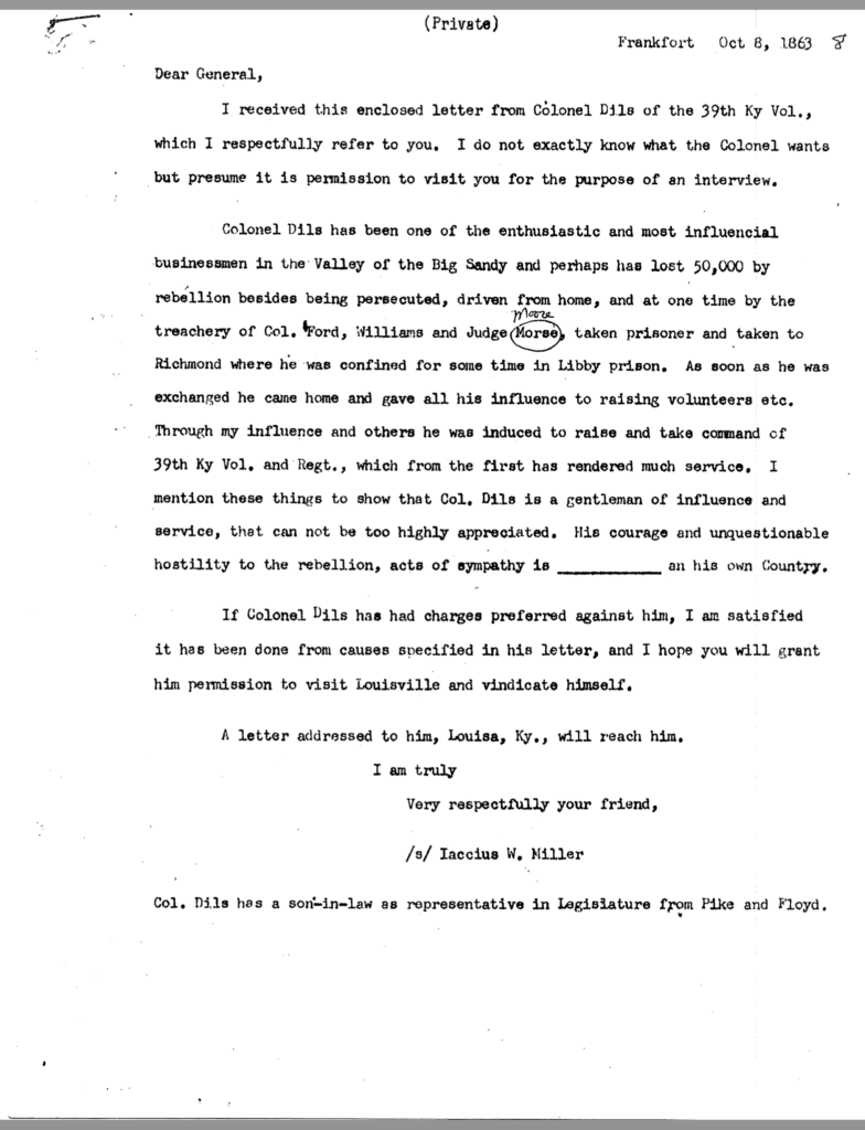 [7] Dils and Garrett probably knew each other by reputation. Davis led a contingent of volunteer cavalry as part of General William “Bull” Nelson’s army during the early fall 1861 fighting at West Liberty, Ivy Mountain, and Johns Creek. Nelson’s army occupied Pikeville only days after Dils’ arrest and had surely heard of the event. Dils, on the other hand, likely knew Davis’ statewide political reputation and no doubt heard of Davis being in Pikeville during his confinement in Libby Prison.