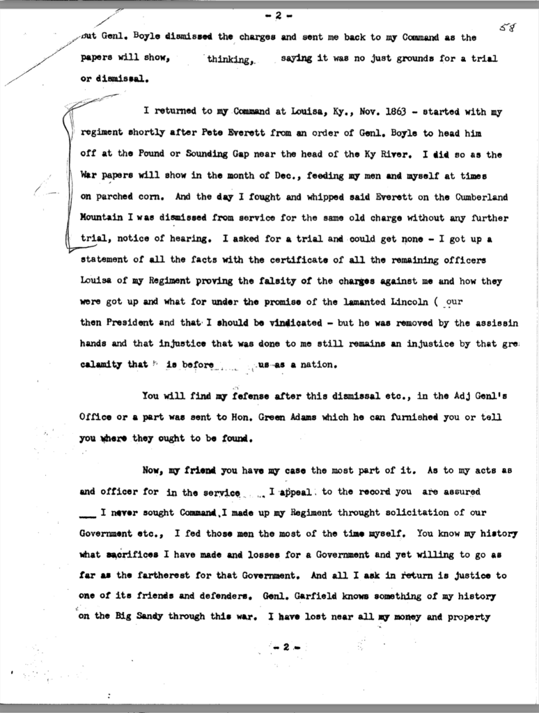 It was several days before I could get my own consent to accept; but, there being so many refugees from the Upper Sandy counties (Pike, Floyd, etc.) that wanted to go into the service of the United States army soliciting me, I finally acquiesced and recruited the first day about two hundred men, and soon after raised, at a considerable personal sacrifice, what is known as the 39th Kentucky Regiment, Mounted Infantry. Its efficiency or inefficiency as an auxiliary in the service of the Government has gone into history, to stand the test of an impartial judgment of the loyal mind, where its friends rest in confidence of a just verdict.