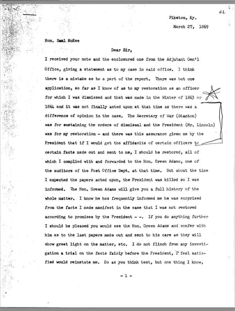I visited Washington the February following, with a view of getting relieved from any military obligation I might be considered bound to observe to the Confederate States. I was neither sworn, nor did I sign any parole, but was simply discharged, as I understood. But still I did not feel just like a free man; not that I wanted to go into the service, but I knew my failing: I would speak out my sentiments—therefore I desired to be relieved from any trammels, however constructively viewed. After seeing my friend, Hon. Green Adams, I laid the matter before him to assist me in the difficulty.[5] My friend introduced me to the President, Abraham Lincoln, who gave me a special invitation to visit him as often as I could, which marked favor I was pleased to accept, seldom missing a day, as each visit made it more interesting and charming as time faded away. I refer to this, as it was my good pleasure to have the opportunity to listen to what the good man had to say to each of the many who were hourly petitioning him for some favor, and wherein his inestimable worth could be seen both in the Executive and the great, swelling, loving heart for the people.In August 1862, some of the advance troops of General Kirby Smith arrived near Pikeville. I was robbed of a large stock of goods by a party under the command of Colonel Menifee [sic], and some of Colonel Caudill’s command.[6] I had to flee the country for life. I arrived at Frankfort, after stopping a short time in Louisville, the fourth day after leaving home, giving the news of what was going on. I wanted guns, as no peace could be had at home on any terms.