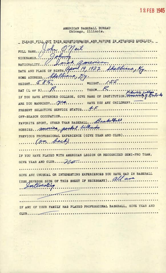 Data on Johnson/ O’Neil’s father, Dewey Johnson, from an early census record showed he had not attended school, but his registration for WWl draft revealed he could write by seeing his signature.  Dewey’s WWll draft card revealed even better penmanship.  There was nothing in those records to reveal anything regarding the son, but one never leaves a stone unturned.  So where do we turn?  We had used records on Google and copies of official records from baseball.  We had used everything we thought imaginable.  It actually kept me up one night.