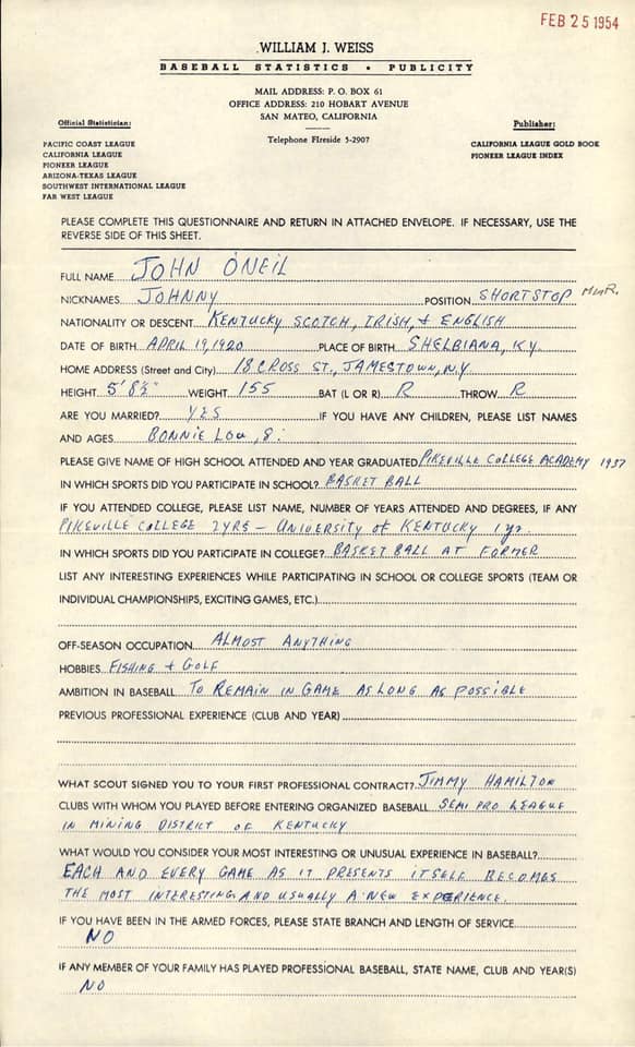 A check some postings of questionnaires on Ancestry.com showed that O’Neil had supplied to the central league office with information regarding his experience.  On one from 1954 he stated that he graduated in 1937 from Pikeville College Academy and said he played basketball there.  A quick check of the basketball encyclopedia shows an 8-16 record for them in 1935-36 and possibly a misprint for the next season that should have read as 1936-37 but is printed as 1935-36, again with a note that says they did not play that season.  It most likely should have read “1936-37 Did Not Play.”  Then it picks back up on the 1937-38 team with a record of 2-21.  He had already graduated, but I wanted to use that year to show they were back playing after being off his senior season.  The questionnaire also stated that he played basketball at Pikeville College (it was a two year institution then).