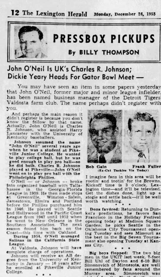 O’Neil/Johnson was in Lexington in 1955 completing his education at UK and had helped Harry Lancaster with the UK baseball team while there.  The article said he had gone to Pikeville Junior College, where he played baseball.  He was good enough to have started playing professionally in 1939 and was smart enough to play professionally under an assumed name – John Francis O’Neil – so he could still participate at Pikeville Junior College under his real name of Charles Johnson.  It worked well for him.  He had started using the assumed name in 1939 as a professional.