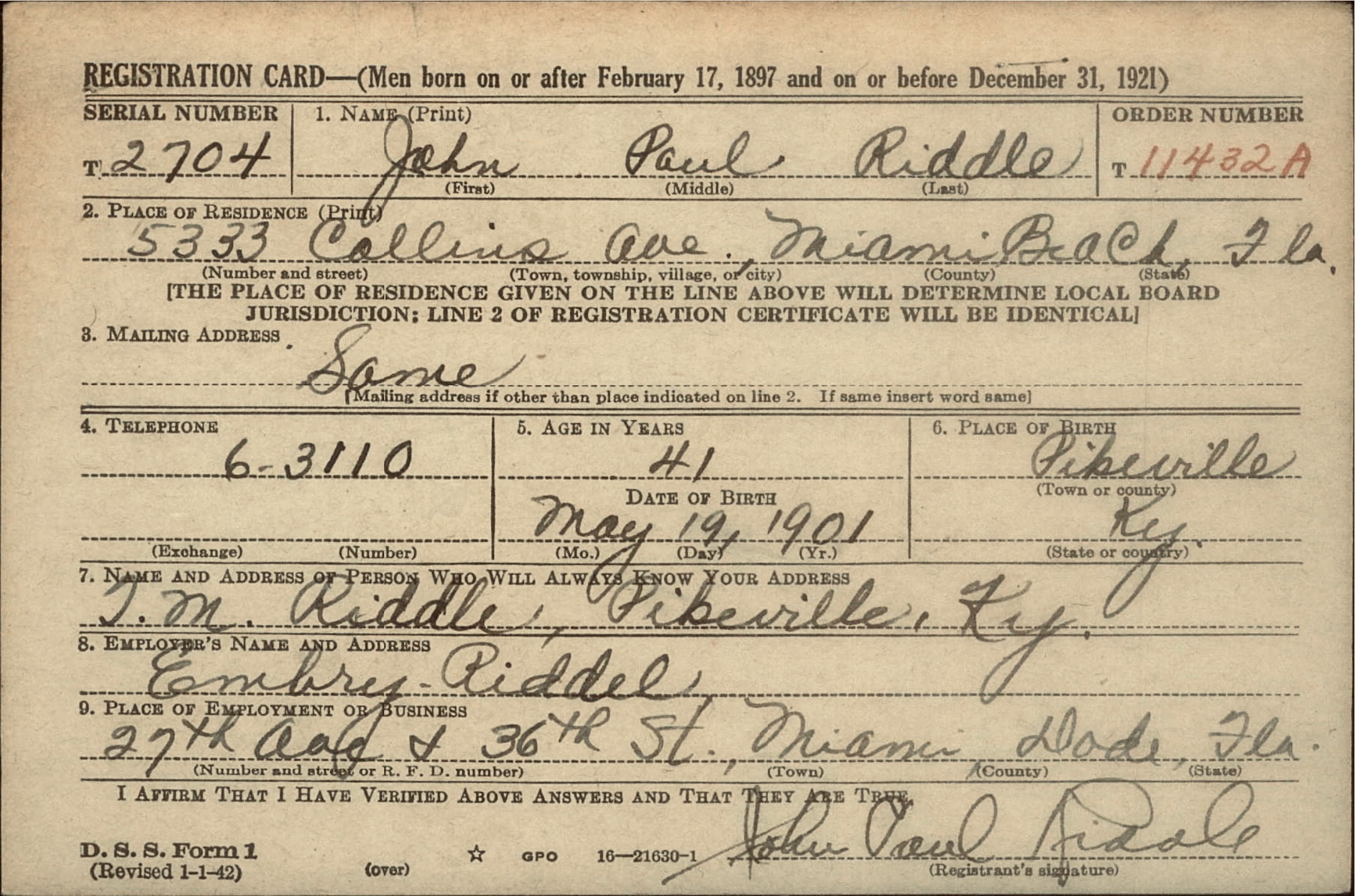 Born in 1901 at Pikeville, Kentucky, John Paul Riddle attended Pikeville College and graduated in 1920. When he left college he married Adele Goeser.