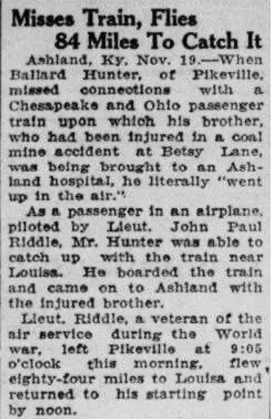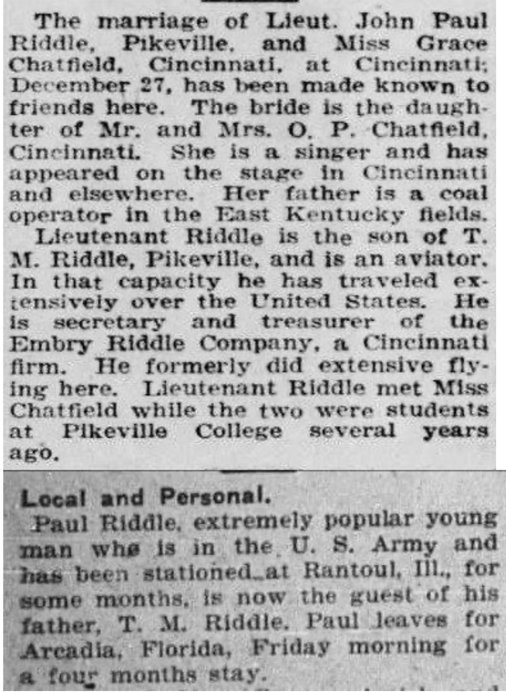 Pikeville can claim more than a passing interest in the Ford reliability tour in which thirteen planes are participating, by the presence of Lieut. John Paul Riddle, who is a pilot of one of the planes in the squadron. Lieut. Riddle is a Pikeville man. He saw service in the aviation department during the war and was commissioned at that time. Lieutenant Riddle has many friends in this city who will follow his exploits in the Ford tour with interest. Lieut. Riddle is piloting the Crosley Radio Corporation plane in the Ford tour, taking as passengers Powell Crosley, Jr., and Harry E. Sherwin, general sales manager of the Crosley Corporation. He is well in the lead of the thirteen planes on the tour but was hampered by some bad luck when he made a forced landing in Massachusetts, when he ran into a dense fog. The landing was a safe one despite the hazards involved.