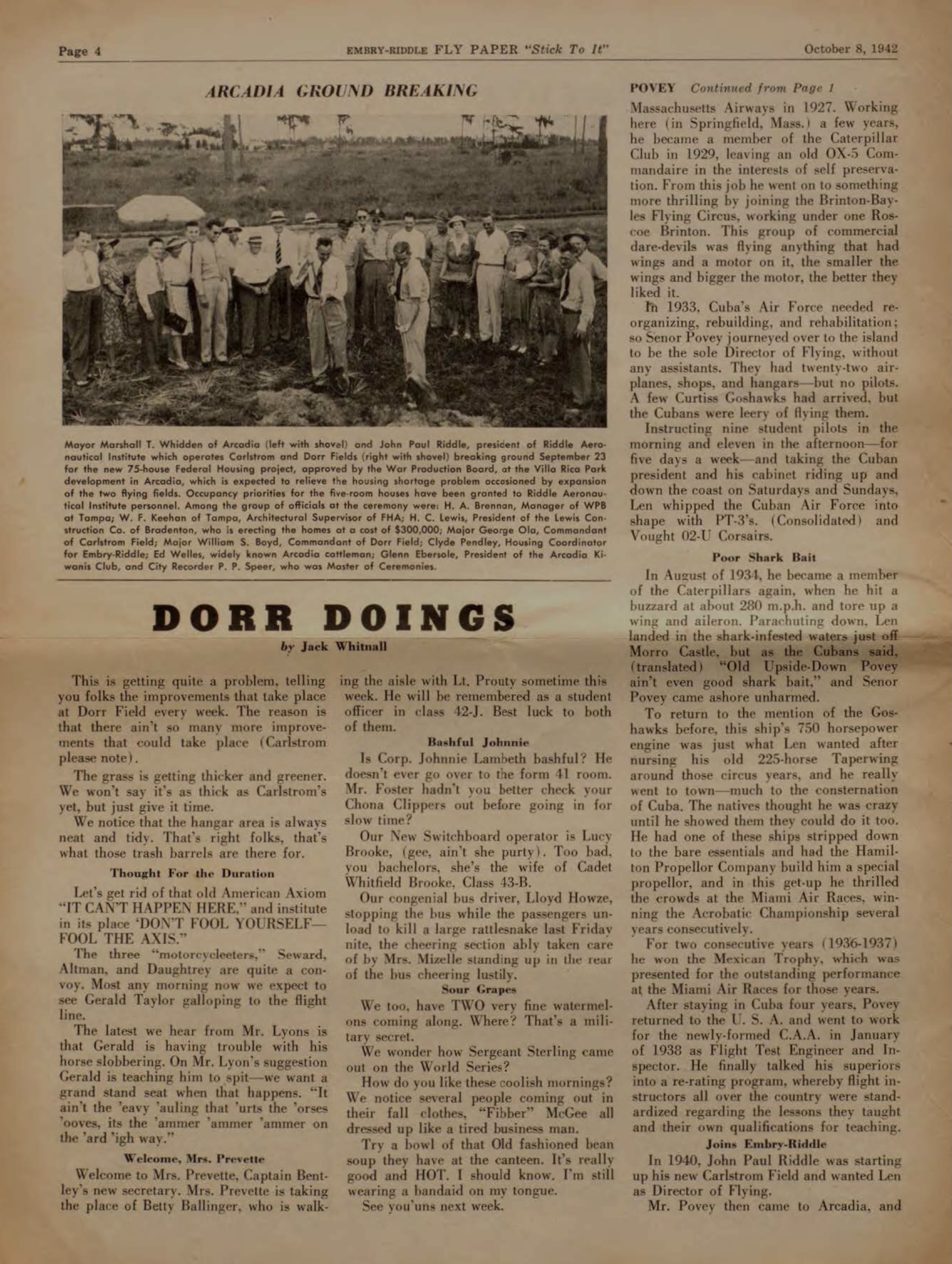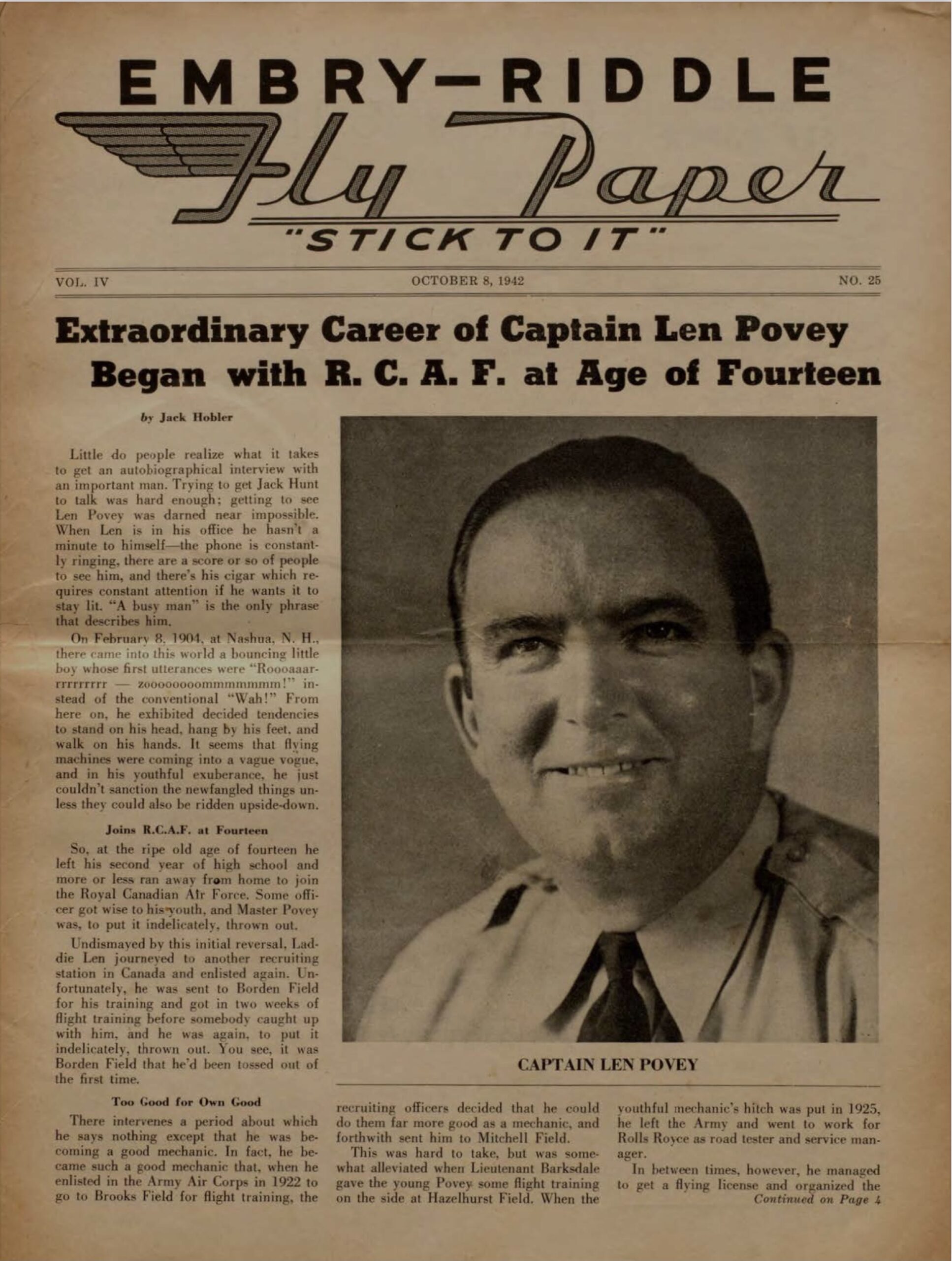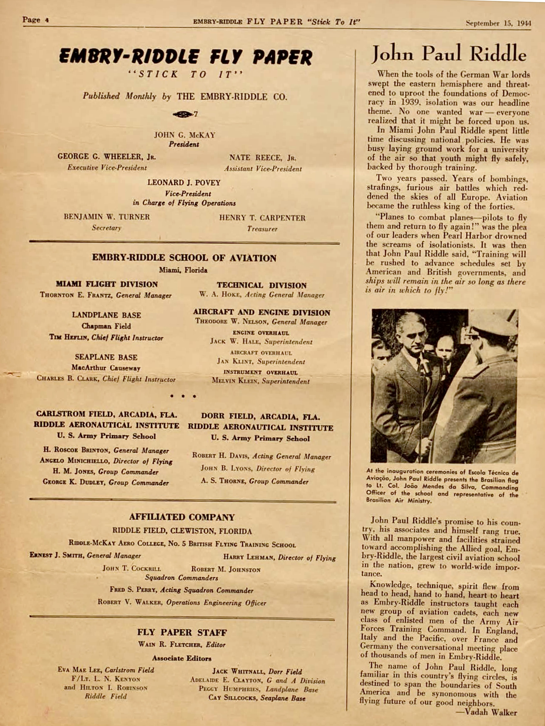 In 1934 he opened a charter seaplane service in Miami and in WW2 operated three schools in Florida and one in Tennessee for US and UK pilots. His role in setting up the Riddle-McKay Aero College for 5BFTS at Clewiston, Florida, is well documented. His vision, beyond the war, was to set up an Aeronautical College and the Embry-Riddle Aeronautical University at Daytona Beach is the fruition of that idea.