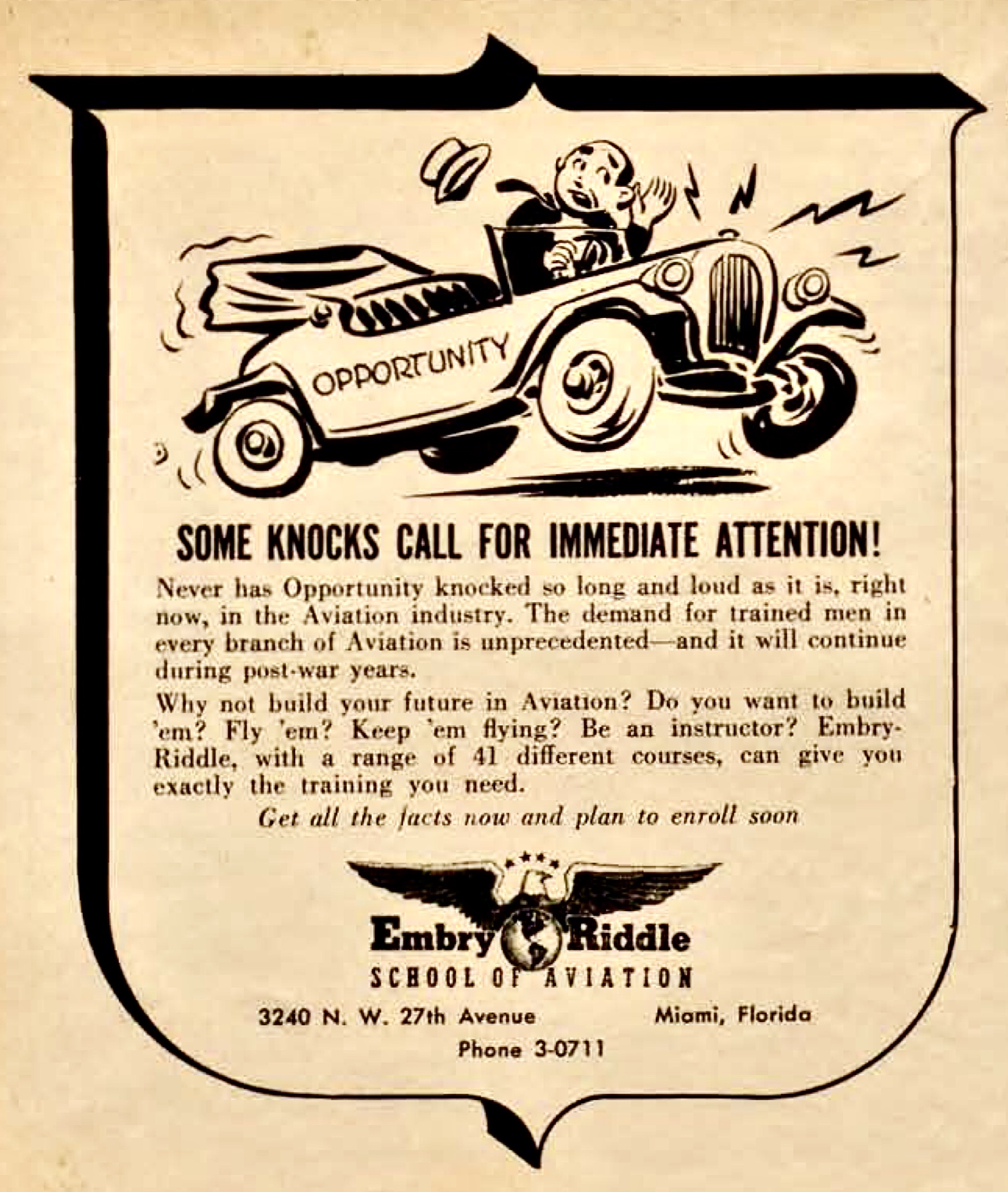 As general manager, Riddle was responsible for selling Waco Aircraft. In 1926 the company opened the Embry-Riddle Flying School. The school’s early pilots were trained for America’s first package express business and in 1927 the school won one of the first Federal air mail contracts. This in turn became part of AVCO, the Aviation Corporation of Delaware, later known as American Airlines. The flying school was a successful venture and the company became known as Embry-Riddle Aviation Corporation.
