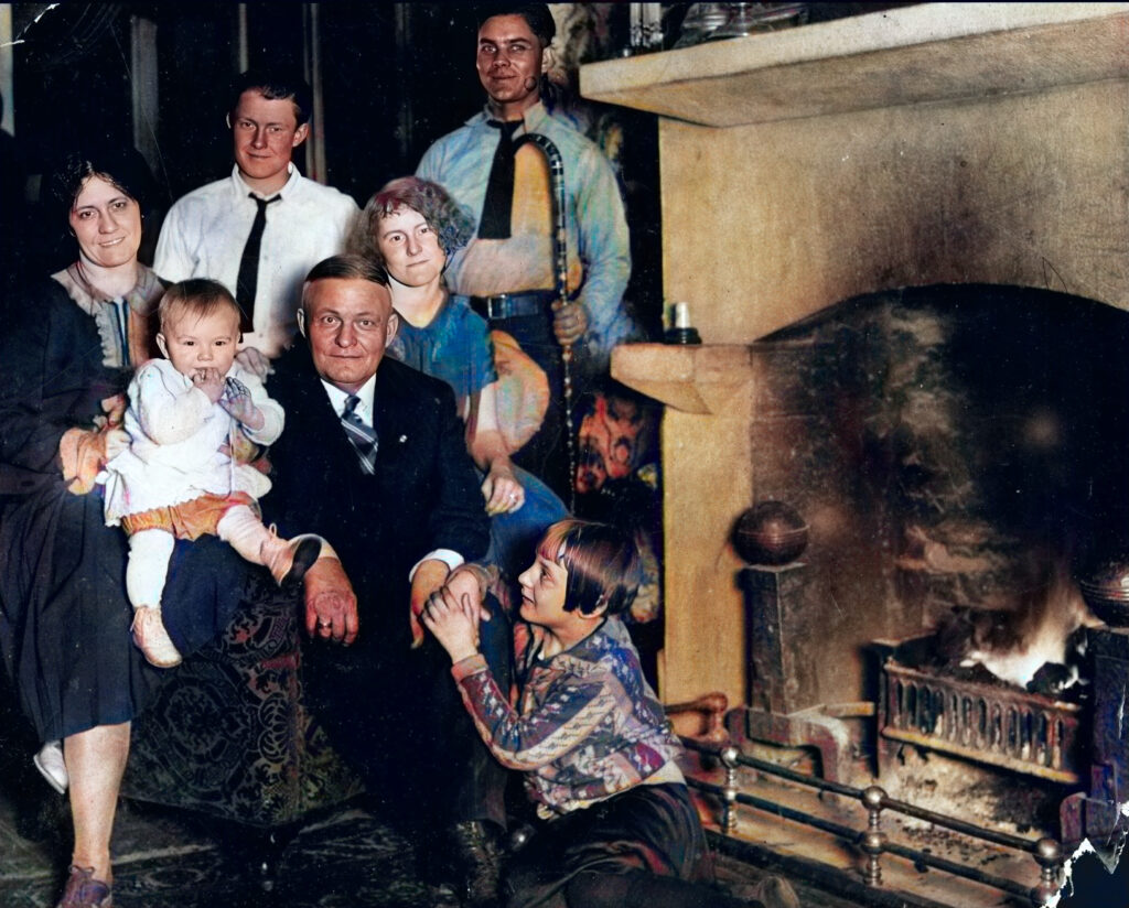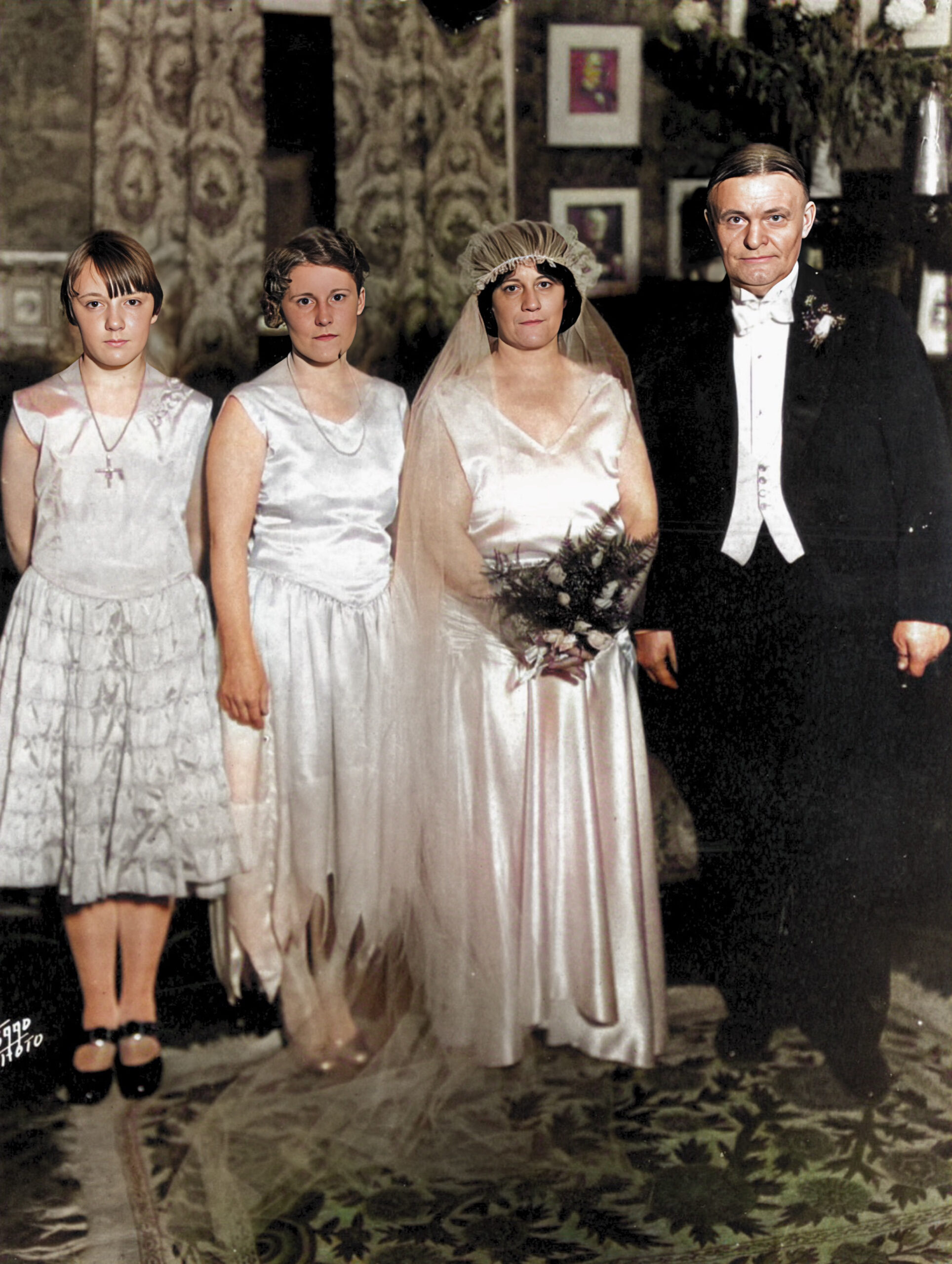 Mr. and Mrs. John W. Langley as they appeared on the celebration of their silver wedding anniversary at their home in Pikeville, Ky. Mrs. Langley is a Congresswoman from the 10th Kentucky Congressional District, having succeeded her husband after he was charged with violation of the prohibition laws. At left are their two daughters, left to right: Miss Susannah Langley and Mrs. Katherine Bentley.