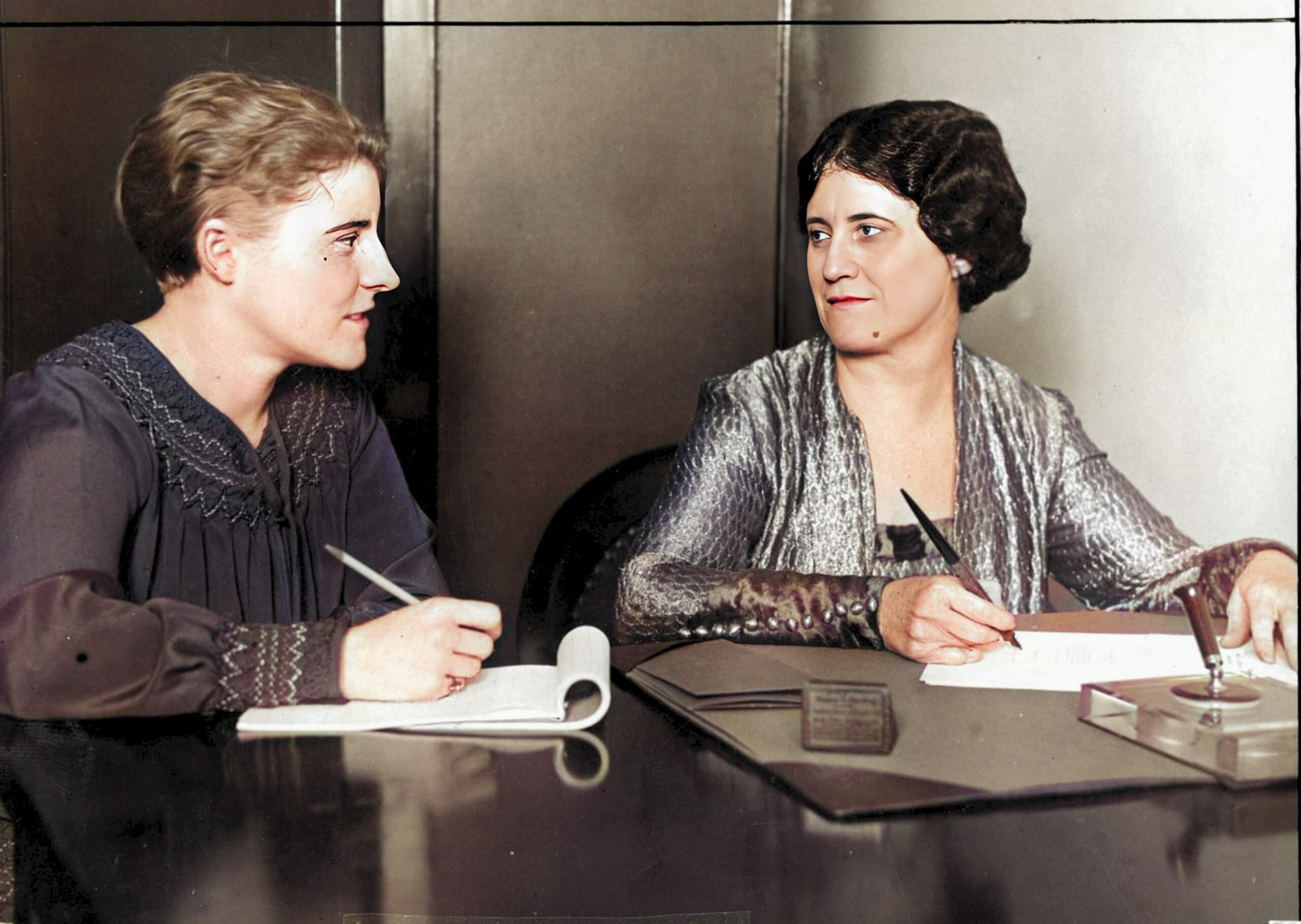 Press photo dated Dec. 5, 1927. MRS KATHERINE LANGLEY, CONGRESSWOMAN FROM KENTUCKY, HAS DAUGHTER SECRETARY. Mrs. Katherine Langley, elected to Congress from Kentucky to succeed her husband, John W. Langley, at her desk in the House Office Building dictating to her daughter, Mrs. Catherine Bentley, who will serve as her secretary.