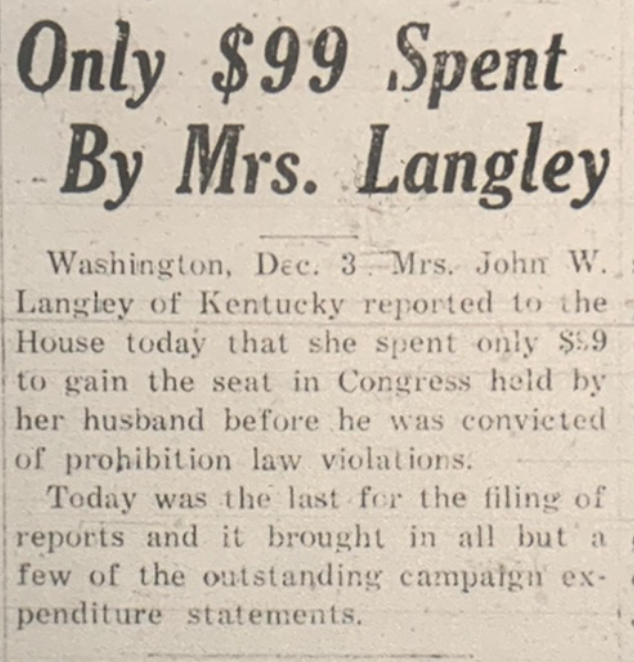 Press photo dated Dec. 7, 1927. “THE LADY FROM KENTUCKY,” An informal photograph of Mrs. Katherine Langley, ‘The lady from Kentucky’, elected to the Seventieth session of Congress to succeed her husband, John W. Langley.