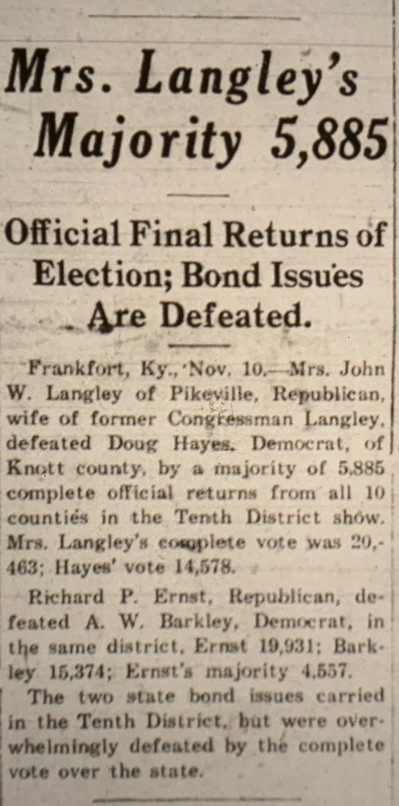 Following John W. Langley’s departure from Congress his dear wife, Katherine Langley, as is well known, was elected in John’s stead in the 10th District, and has carried the ticket to victory once again since then. She has followed faithfully John’s traditions and policies of understanding, loyalty to trust, conscientious honor and devotion to the interests of their beloved state. John Langley boasts with a clear heart and soul that his private and public life, throughout all his thirty-seven consecutive years of service at Washington, was always an open book, that friends and enemies alike can read. Indeed, John Langley felt that little more was needed here in that regard, than the bare chronology of his legislative acts.