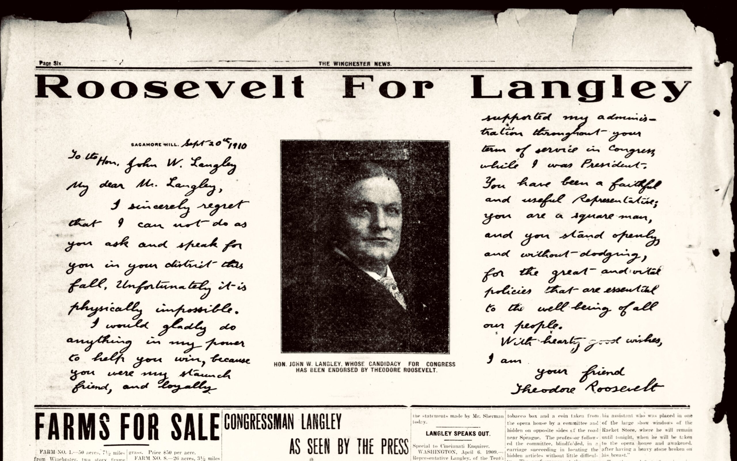 Not long after John Langley was first elected to Congress in 1906 and sworn in March of 1907, perhaps the most cordial congratulatory message he received was from his dear old friend Teddy Roosevelt. John often went to the White House to see him on official business and every time the president caught sight of him, no matter how busy or who was present, he would invariably stop to address John with his favorite salutation, “Hello, Kaintuck (Langley)!” On one occasion when he was ready to receive a delegation John accompanied, Roosevelt came smilingly to the door exclaiming, “Now you Kentuckians, please leave your side arms outside before you come in.” This remark was overheard and given rather wide publicity by the newspapermen.