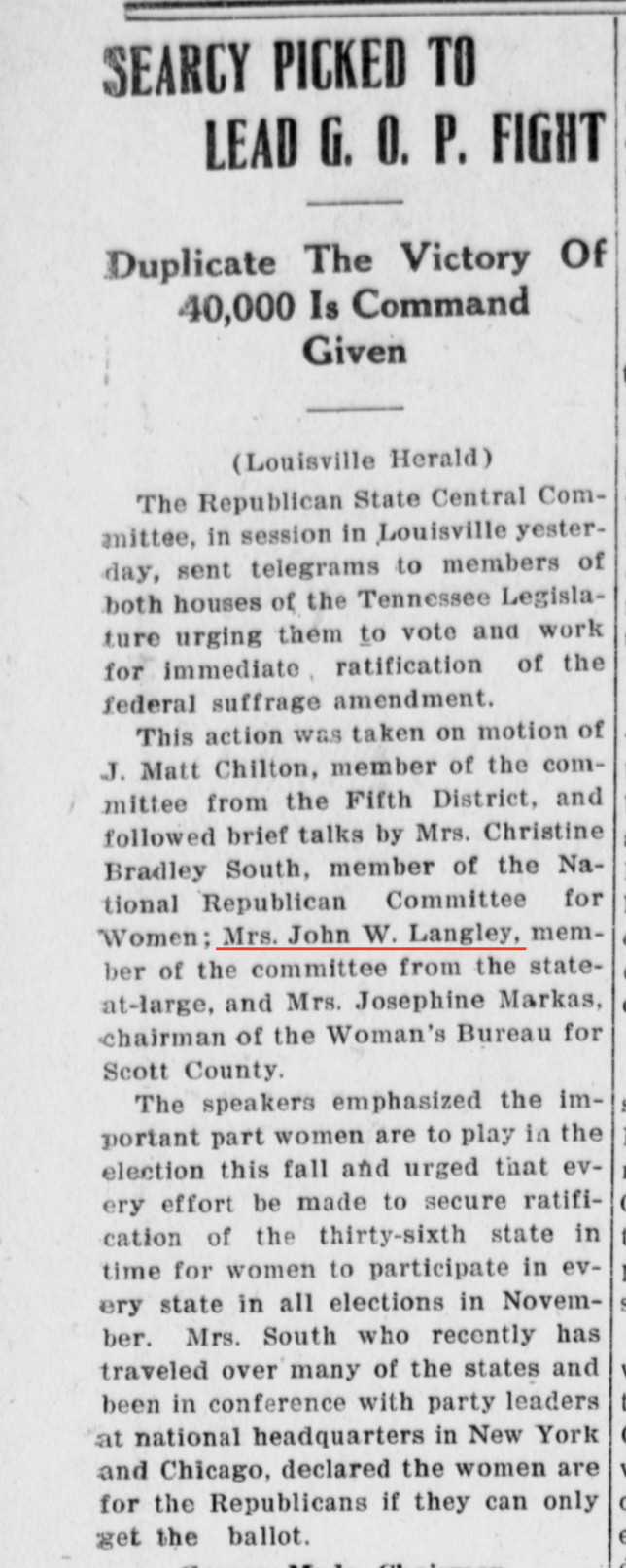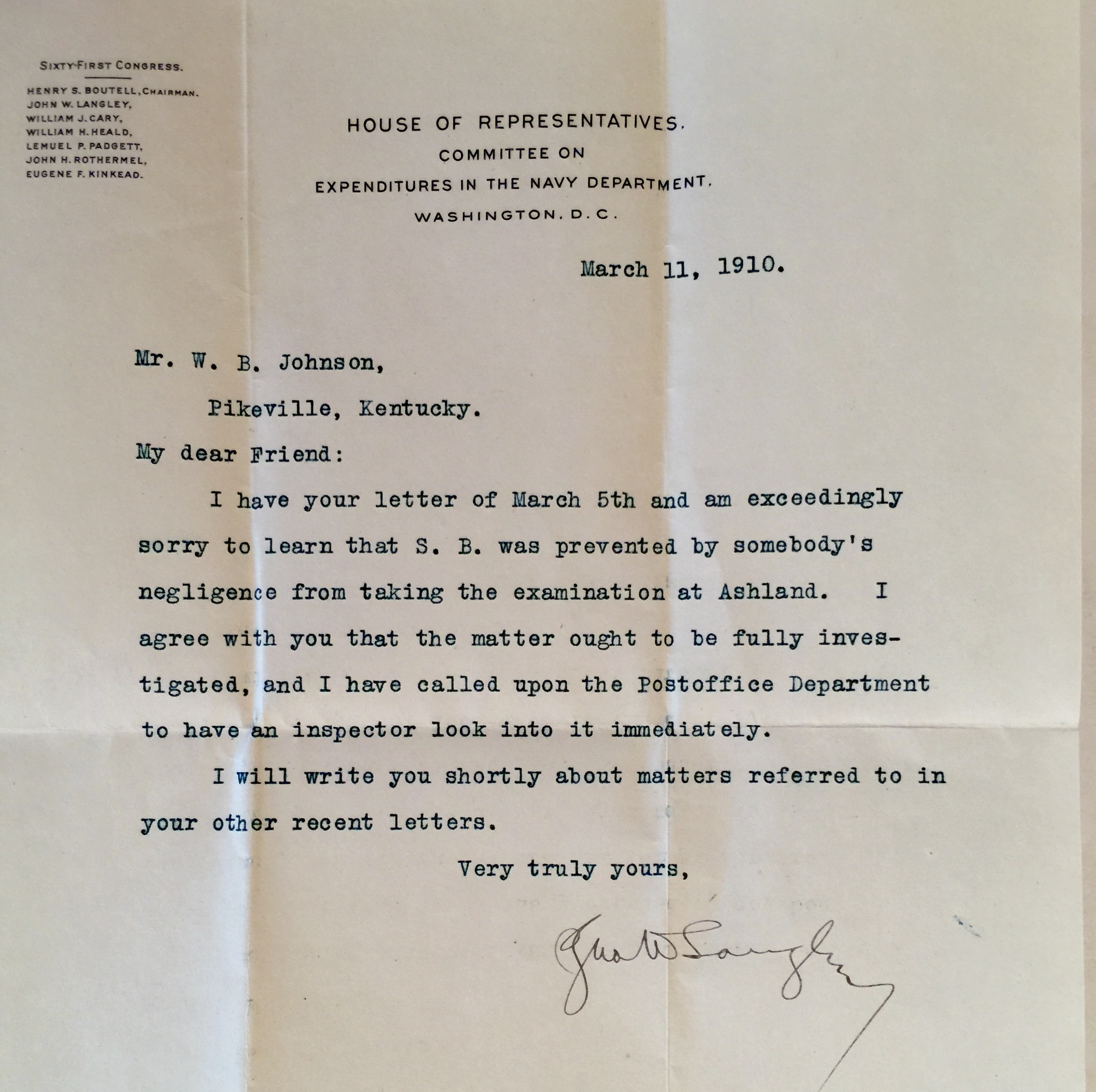 I therefore give you this information, hoping that you may act upon same in such a way that it will be a help to Mr. Langley and that he be relieved of this strain put upon him by some faction for some reason to his detriment as well as to the citizenship of the Tenth Congressional District of Kentucky, and that you may, and will, use every honorable means to assist Mr. Langley in clearing his good name as we really believe he has and will be.