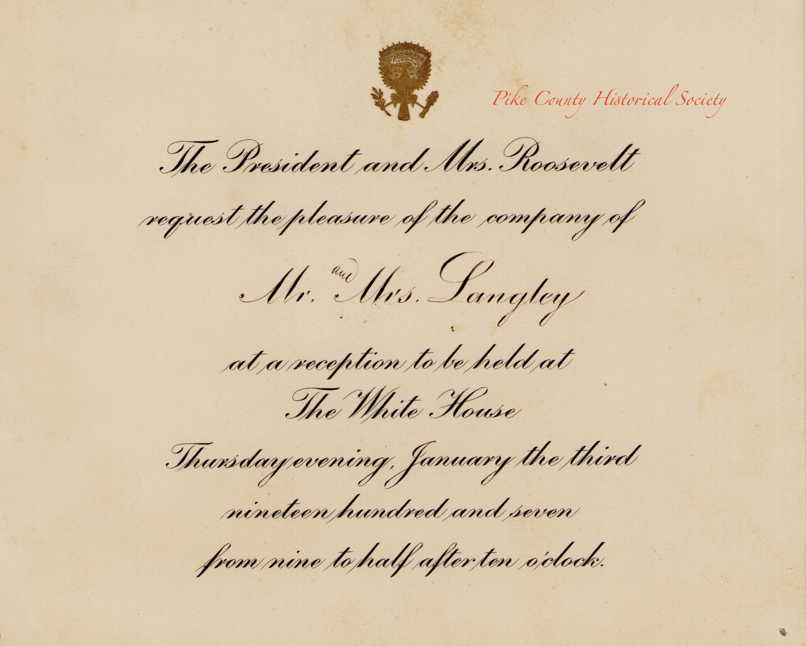 It is now a matter of political history that during that night there was a long-distance conversation between Senator Hanna and the White House when it was agreed that the convention was almost unanimously for Teddy’s nomination. When John reached his seat the next morning, the Governor was already surrounded by friends tendering their congratulations. John extended his hand to the governor. He held it silently for a moment and in his characteristic manner, exclaimed: “Well, old man, you struck it right after all.” Before the roll call and the Vice-Presidential nomination were concluded, some of the members decided to catch the earliest train for Washington. Before leaving, John hopped across the aisle, seized Teddy’s hand and said, “Well, Governor, you will be elected beyond a doubt, and the next time we’ll run you for President.” Roosevelt made no response, but extracting from his pocket his convention ticket, and writing something on it, said: “Here, give this to your father.” Across the top he had written in pencil: “Theodore Roosevelt.” That card has always been a treasured heritage of the Langley family.