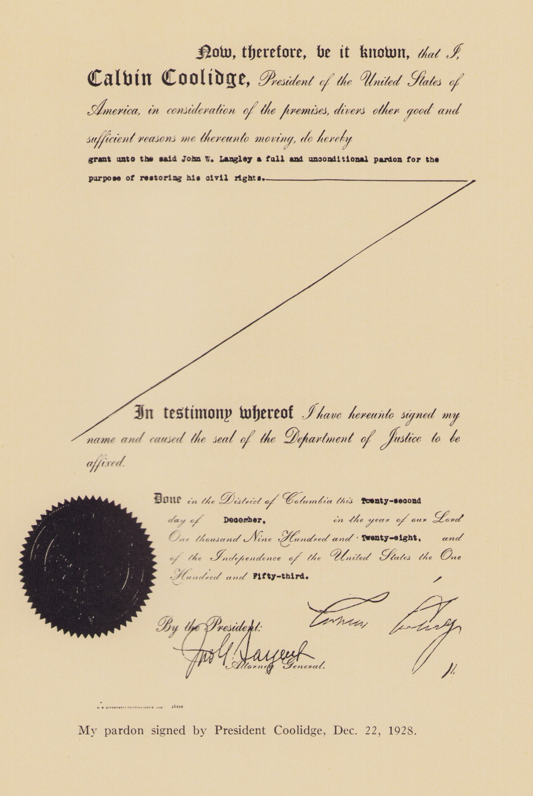 His wife Katherine, then ran for his seat and won in the next election, declaring that her husband had been the victim of a conspiracy and resolved to clear his name. She also won the next election. Langley was paroled from the Atlanta Penitentiary in 1929, and with Katherine’s intervention, President Calvin Coolidge granted John Langley a pardon on December 20, 1928. He sent out a Christmas message to his wife’s constituents and a week later declared his intention to run for office (even though the President had stipulated his clemency was predicated on never running for office again).