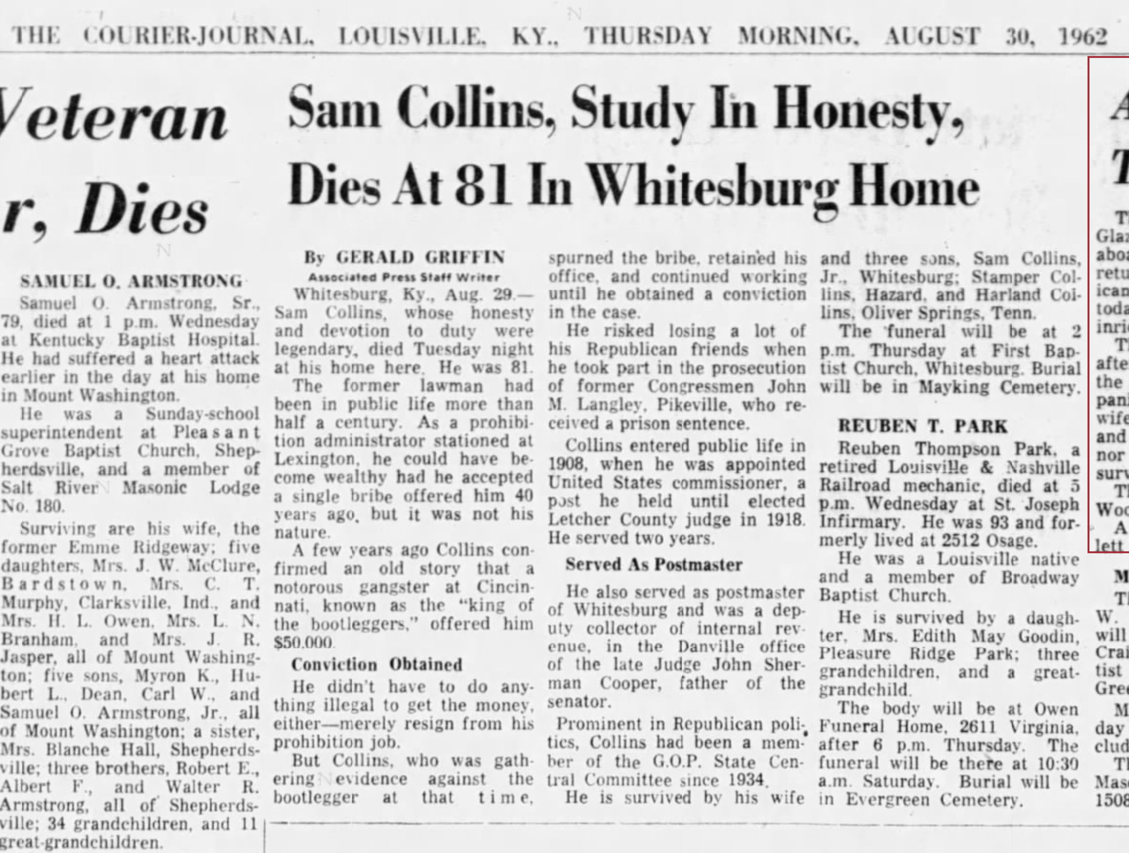 Samuel Collins born in Letcher County, Kentucky, on October 9, 1880. He died August 28, 1962, of Prostate Cancer. Sam Collins was married to Jessie Stamper Collins born in Howard County, Texas, December 15, 1897, and died Oct 25, 1985, in Whitesburg. In 1910 Samuel Collins was shown live with IB Fields as boarder, working as Deputy Collector under Commissioner S.E. Baker. He was appointed Postmaster in Whitesburg May 25, 1903.