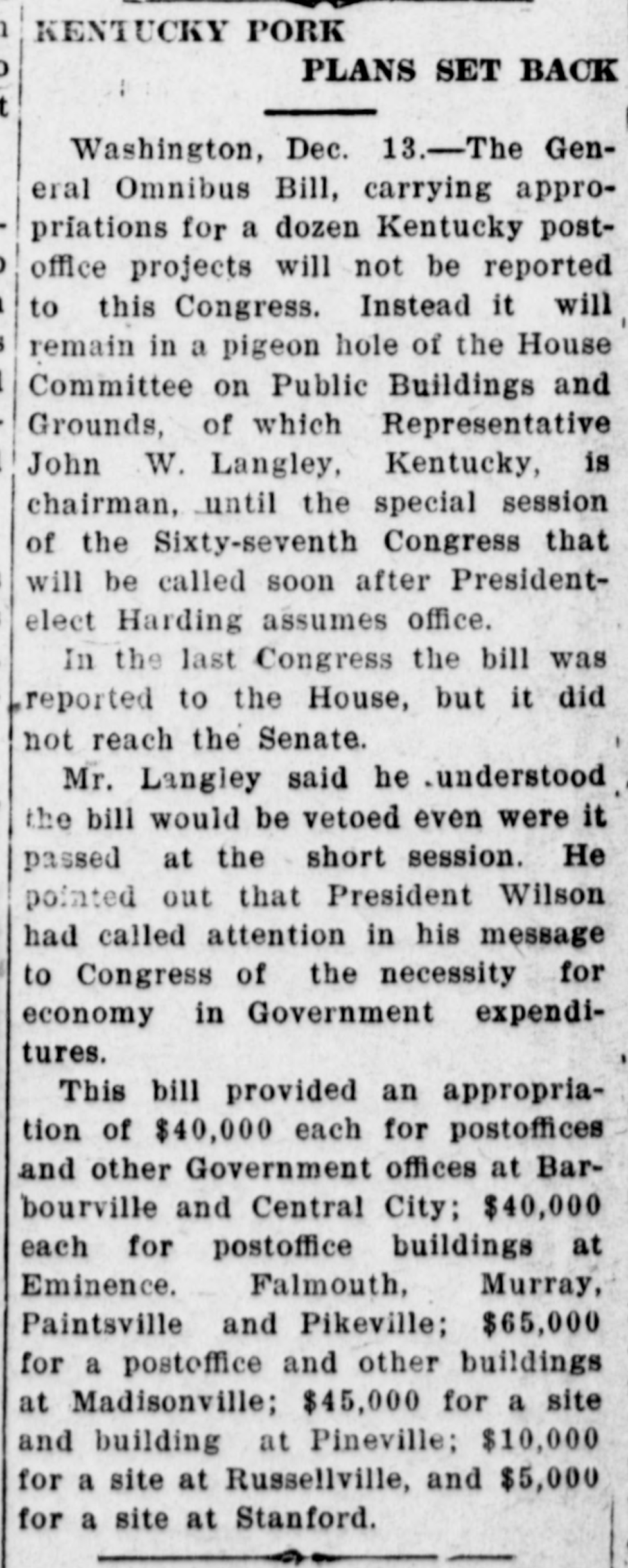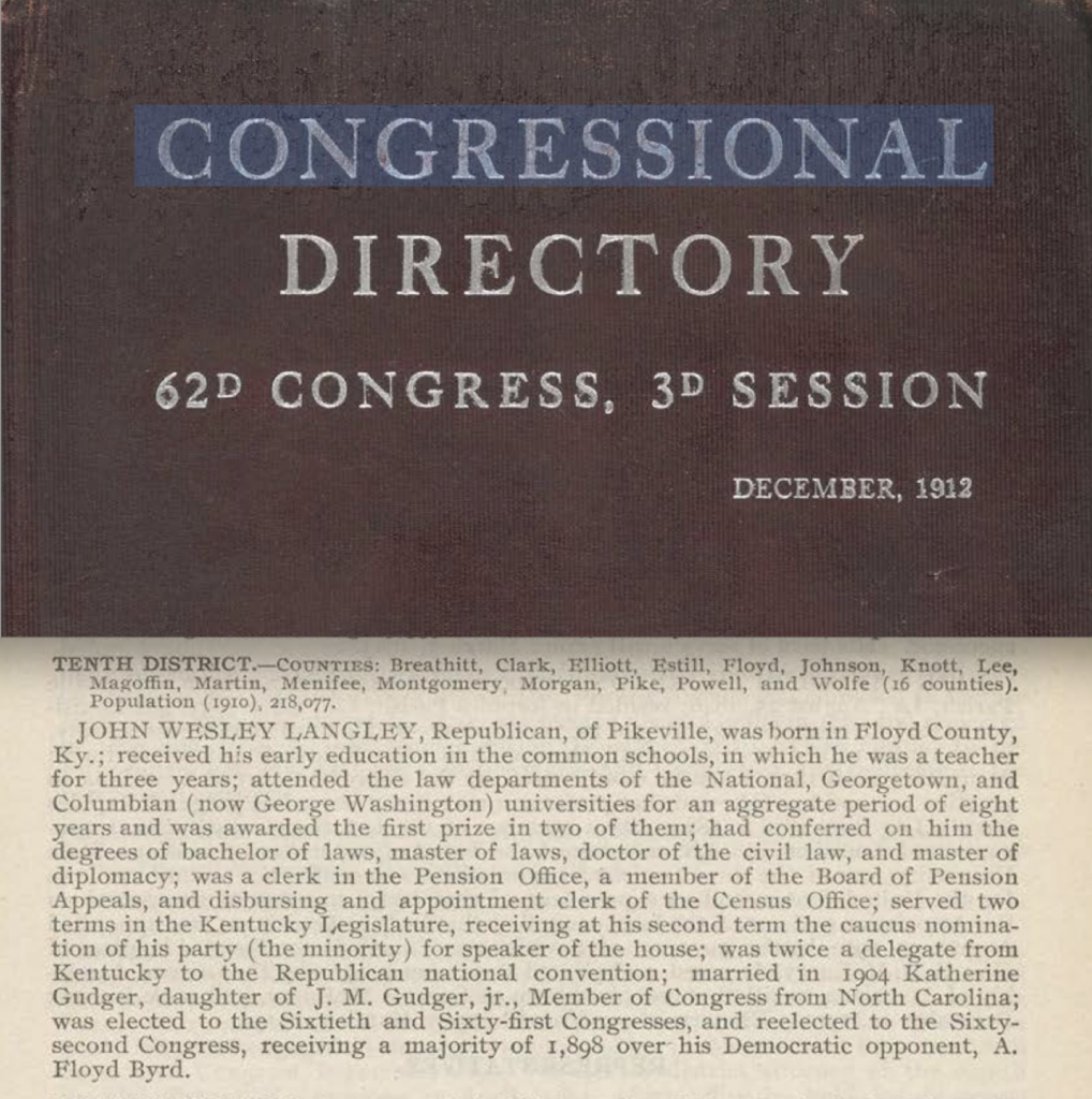 John W. Langley was elected to the U.S. House of Representative, serving in the Kentucky 10th, on March 4, 1907, as a Republican to the Sixtieth, and to the nine succeeding Congresses where he became known as “Pork Barrel John.” He served as chairman of the Committee on Public Buildings and Grounds (Sixty-sixth through Sixty-eighth Congresses).