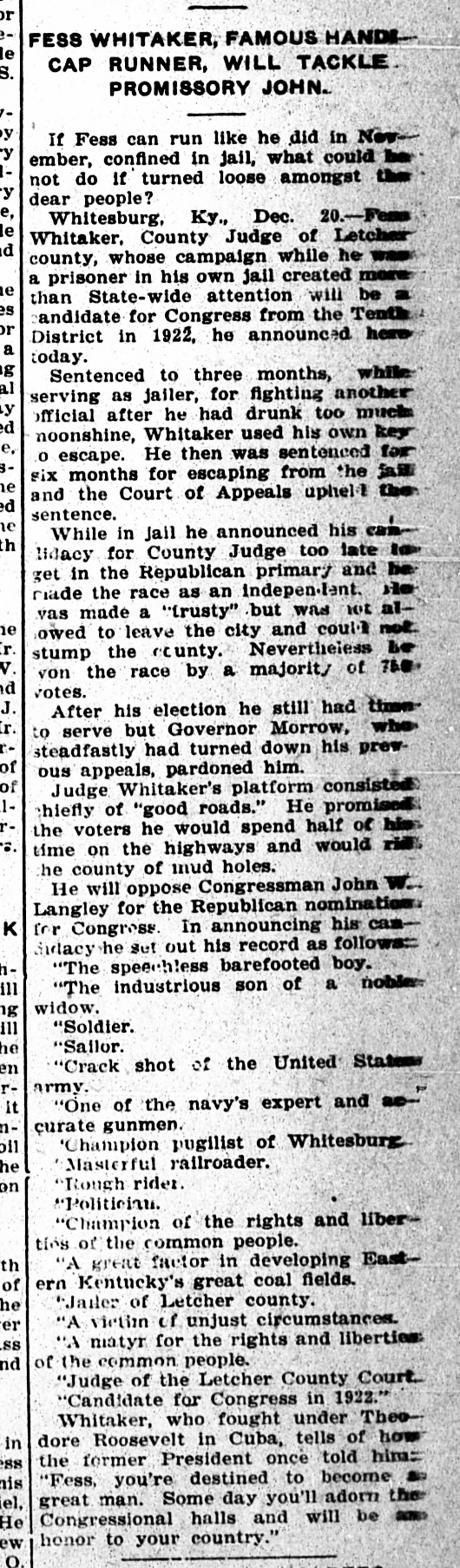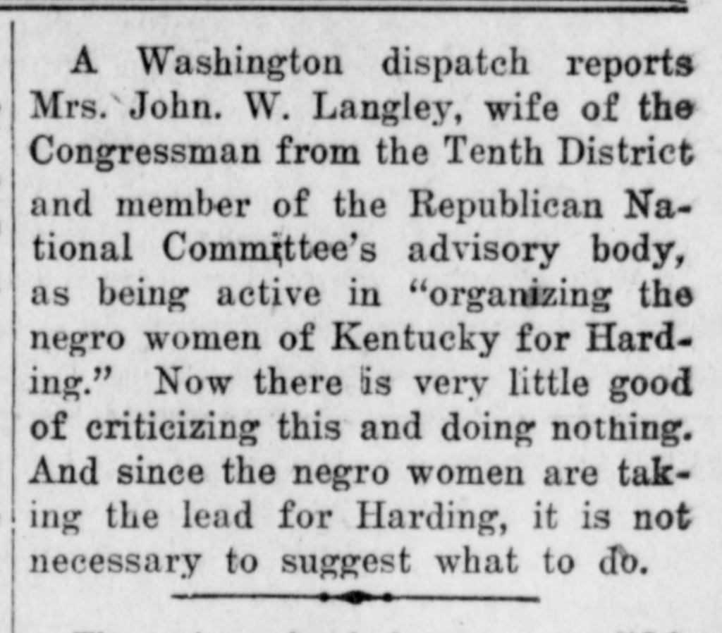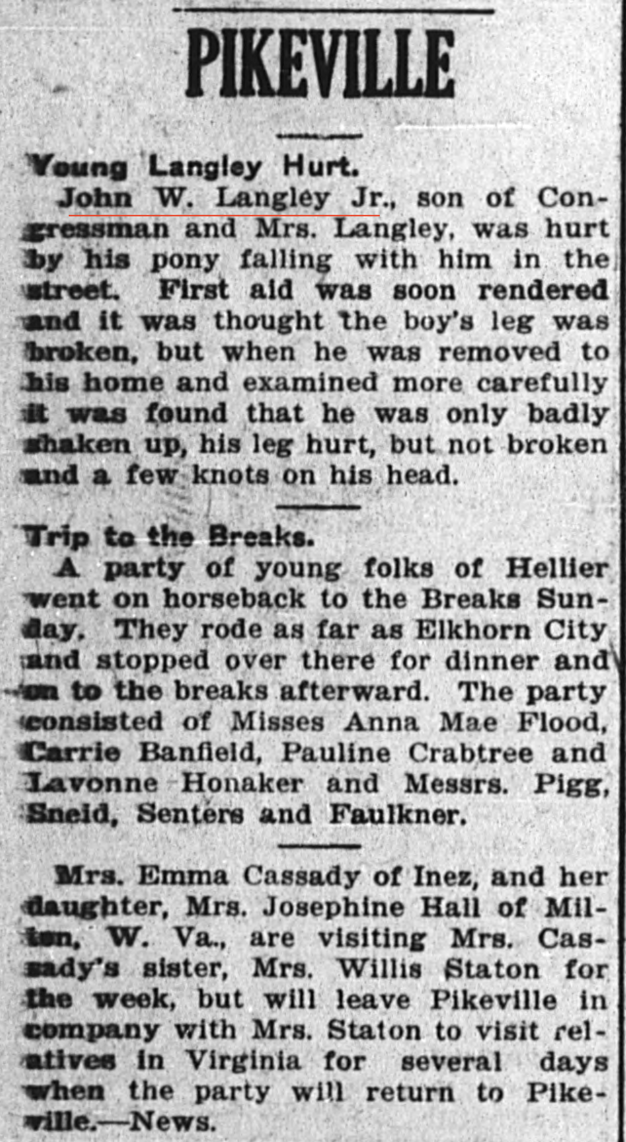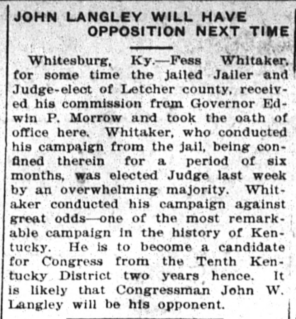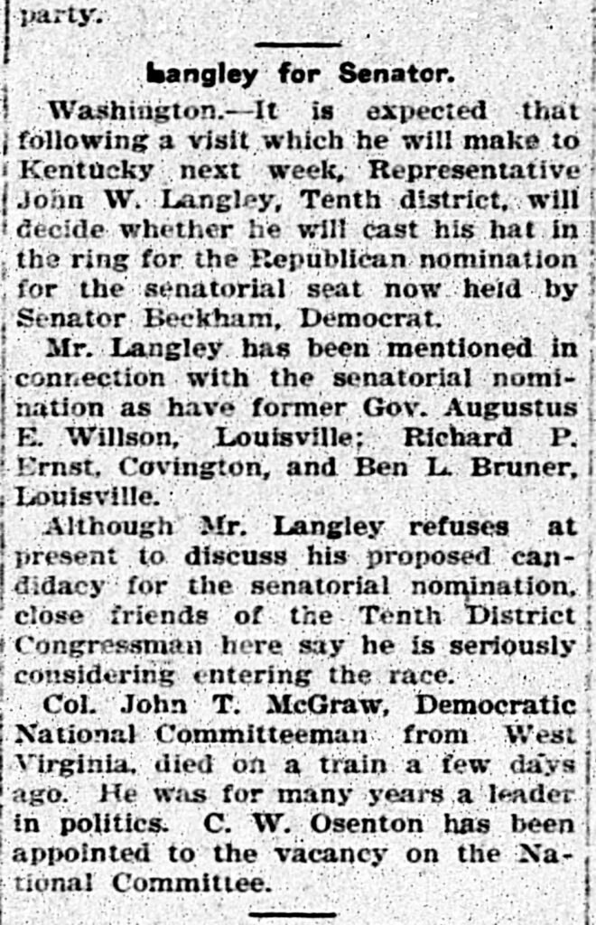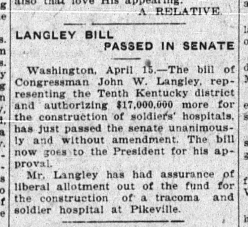 John W. Langley, Republican candidate for Congress in the 10th district, was rapidly gaining ground, and his election seems practically assured. His opponent, F. A. Hopkins, had become personal in his speeches and taken Mr. Langley to task about his kinsfolk and his plea for their support. Hopkins also charged him with taking care of his skin in a political way, and also having a post office established for his afflicted father. In order to show the reason for Hopkins’ unwarranted ridicule of Langley‘s relatives and his appeal for their suffrage, we provide the following facts: