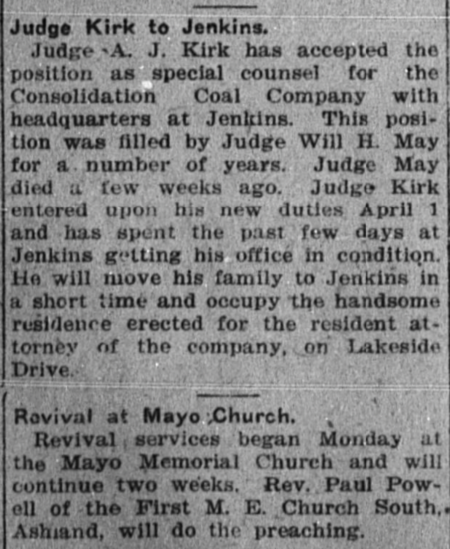 Consolidation Coal Company had a company home reserved for May & May firm/ called the W.H. May’s home at the Jenkins Lakeside.