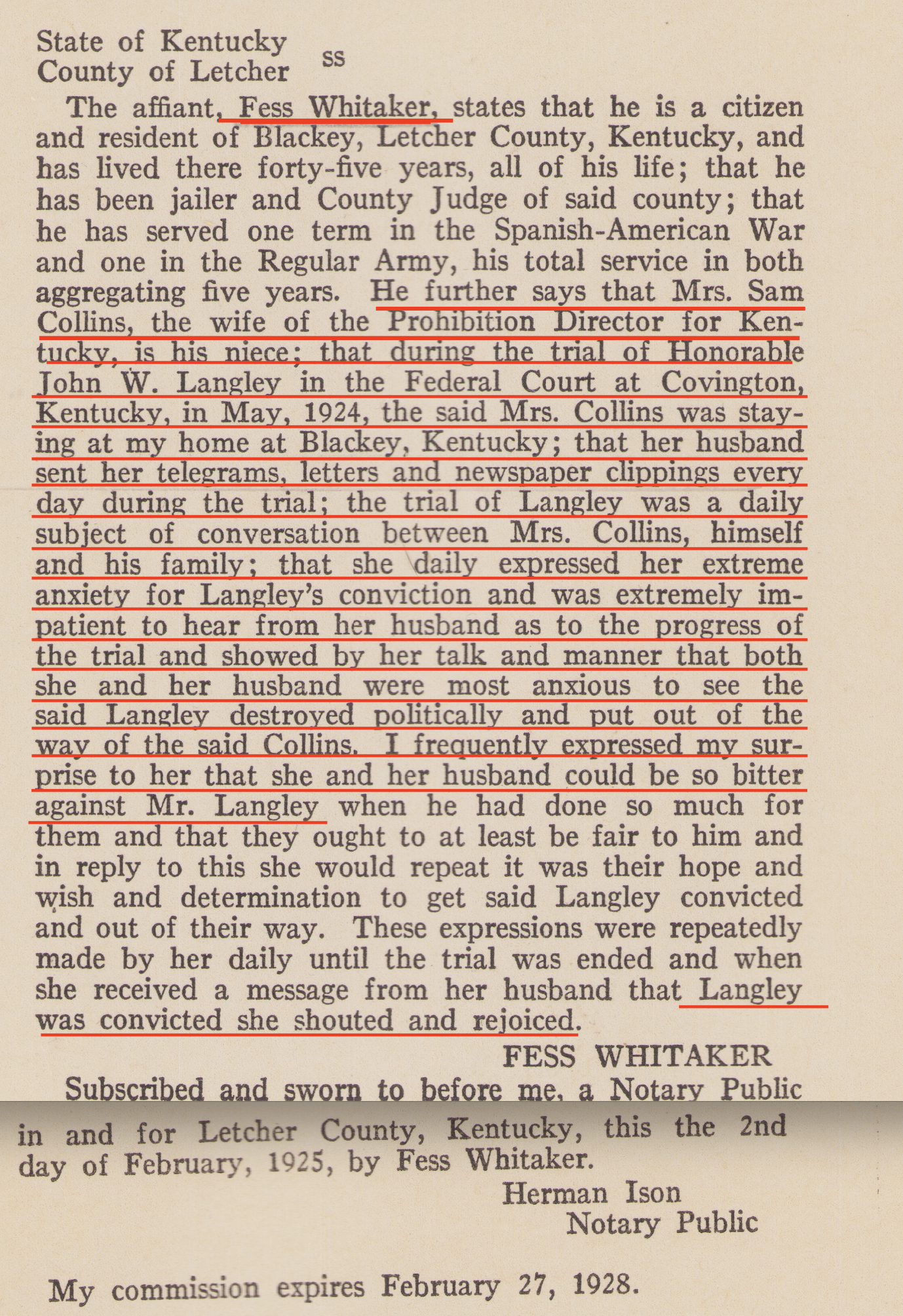 Personally, from here say and general information gathered before this matter connecting Mr. Langley to it came up, I learned from men high in the council of the Republican Party that they were not satisfied with Sam Collins as Enforcement Officer; why they were not I do not know nor can I imagine, because Collins, in his official capacity in office or out, has always been an honorable straight-forward gentleman and is held in the highest esteem by his friends. In summing up, the evidence has not been considered in any way, shape or form; therefore, as stated above, you will find the people of the Tenth District have come to the conclusion that Mr. Langley’s evidence in his behalf was not considered and the only evidence considered was that of Mortimer, and that he was convicted upon his evidence, which is wrong, and they do not believe that he is guilty. Langley is progressive, has worked hard for the Tenth District and Kentucky; he is satisfactory to the business interests of the district and particularly so to the coal industry, which is by far the largest industry in the district.