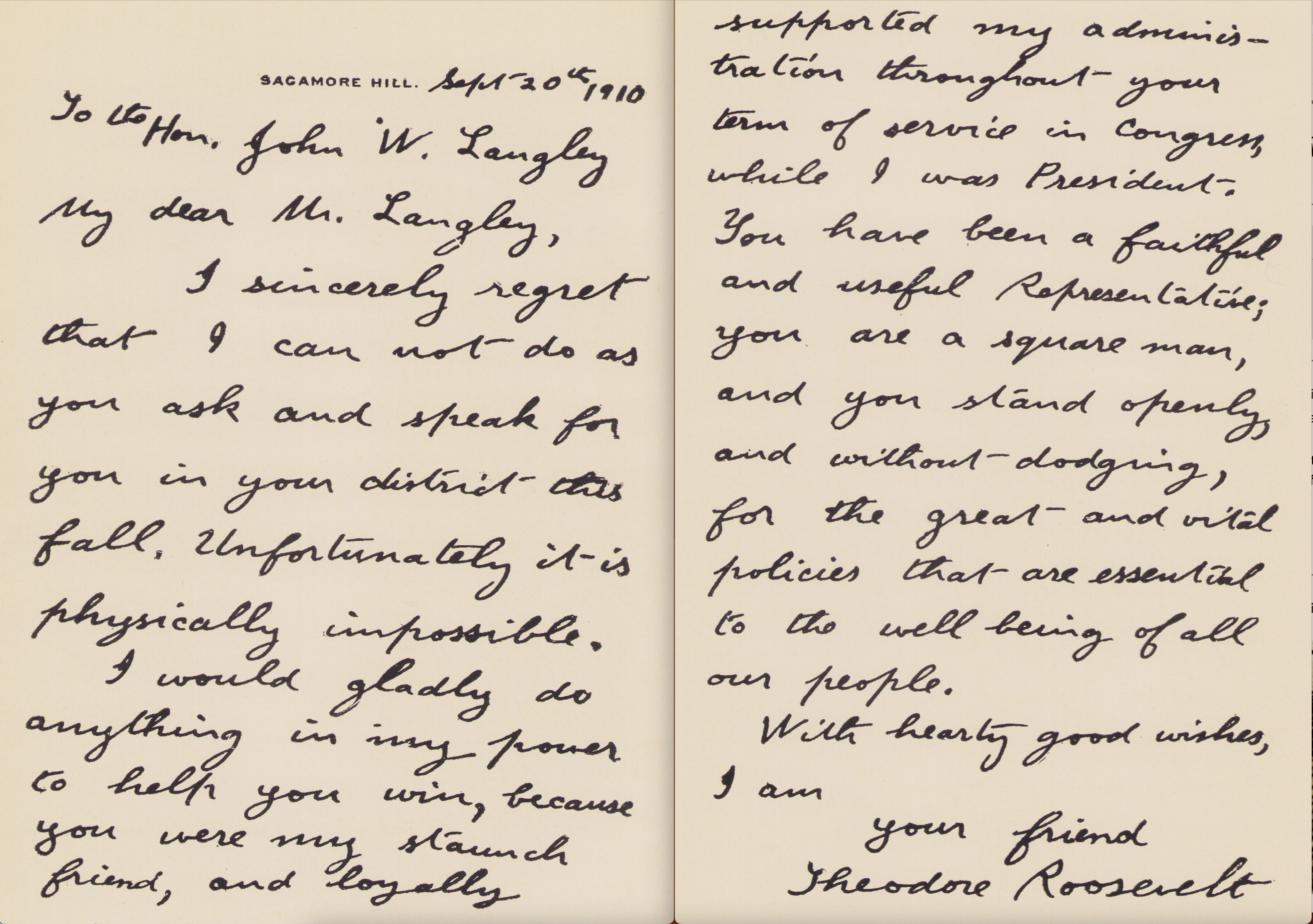 Roosevelt endorsement for John W Langley, Sept 20, 1910