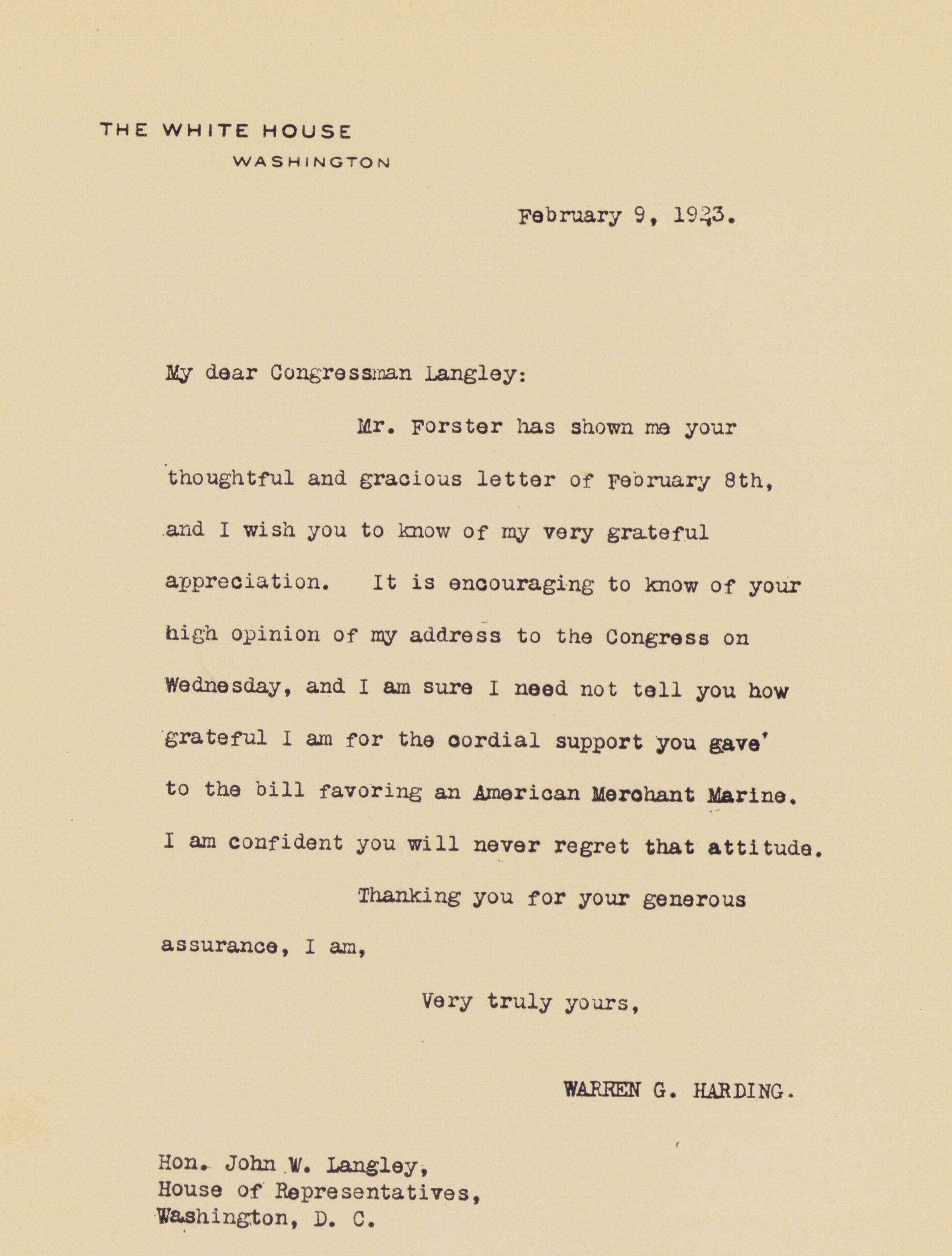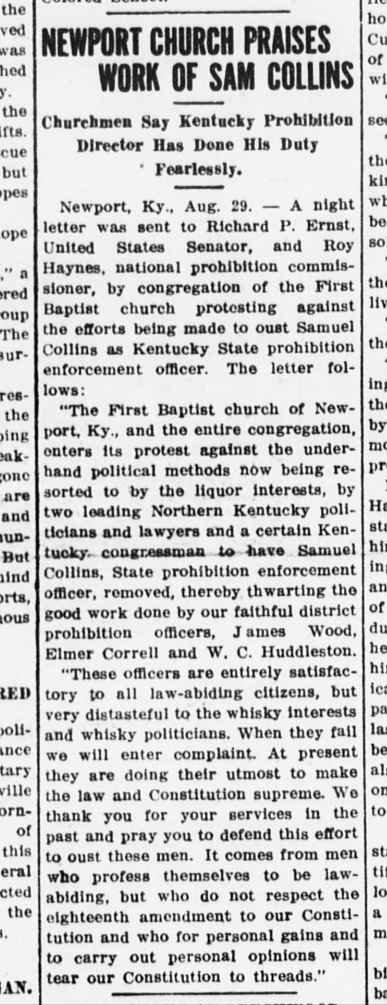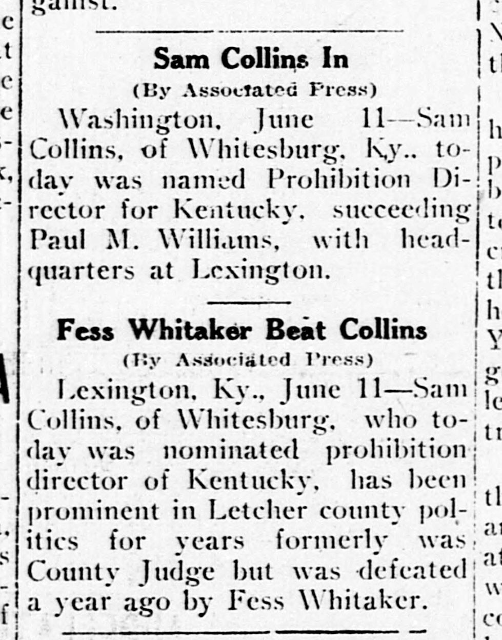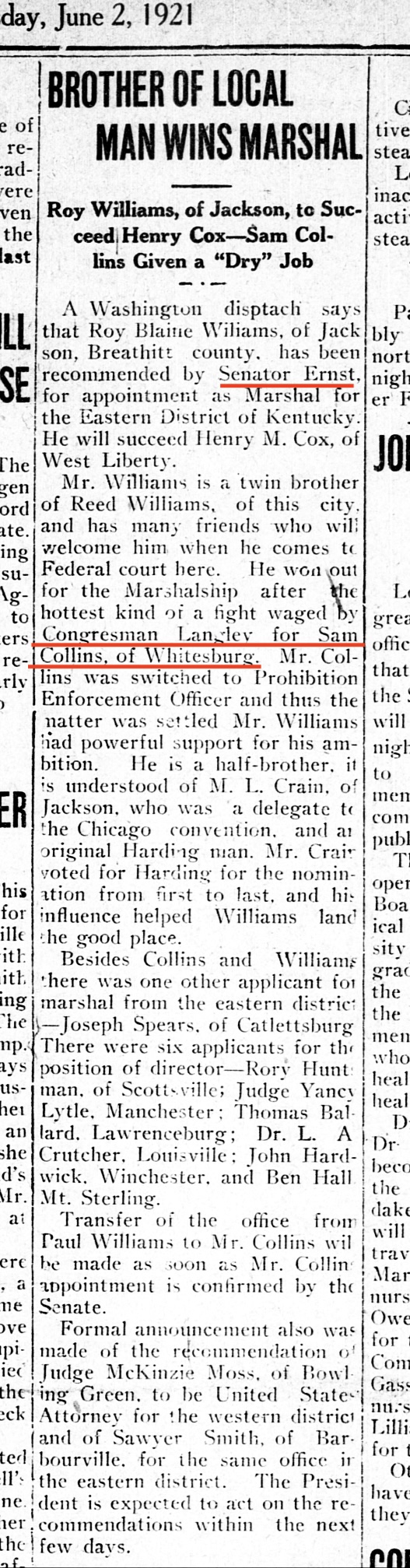 Here John was a little ahead of his story. On a visit made to President Harding on May 28, 1921, he urged Samuel Collins’ appointment as Marshal. The President’s reply was that there existed a tentative arrangement to give the Marshalship to another, adding that the only man who might be able to change the post to Samuel Collins was Col. A. T. Hert, and suggested that John go and see him. This John did, repeating the President’s words. It was then that Col. A.T. Hert suggested that it might be arranged to confer upon Samuel Collins the post of Prohibition Director in lieu of the Marshalship. John replied that he would have to wire Collins to see if that would be satisfactory to him, which John did immediately. Collins notified John that this job would be entirely satisfactory to him, adding that he did not want him embarrassed in any way about it, as Langley had been the best friend he ever had in the whole Kentucky crowd.