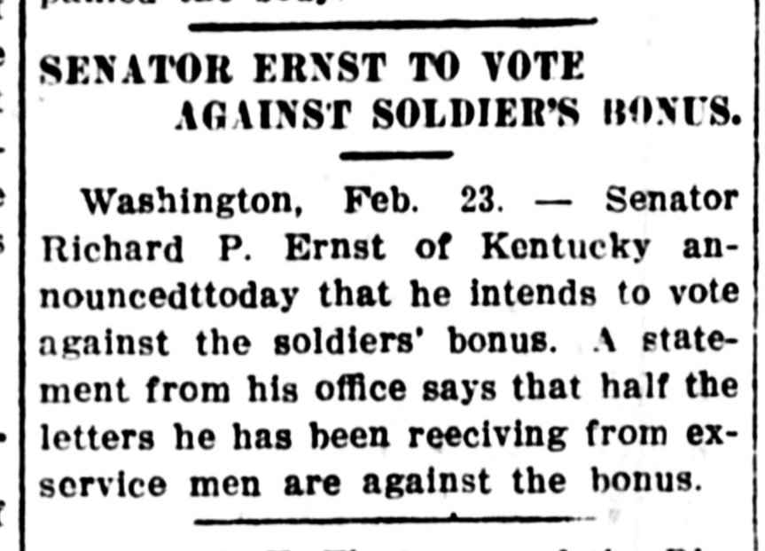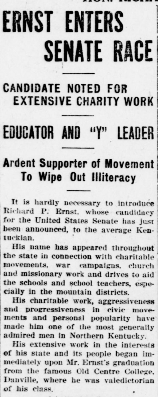 The second U.S. Senator threatened by Langley’s rumors for bid for Kentucky U.S. Senate was Richard P. Ernst, up for re-election 1927. A life-long resident of Covington and former United States Senator. Richard Pretlow Ernst was born on February 28, 1858, in Covington. His parents were William Ernst and Sarah Butler Ernst. William Ernst was a past president of the Northern Bank of Kentucky and president of the Kentucky Central Railroad. Richard Pretlow Ernst was educated in the public schools of Covington and at the Chickering Academy in Cincinnati (graduated in 1874). Ernst earned a bachelor’s degree from Centre College in Danville, Kentucky in 1878. He received a law degree from the University of Cincinnati in 1880. That same year, he began practicing law in Covington and Cincinnati. He was a member of the Firm of Ernst, Cassatt & Cottle. Ernst married Susan Bent in 1886. The couple had two children, William Ernst and Sarah Ernst Darnell. Richard Ernst’s first venture into politics occurred in 1888, when he was elected to the Covington City Commission. He served in this position until 1892. In 1896, Ernst ran unsuccessfully for a seat in the United States Senate on the Republican ticket. He successfully ran for the U.S. Senate in 1920. He served in that position from March 4, 1921, to March 3, 1927. His bid for re-election in 1926 failed. Ernst returned to Covington in 1927 and resumed his law practice. He was active in many fraternal and professional groups in the Greater Cincinnati area. Ernst was chairman of the board of directors of Liberty National Bank in Covington; a member of the Hamilton County and Cincinnati Bar Associations; and a member of the Queen City Club of Cincinnati, the Covington Industrial Club and a 32nd degree mason. Ernst also served on the boards of Centre College, Danville; the University of Kentucky in Lexington; Pike County College, Pikeville, Kentucky and Western College for Women at Oxford, Ohio. Ernst was a dedicated member of the First Presbyterian Church of Covington.