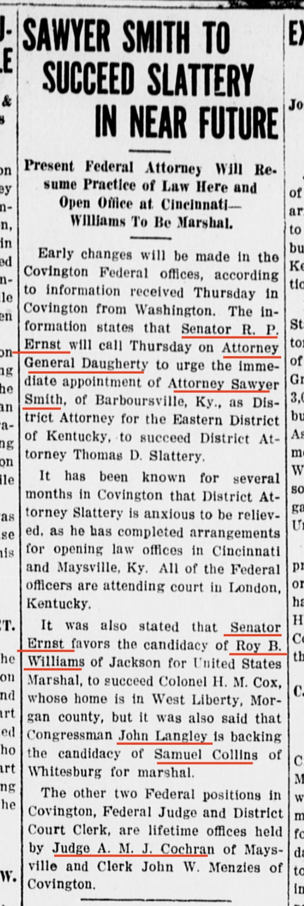 We return to the subject of the Marshalship by recounting John’s close acquaintance with then Senator Harding as well as Harry Daugherty, his campaign manager, so that John may explain why the Marshalship did not pass to Samuel Collins. As a matter of fact, the half-brother of the man who finally got the job was a life-long friend of John’s, and knowing his personal relations with Harding and Daugherty had asked John at Chicago to give him a personal note of introduction to both of these gentlemen. Unaware that Langley had already promised the position to Samuel Collins, he got a promise for his half-brother Roy Williams. Langley added that the individual who secured the promise was a district delegate to the convention and turned out to be the “original Harding man” of the Kentucky delegation, The promise he secured compelled John at the last moment to accept for Collins, subject to his approval, the post of Prohibition Director for Kentucky.
