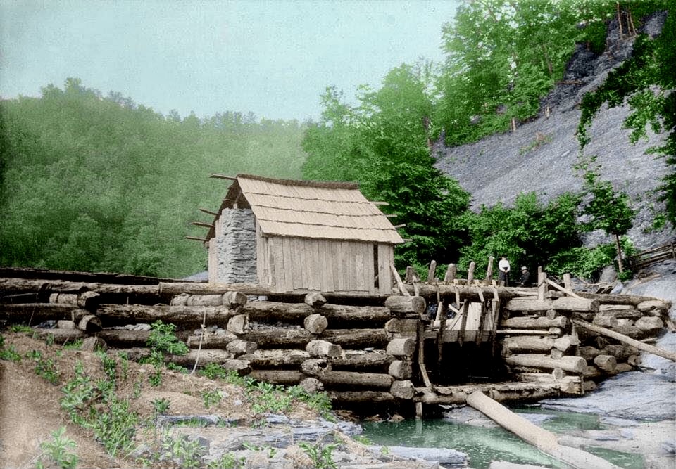 The John May Splash Dam standing ready for nearly a hundred thousand trees floating the Spring and Winter Tides on Shelby Creek. This Splash / Mill Dam was located between present day Willie & Pearl Riddle Farm and Branham Heights above Shelbiana, Kentucky. Just out in front of the Splash Dam you can find evidence of the Ole Mill Dam, gray faded logs bottom left side of Shelby Creek.
