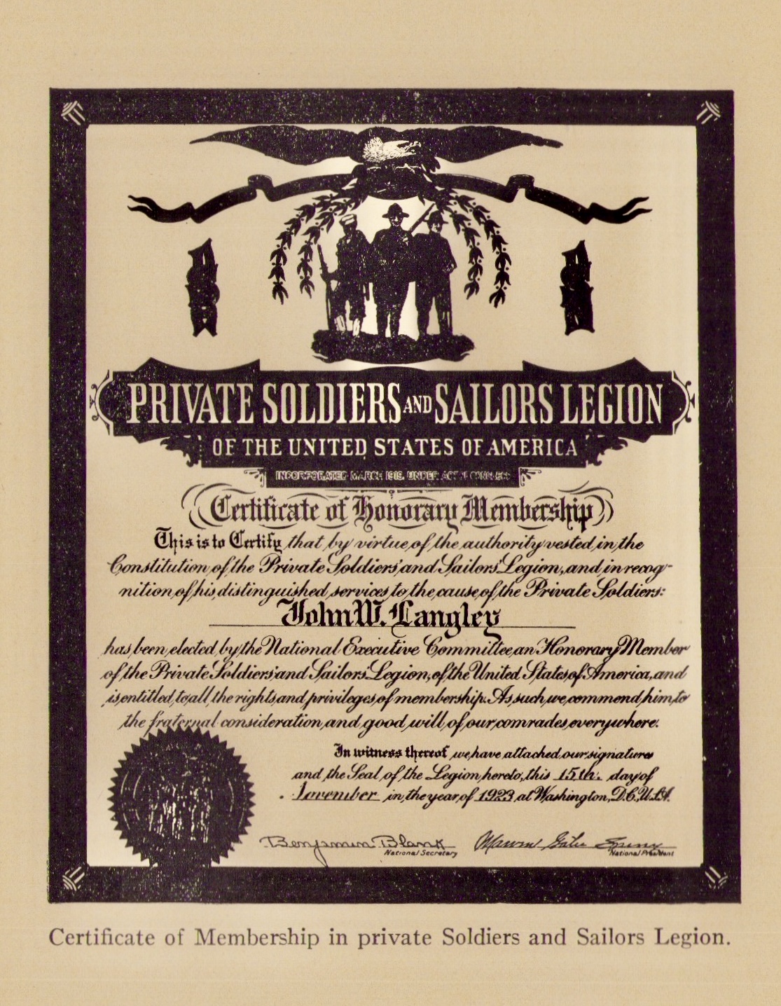 (Washington, D.C., May 26, 1910.) Hon. John W. Langley, of Kentucky, who is now serving his second term in Congress, has a final record of friendliness to the veterans. He was born in Floyd County, Kentucky, received his education there, and then began teaching school. He studied law and received the prize in two universities, and the degrees of Bachelor of Law, Master of Law, Dr. of Civil Law and Master of Diplomacy. He next excepted a position in the Pension Bureau and became a member of the Board of Appeals but left to become Disbursing and Appointment Clerk of Census Office. He also served a term in the Kentucky State Legislature and was twice delegate from Kentucky to the Republican Nashville convention. Therefore, he is an unusual well equipped all around, man, familiar with public business, and a valuable representative both for his abilities in Congress and his capacity to serve his constituents.